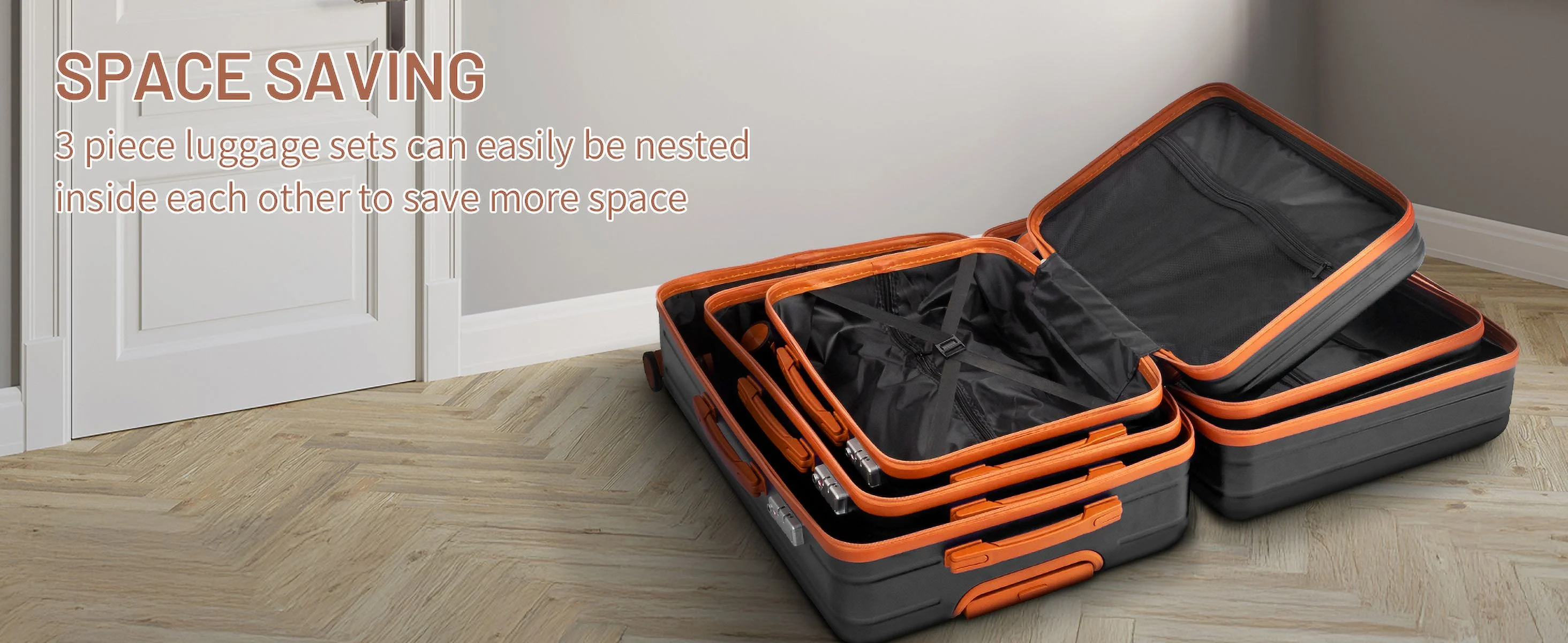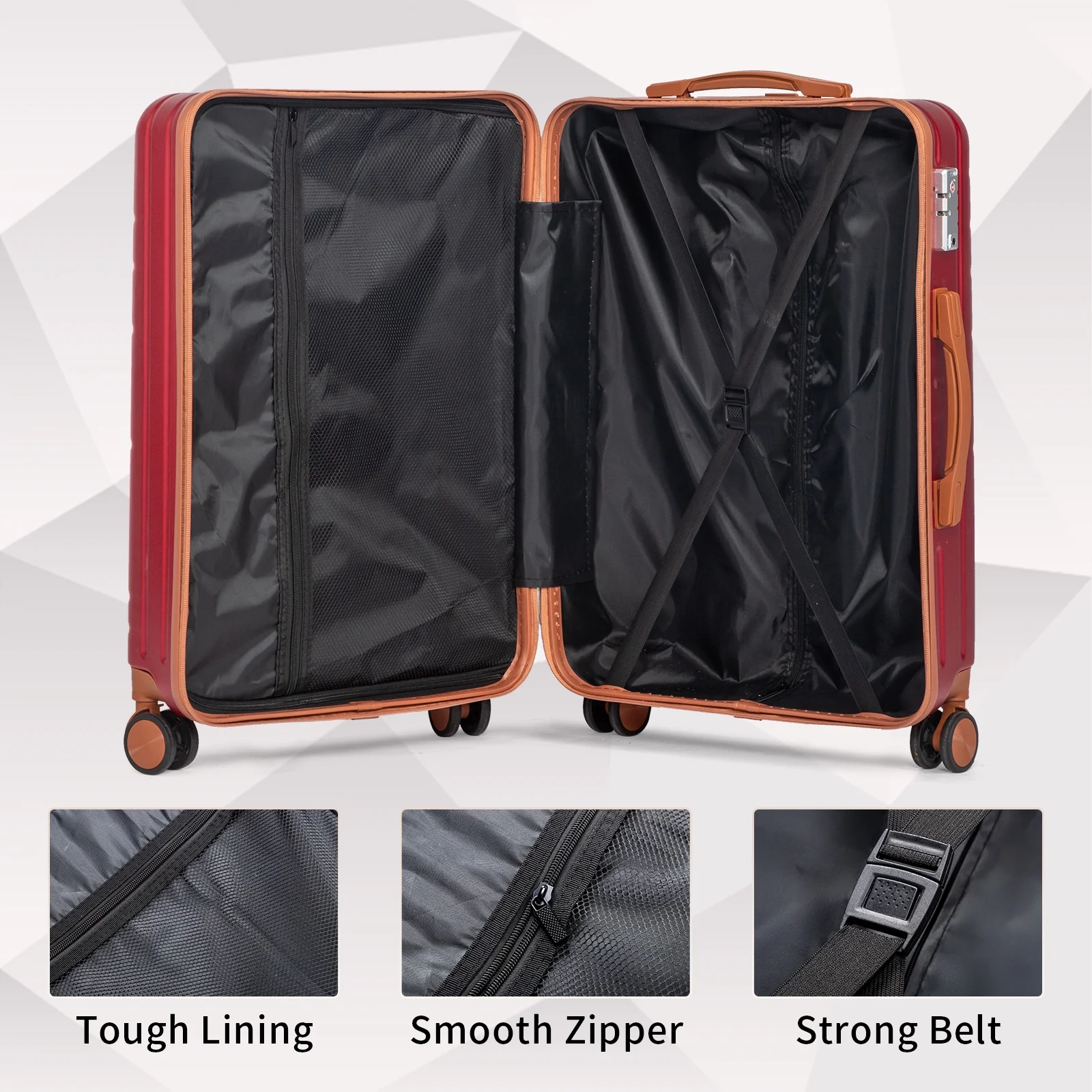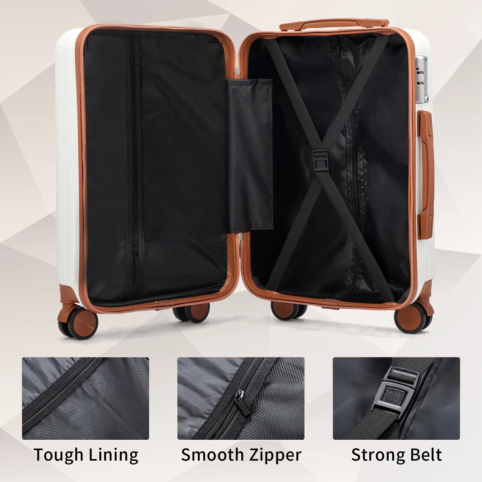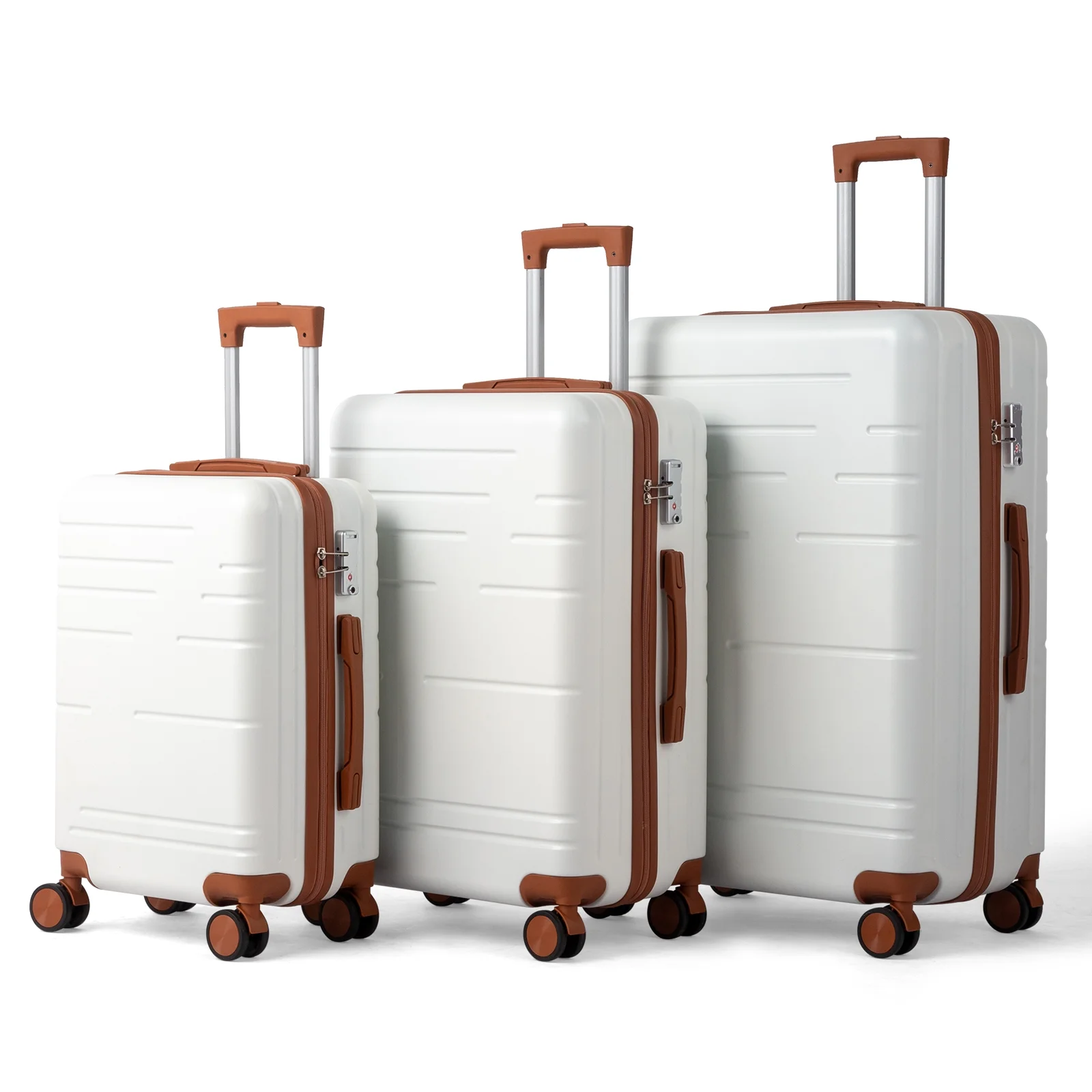This 3-piece luggage set (20��, 24��, 28��) is designed to simplify your travels. Each suitcase nests neatly inside the other, saving space when not in use. Equipped with 360�� spinner wheels, they glide effortlessly in any direction, making airport navigation a breeze. Crafted from 100% lightweight ABS material, these suitcases are both durable and easy to carry. The TSA-accepted lock ensures your belongings are secure, while the ergonomic aluminum telescoping handle provides a comfortable grip for travelers of all heights. Inside, mesh zip pockets and elastic straps keep your items organized and secure. Whether you're packing for a weekend trip or a long vacation, this set offers versatility, durability, and style. Click "Add to Cart" and make every journey smoother and more enjoyable!