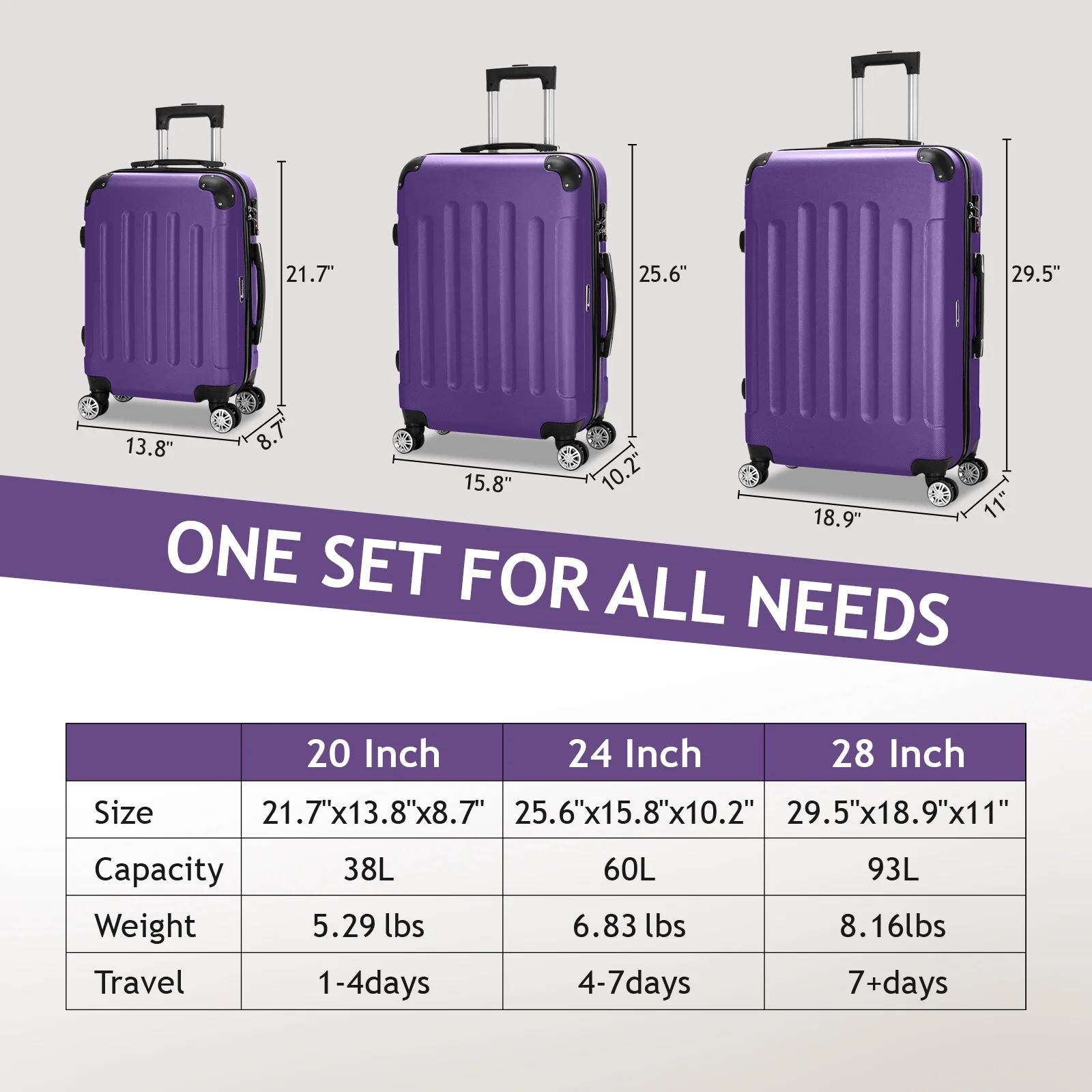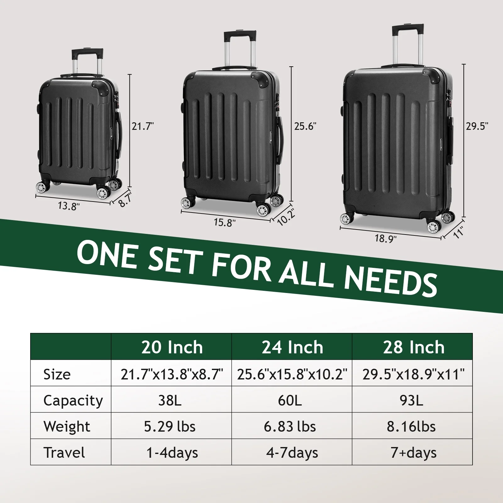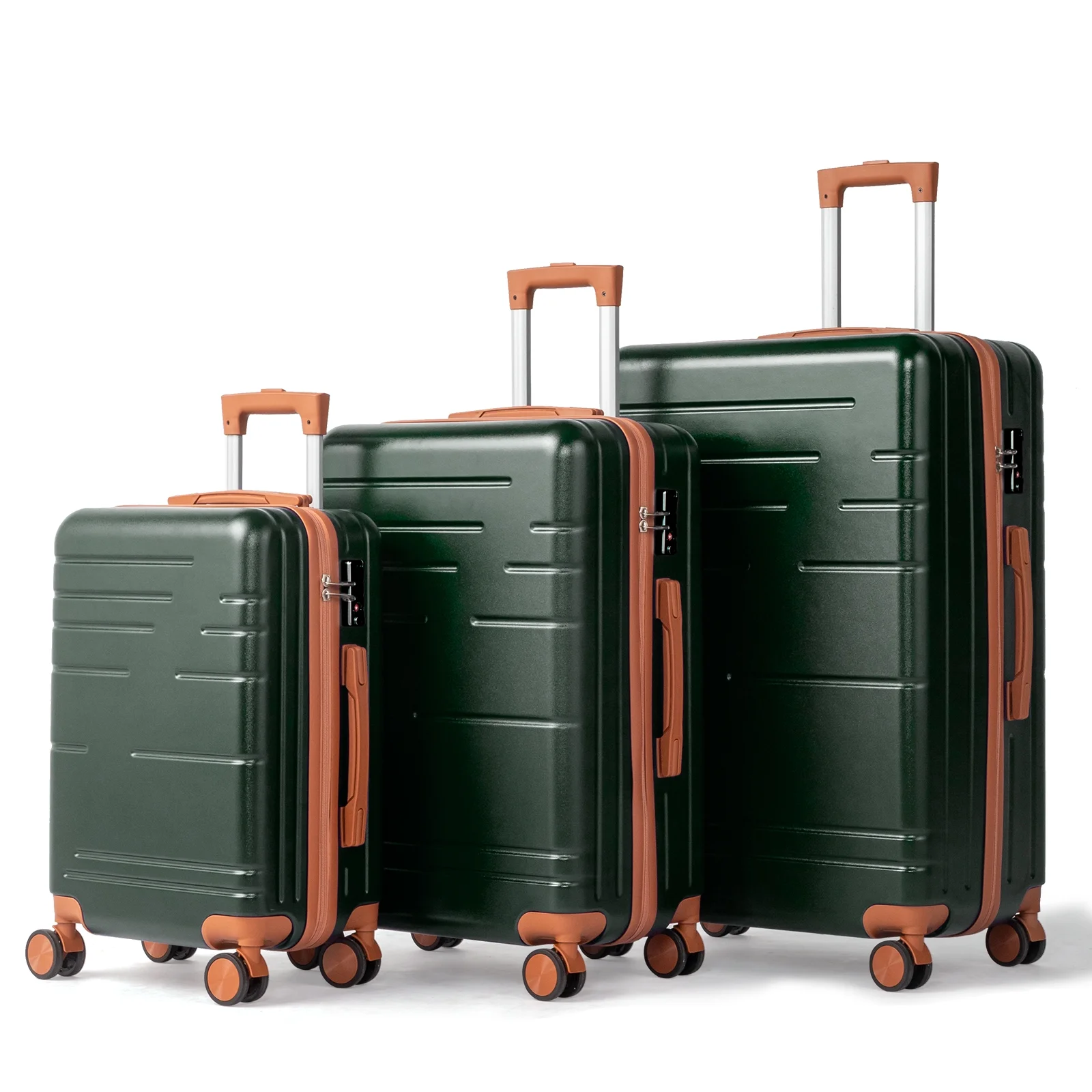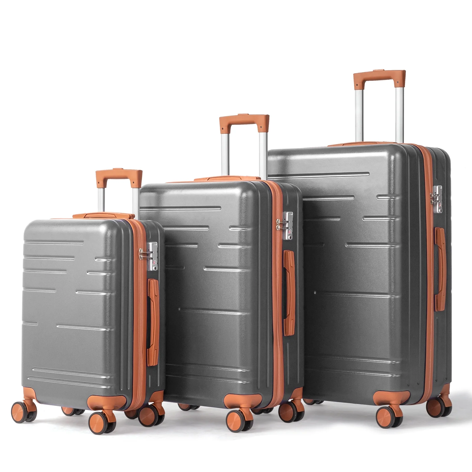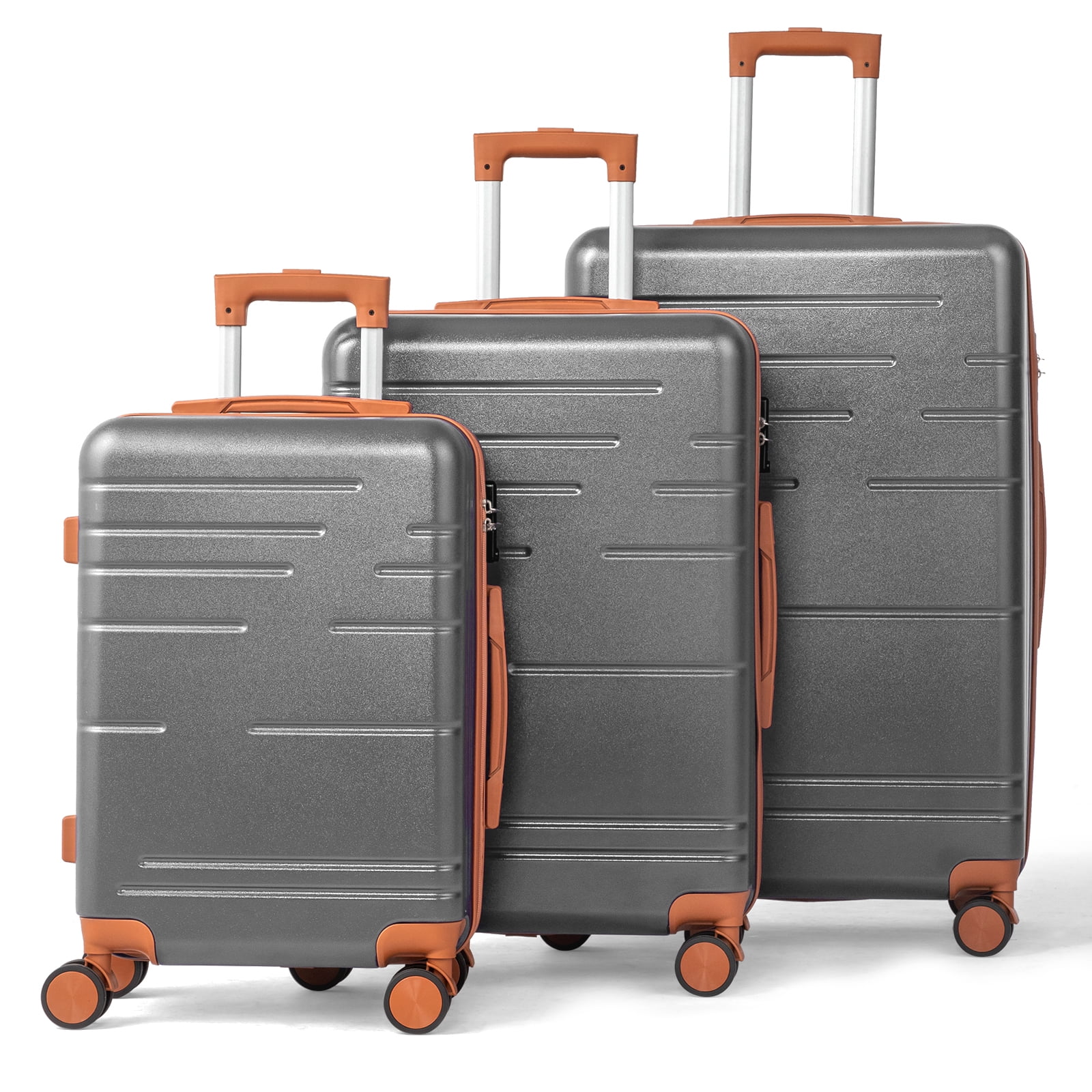 This 3-piece luggage set (20��, 24��, 28��) is designed to simplify your travels. Each suitcase nests neatly inside the other, saving space when not in use. Equipped with 360�� spinner wheels, they glide effortlessly in any direction, making airport navigation a breeze. Crafted from 100% lightweight ABS material, these suitcases are both durable and easy to carry. The TSA-accepted lock ensures your belongings are secure, while the ergonomic aluminum telescoping handle provides a comfortable grip for travelers of all heights. Inside, mesh zip pockets and elastic straps keep your items organized and secure. Whether you're packing for a weekend trip or a long vacation, this set offers versatility, durability, and style. Click "Add to Cart" and make every journey smoother and more enjoyable!