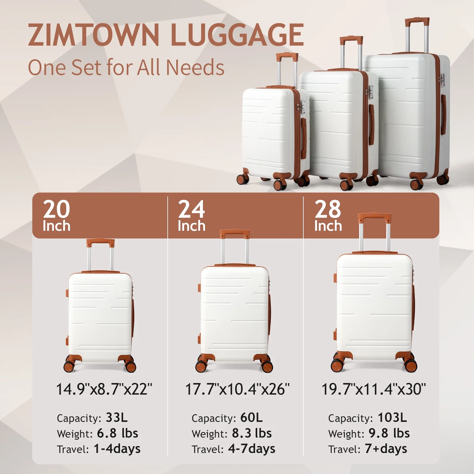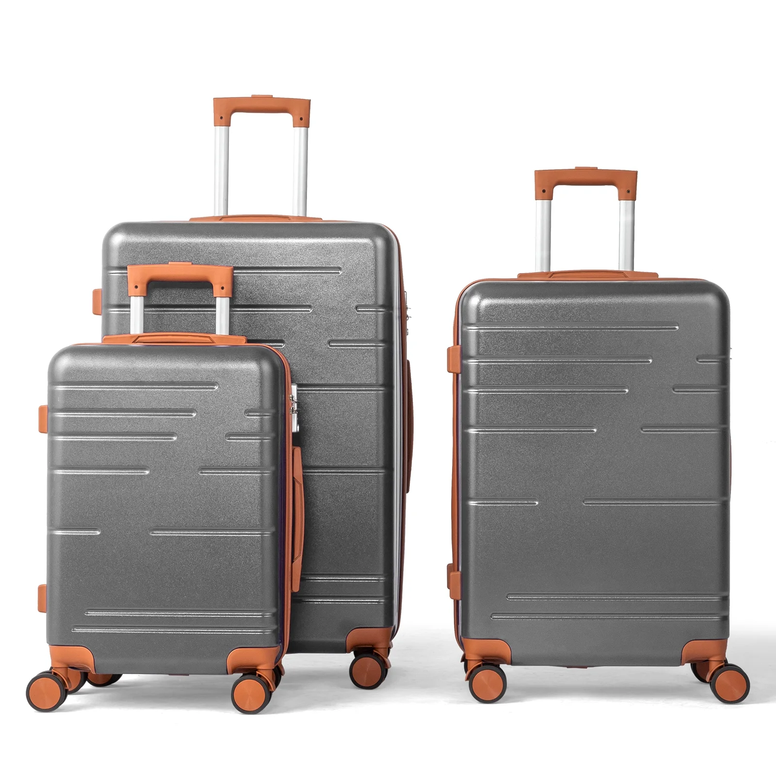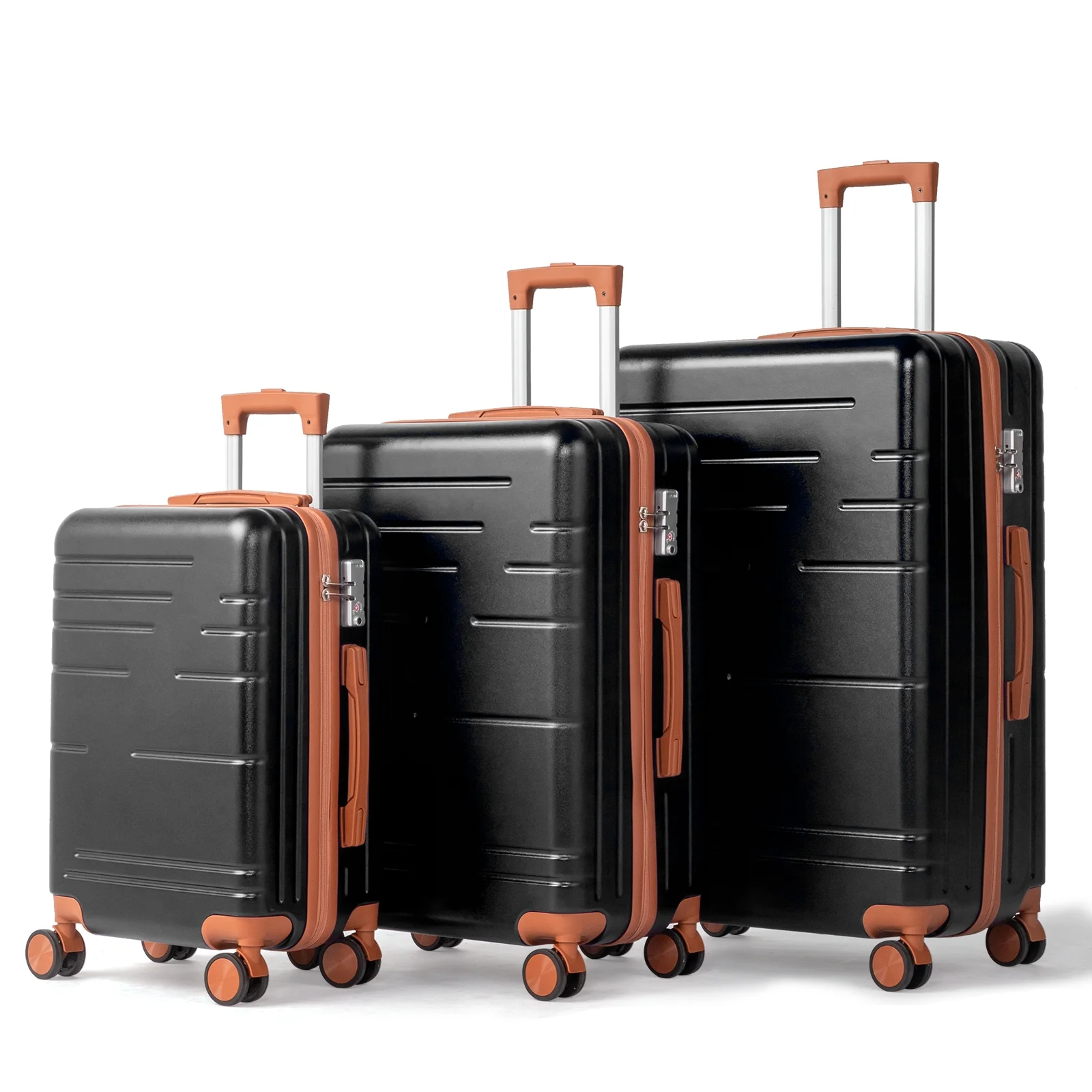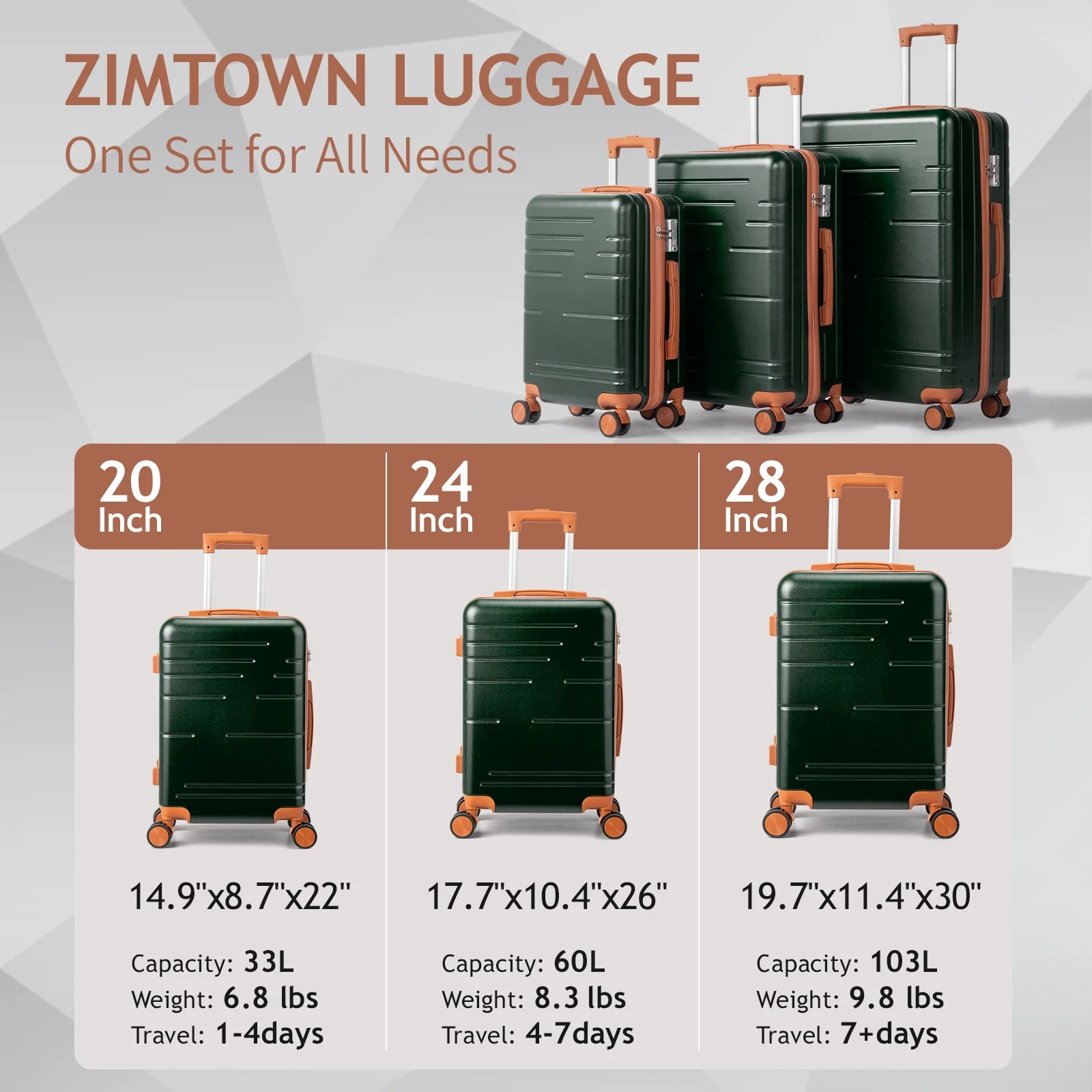 This 3-piece luggage set (20��, 24��, 28��) is designed to simplify your travels. Each suitcase nests neatly inside the other, saving space when not in use. Equipped with 360�� spinner wheels, they glide effortlessly in any direction, making airport navigation a breeze. Crafted from 100% lightweight ABS material, these suitcases are both durable and easy to carry. The TSA-accepted lock ensures your belongings are secure, while the ergonomic aluminum telescoping handle provides a comfortable grip for travelers of all heights. Inside, mesh zip pockets and elastic straps keep your items organized and secure. Whether you're packing for a weekend trip or a long vacation, this set offers versatility, durability, and style. Click "Add to Cart" and make every journey smoother and more enjoyable!