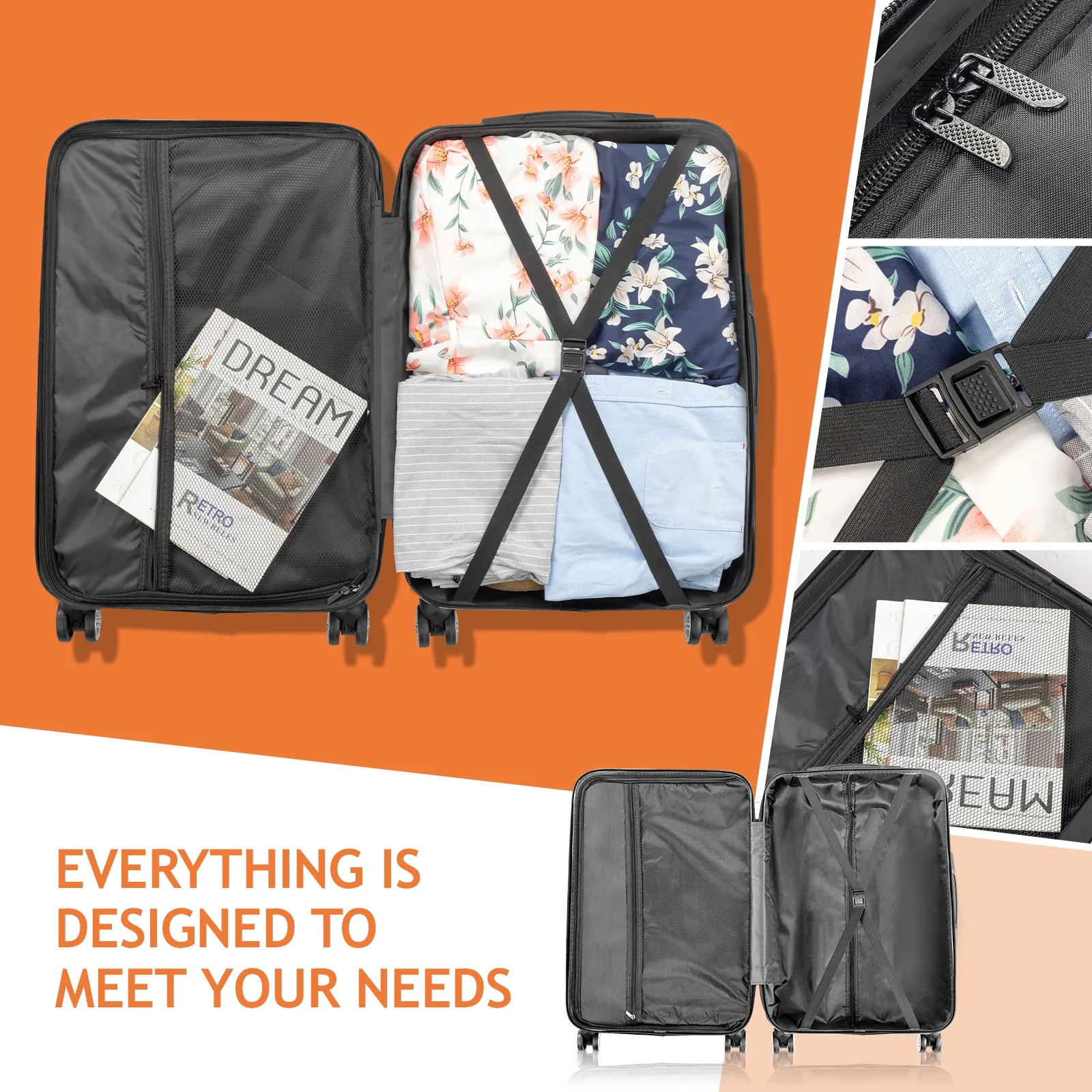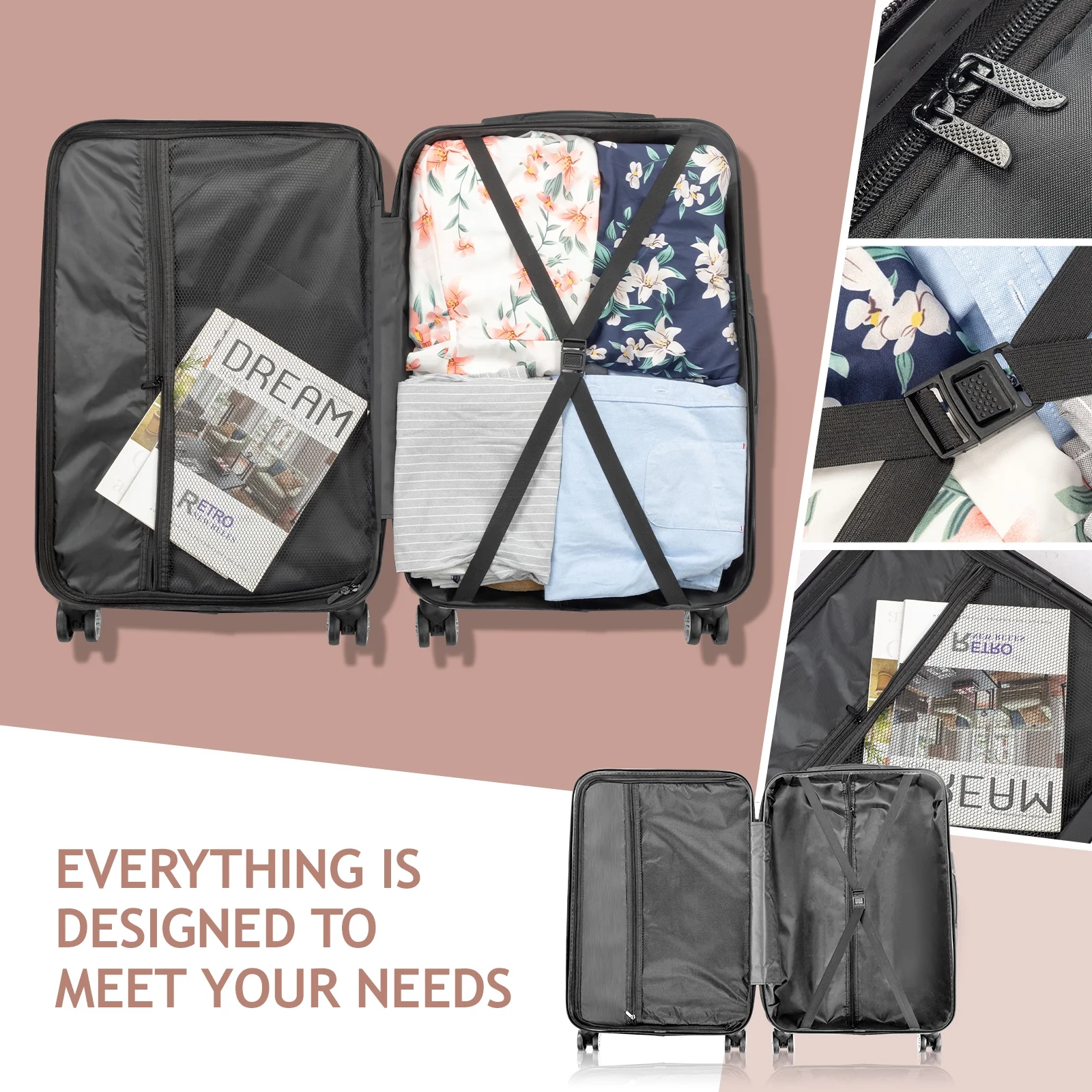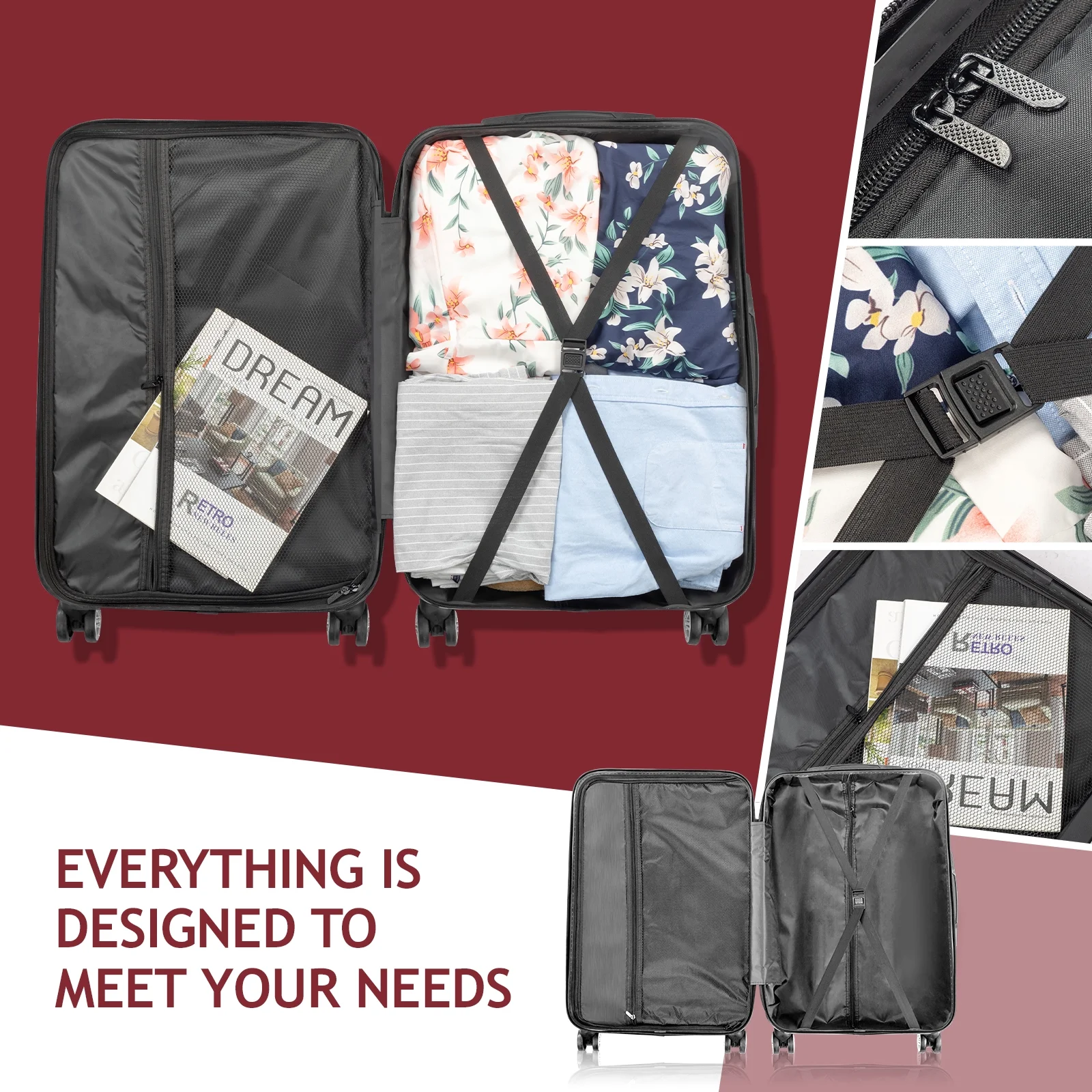Family-Friendly Interior Design: Stay organized with interior mesh pockets and elastic straps that keep clothes, toys, and accessories neatly in place. The squared full-capacity design ensures you can pack everything your family needs for the trip.
