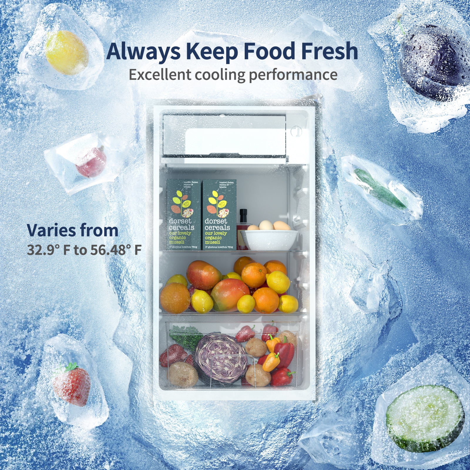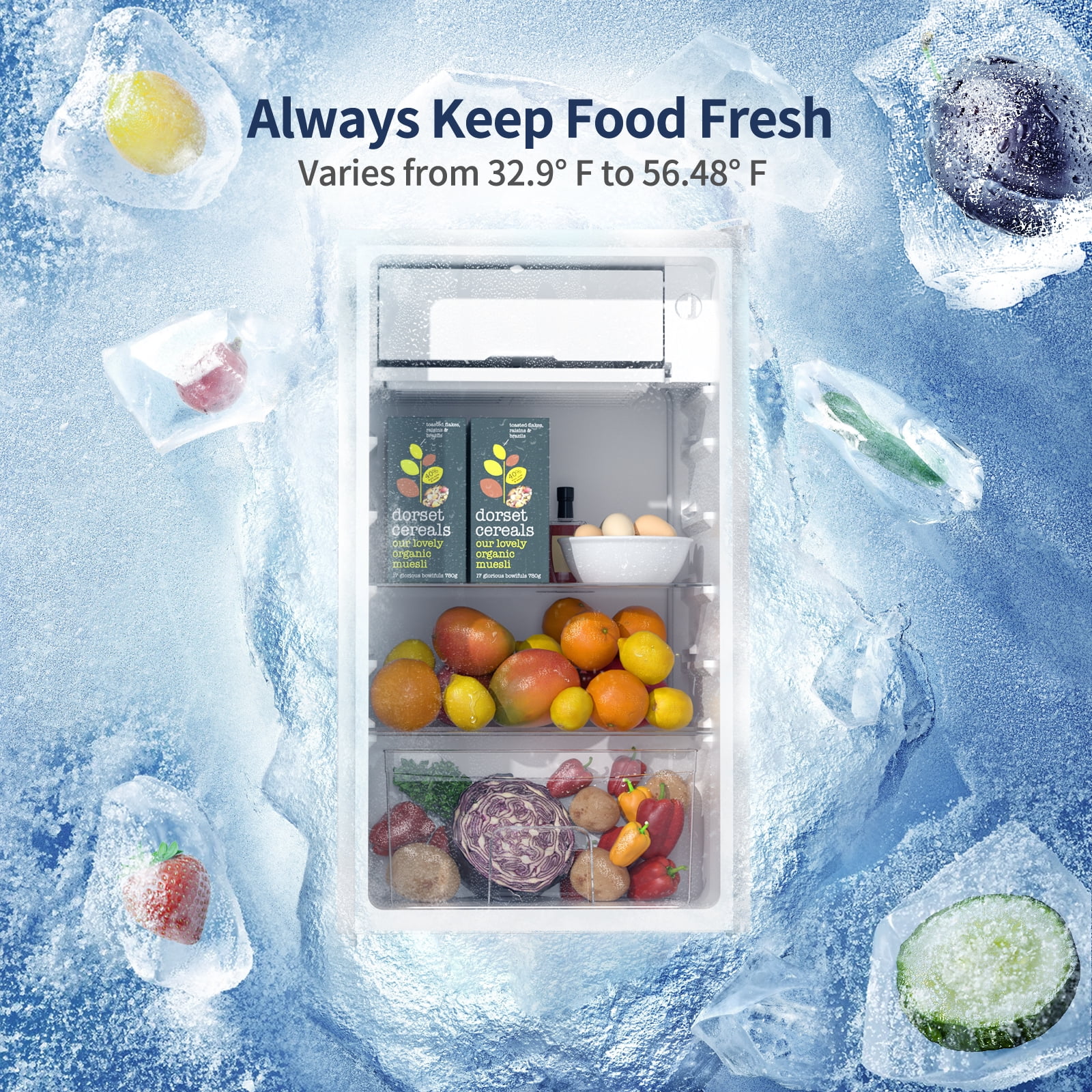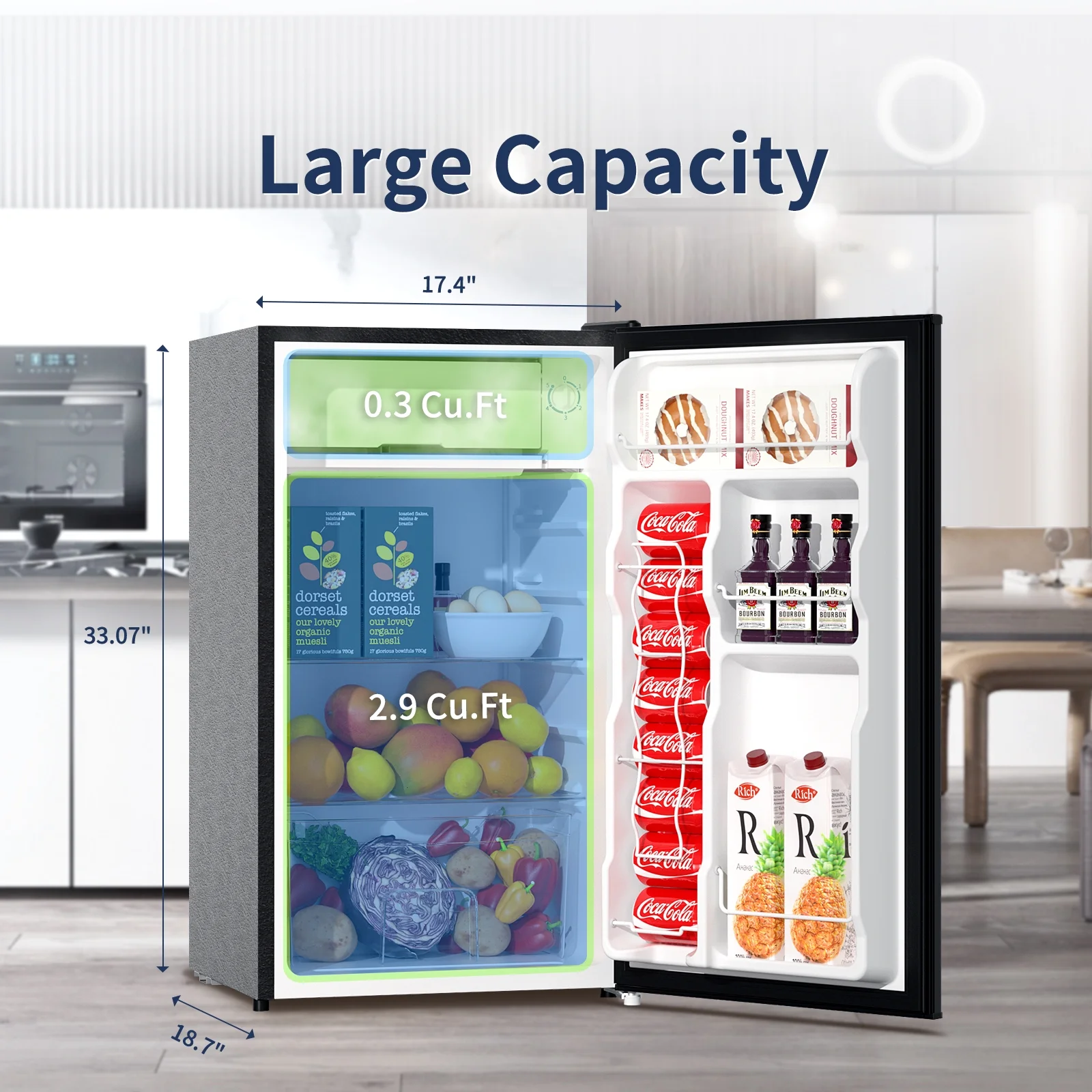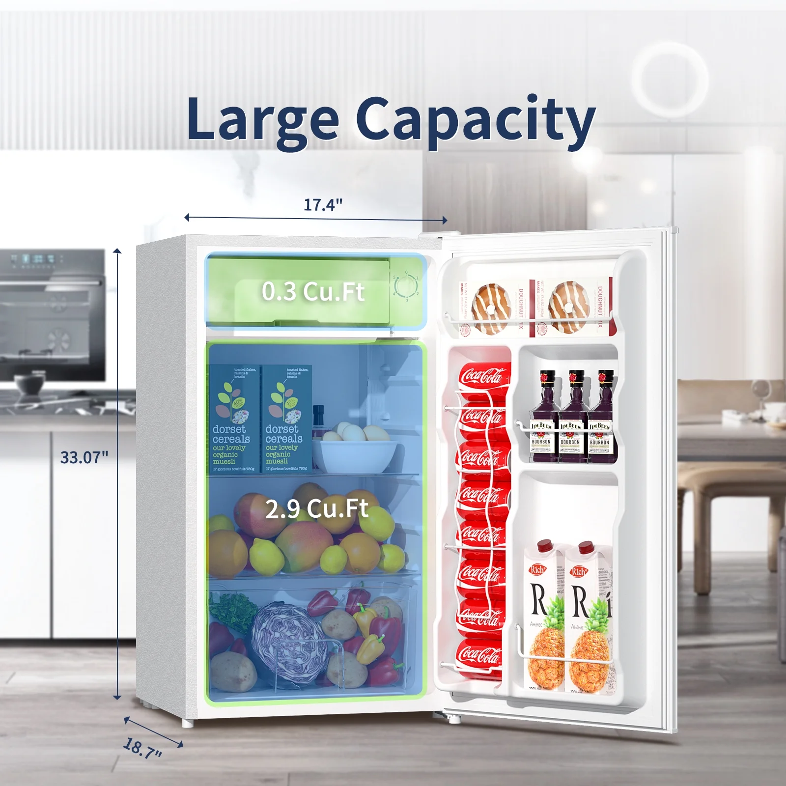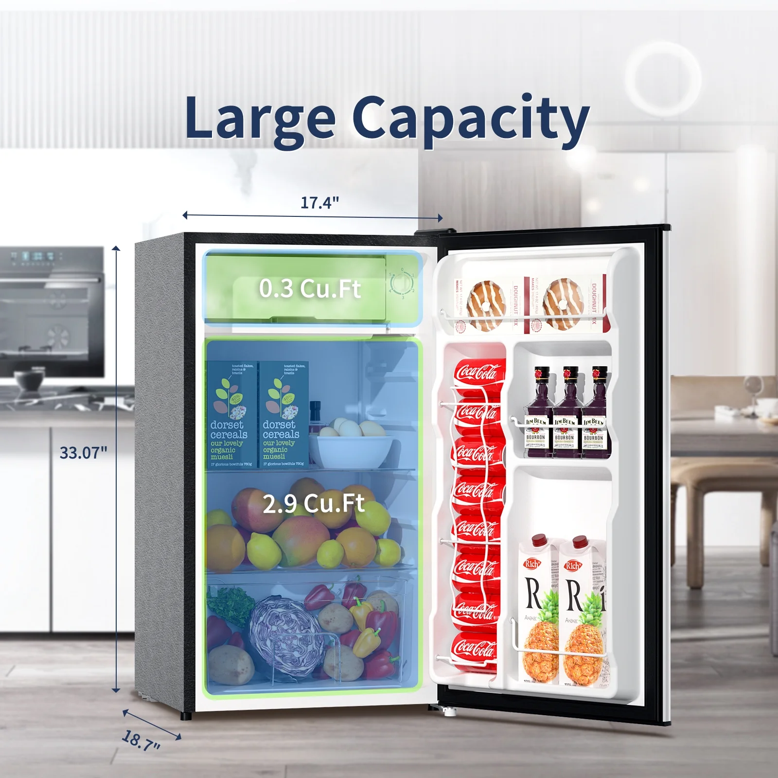 - Large capacity of 3.2 Cu.Ft, perfect for beverages, fruits, and food
