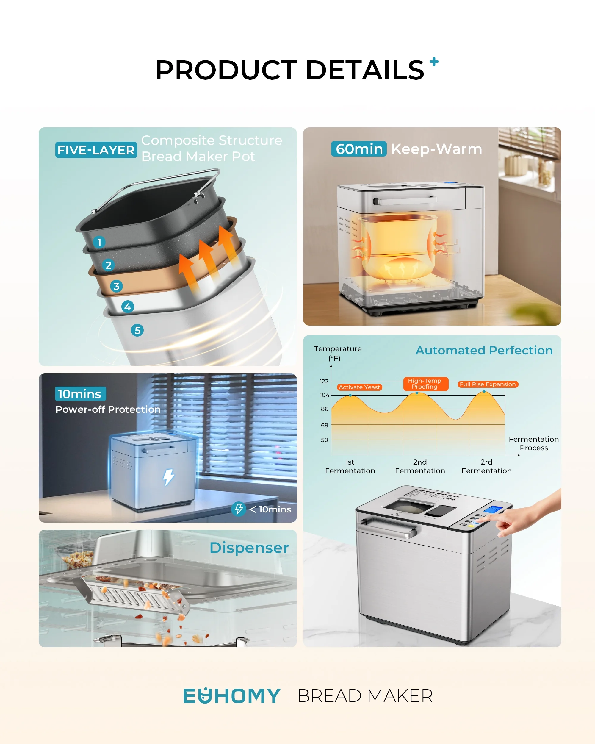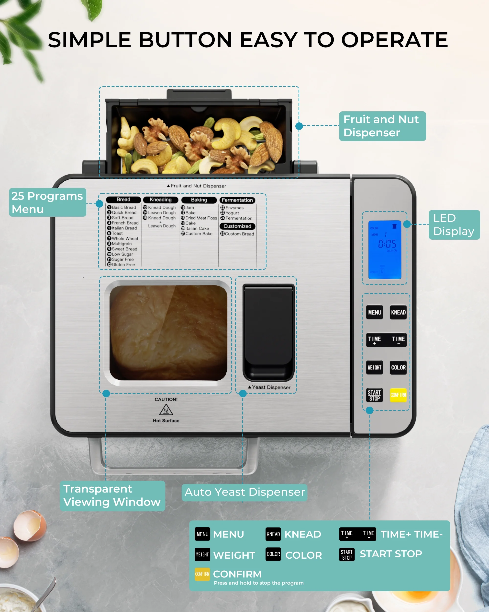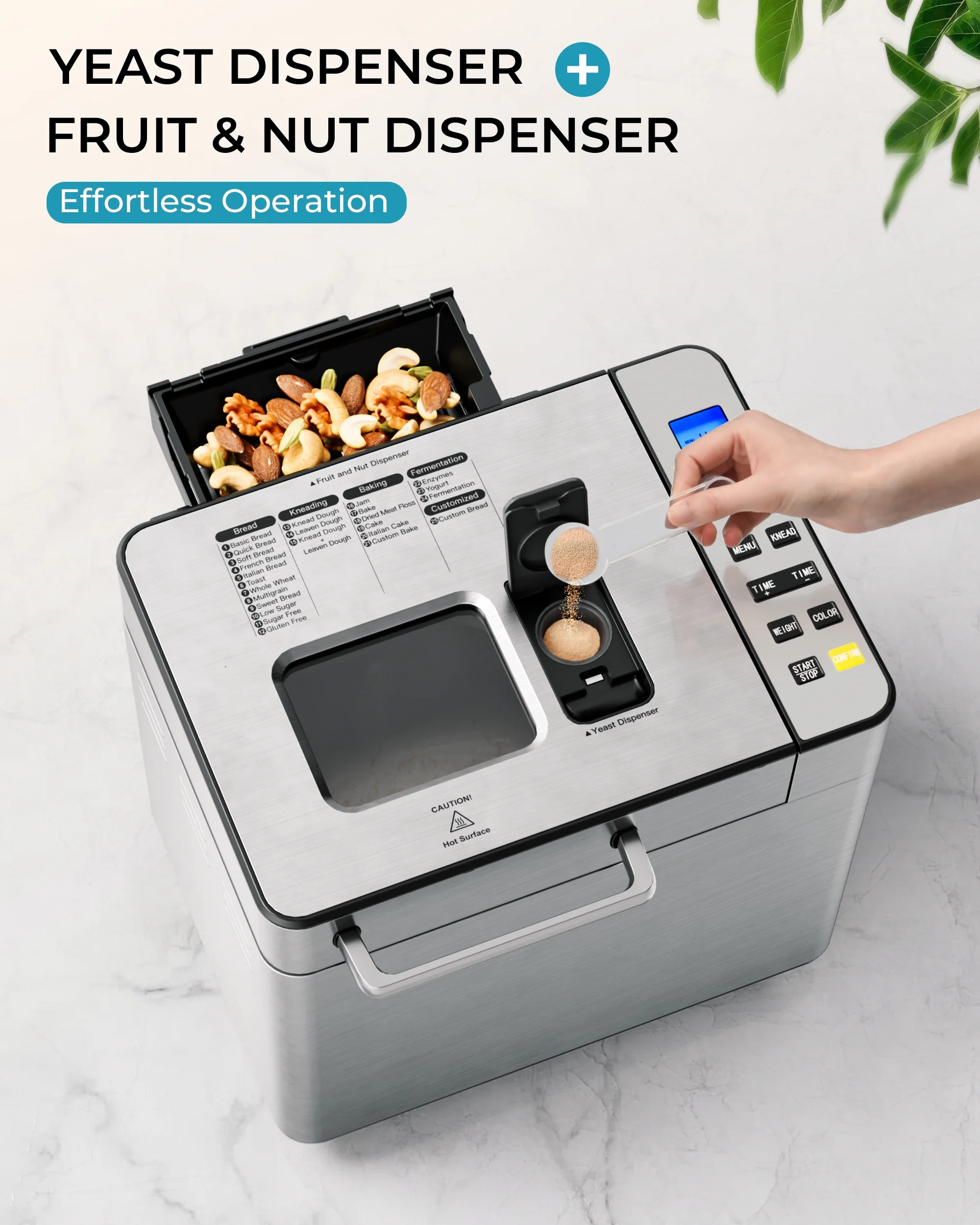 - Automatic Ingredient Dispensers for Enhanced Taste: This bread maker comes with built-in automatic fruit & nut dispensers and yeast dispensers, which release ingredients at the optimal time during the baking cycle. This ensures even distribution of ingredients, improving the flavor and texture of your homemade bread, making it an excellent gift choice for friends and family.