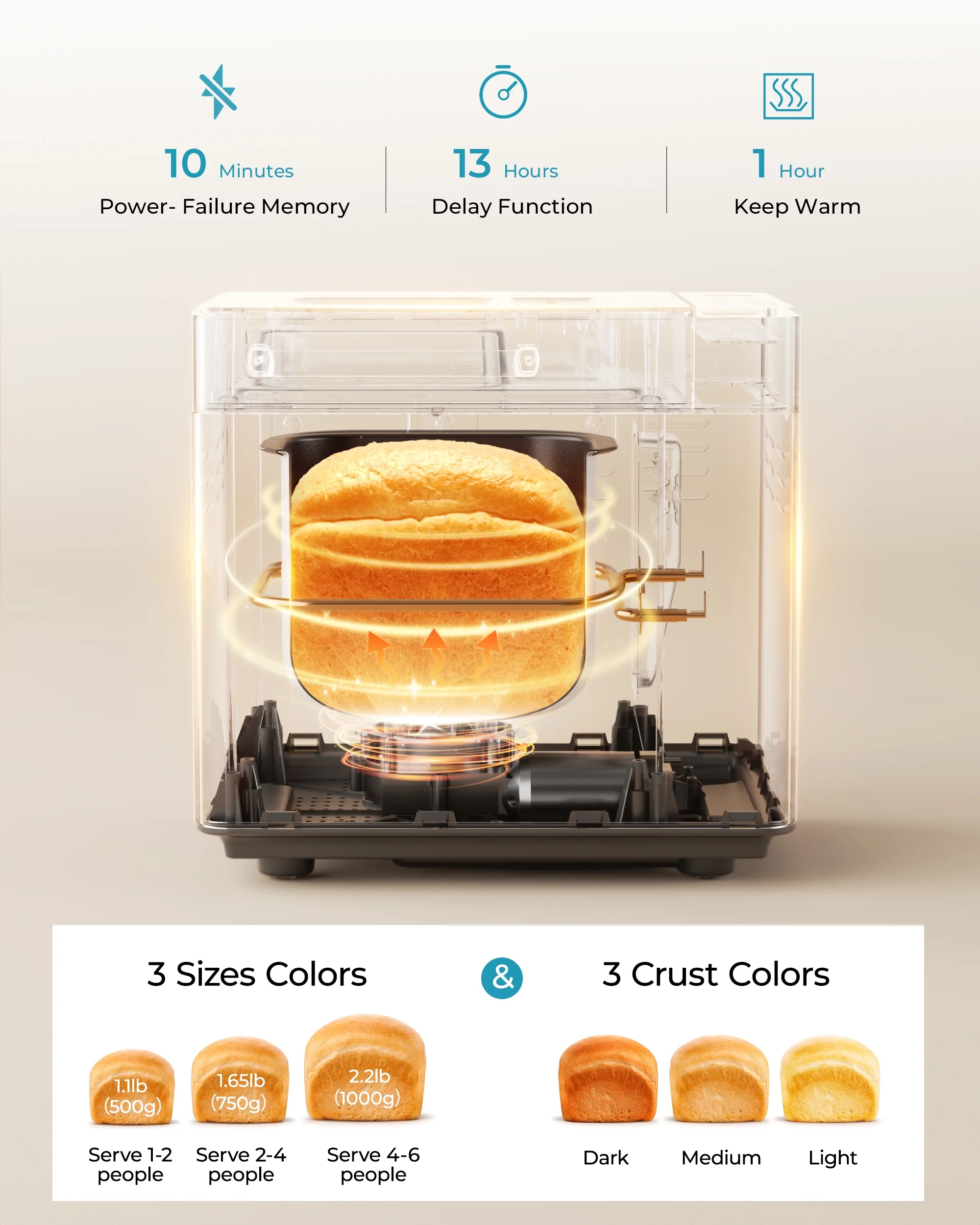 - Multi-Specification Customization + Safe & Durable Design: You can choose from three crust colors (light, medium, dark) and three loaf sizes (2lb, 1.65lb, 1.1lb) based on your needs. The machine is made of stainless steel, featuring rust resistance, and is equipped with a viewing window for monitoring the baking process. The insulated handle design ensures safe opening, making it suitable for family use.