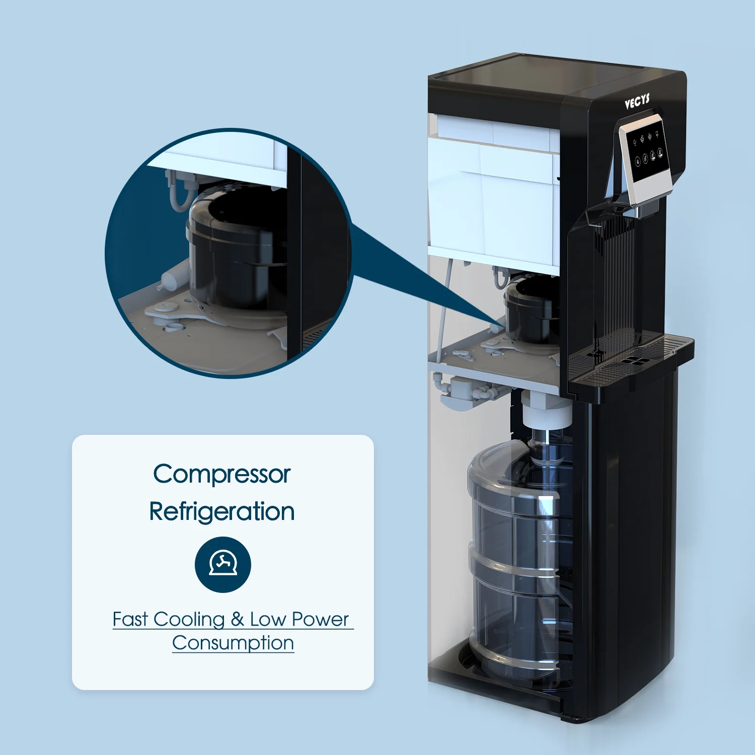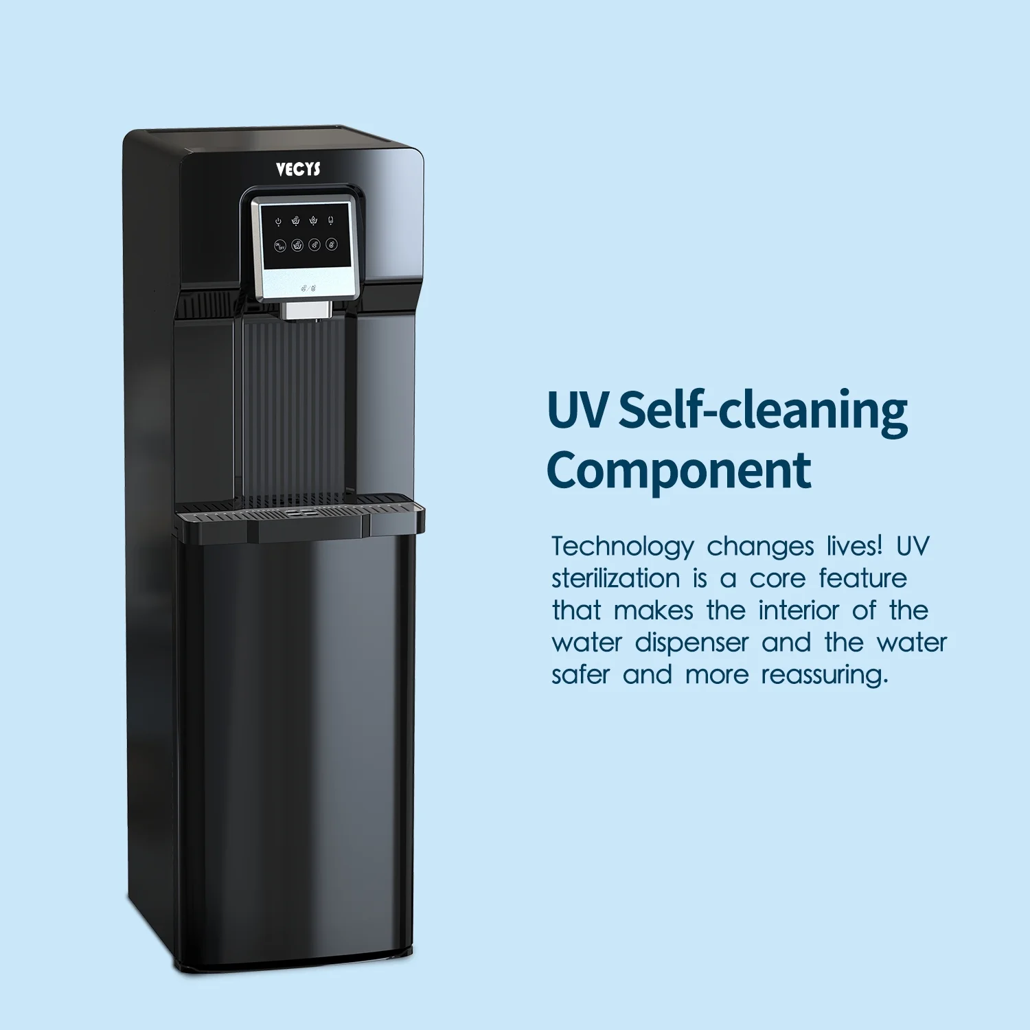 The overall body is made of high-quality ABS plastic with a sleek, high-end painted finish, giving it a stylish and premium appearance with a wonderful texture. Its bottom-load design is compatible with 3 or 5-gallon water bottles, eliminating the need to lift heavy water bottles, making it more user-friendly, especially for women or elderly users.