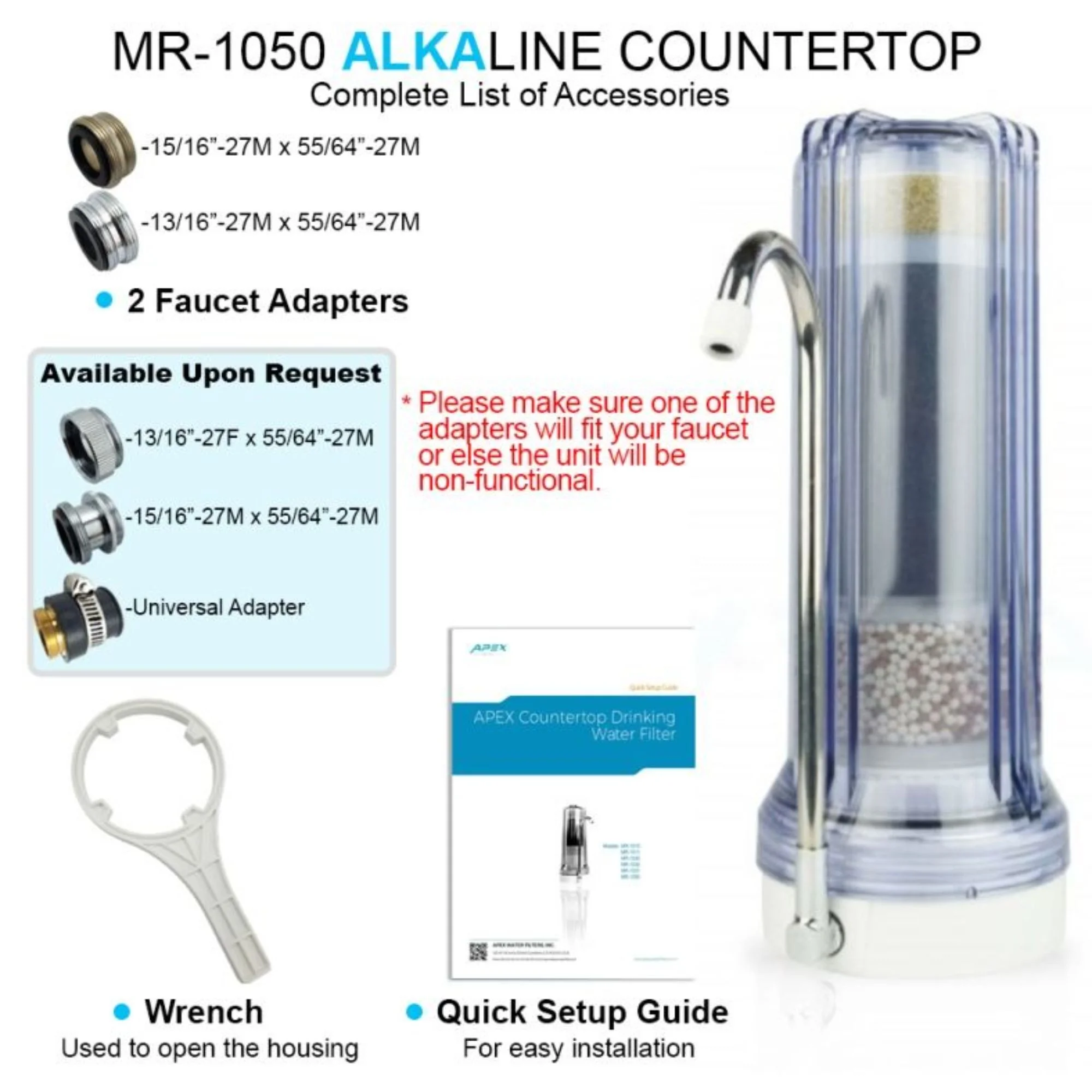 - Easy Installation: No need for drilling or hiring a plumber. The MR-1050 offers a simple twist-on installation, fitting most standard faucets with a 55/64" thread. It comes with four additional faucet adapters, and if none fit, Apex technical support will provide further assistance to complete your setup, making it hassle-free and user-friendly.