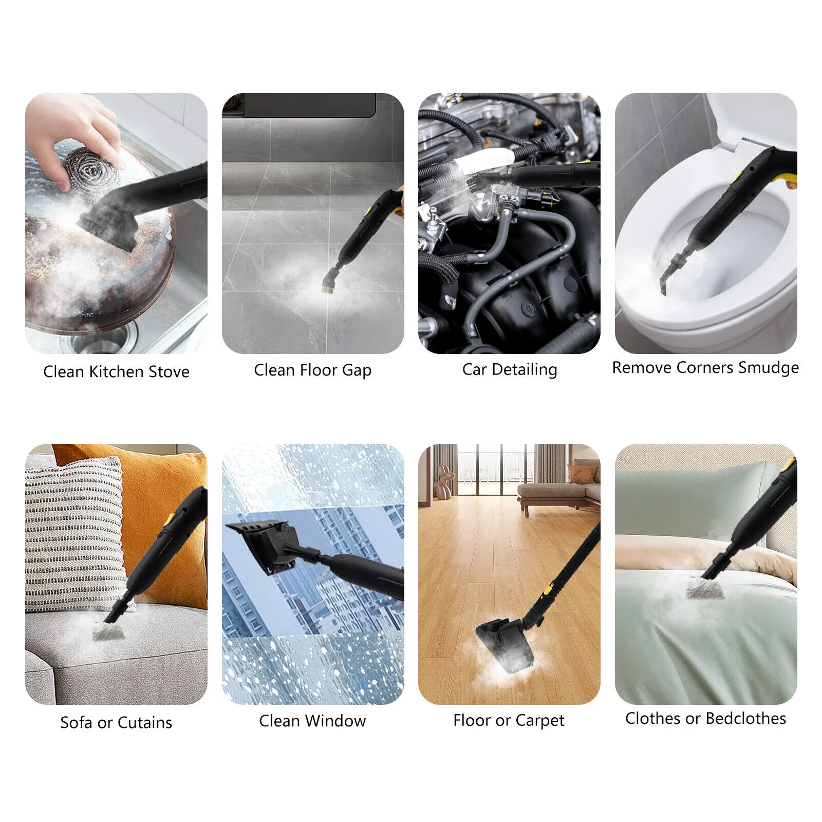Complete Configuration: Comes with a high-pressure nozzle, a floor brush, a brass brush, a small round brush, an inflator nozzle, a glass scraper, an ironing brush, a floor brush towel, a towel cover, etc., this product is suitable for cleaning kitchen pot/stove, carpets, tile floors, hardwood floor, sofa, clothes, bedclothes, window washing, car details, car interiors, car tires, and so on, meeting your various cleaning needs.