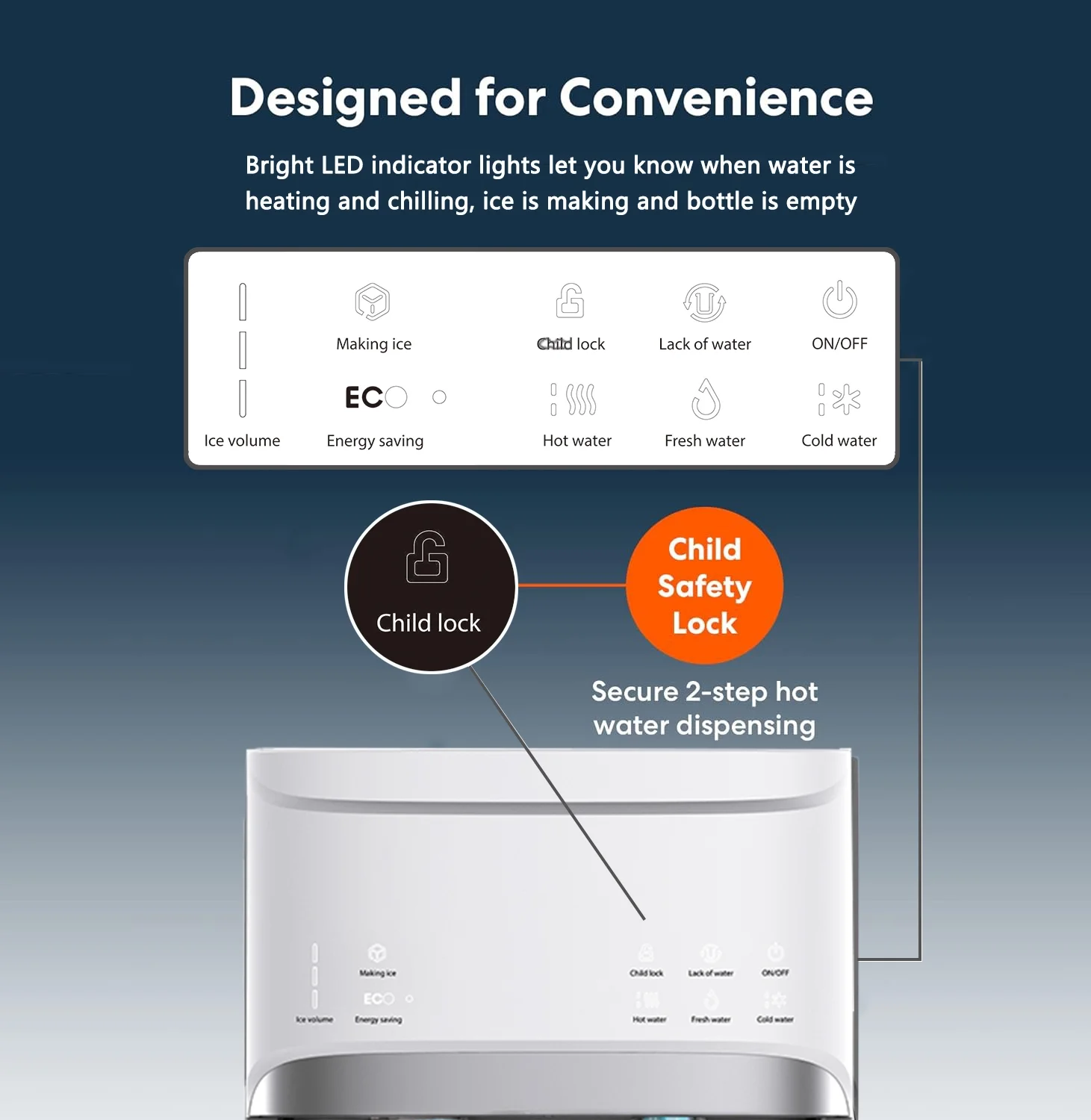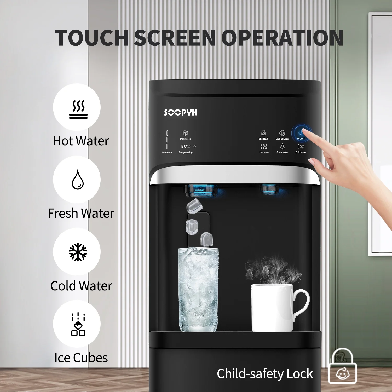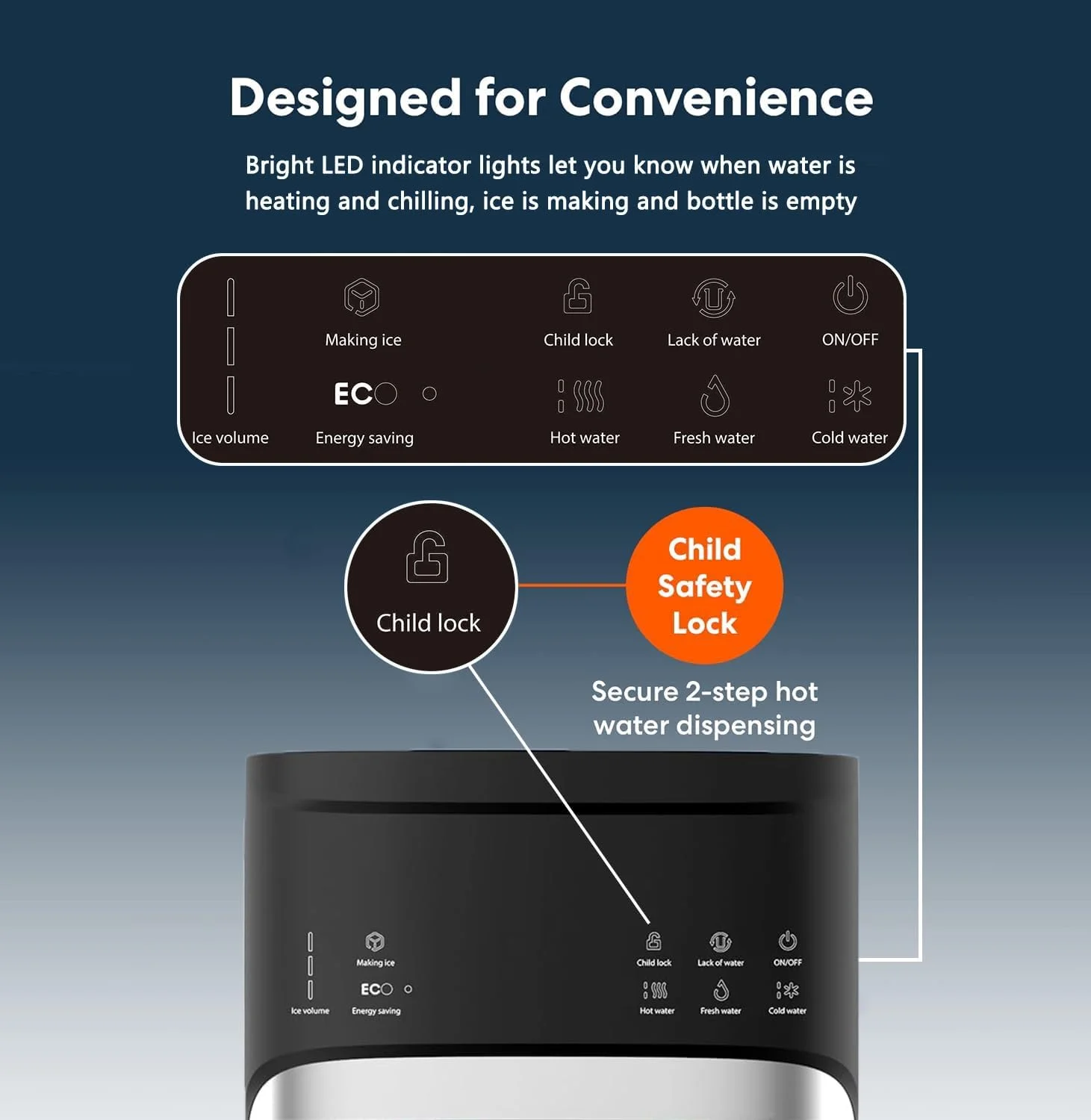 - SAFE & EASY DISPENSING: One dispensing paddle for ice cubes and one spigots for both cold and hot water make dispensing easy and allow you to refill almost any sized cup. The hot water dispenser has a child safety lock, preventing any accidental pouring. If you want a cup of hot water ,please press the Child Lock button first then press the hot water button.