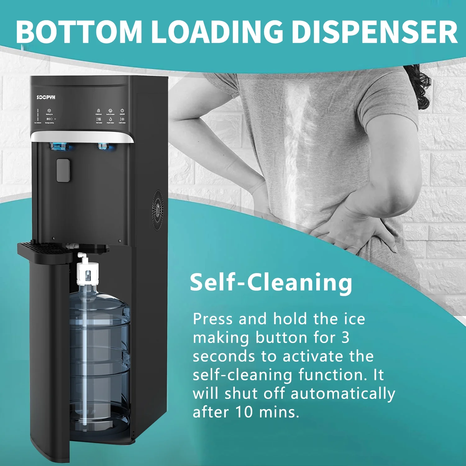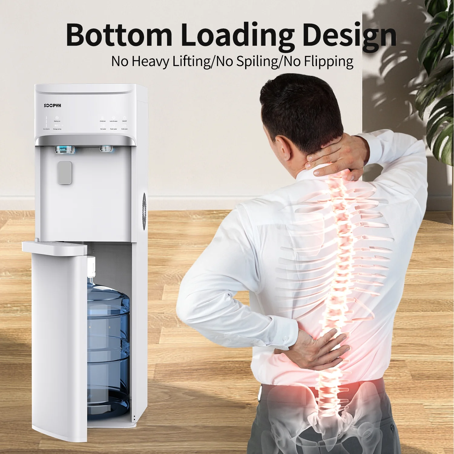 - BOTTOM-LOADING DISPENSER: Features an easy-to-use, convenient bottom-loading water system �?eliminating any lifting, flipping and spilling while keeping the bottle tucked away in a cabinet below. Suitable for 3 and 5-gallon water bottles (not included).