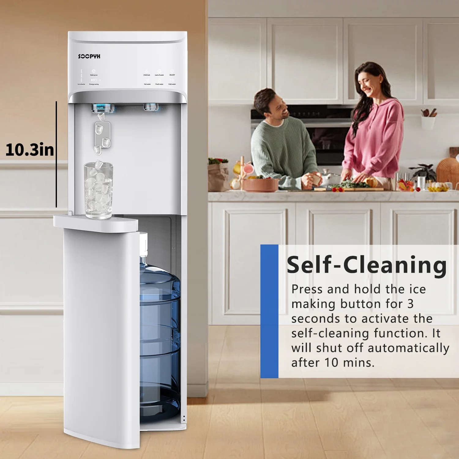 - INTUITIVE TOUCH SCREEN CONTROLS: Touch screen control panel is straightforward, easy to understand, and easy to use. Indicator lights tell you when ice is being made, water is cooling, and when both are ready to dispense.