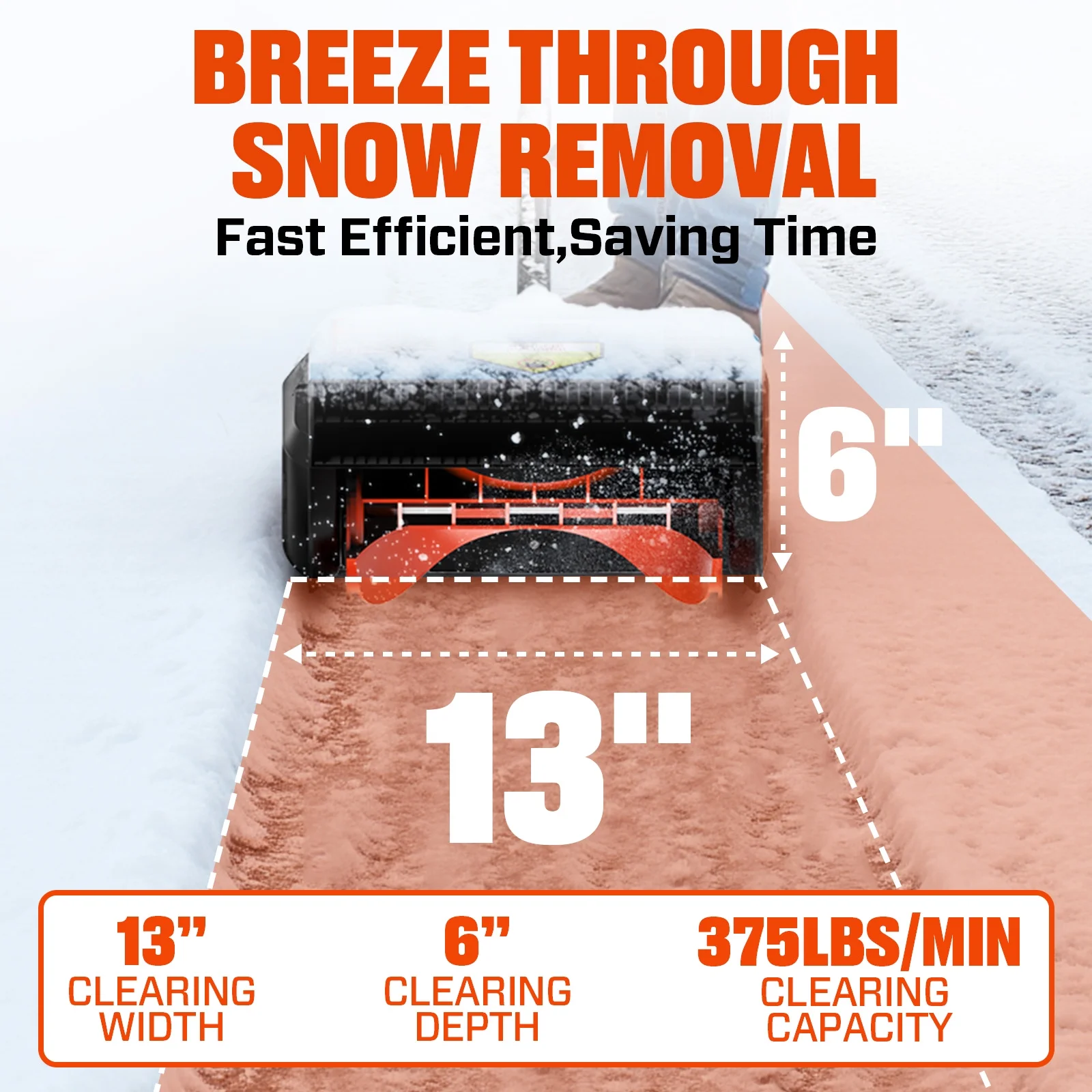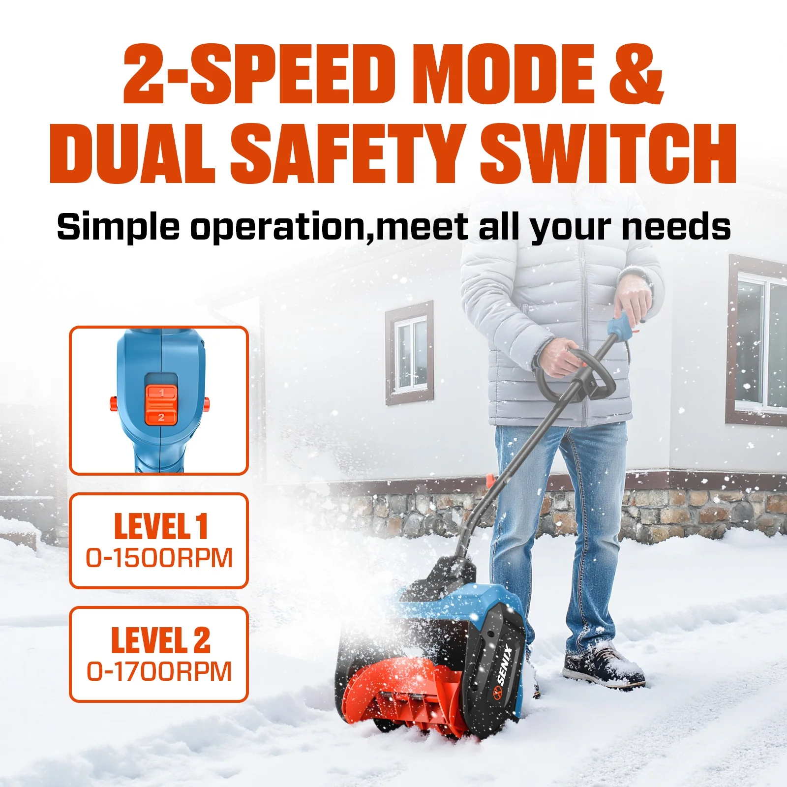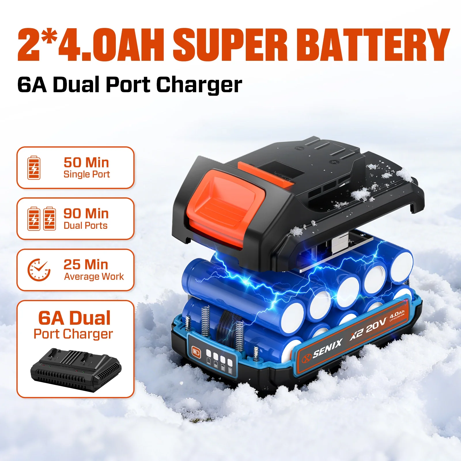 Clear your driveway before the coffee��s done��40V snow shovel cuts a 13��8 in. path. swath, blasting 375 lbs of snow a minute 20 ft away, so you finish fast and get back to the warmth. No gas, no cords, no dawn-busting noise�� two speeds that chew through powder or slush. At 11.7 lbs anyone can run it one-handed;Detachable twin 20V 4.0Ah batteries and dual-port charger work with every Senix 20V tool. 5-year tool warranty, 3-year battery/charger coverage.