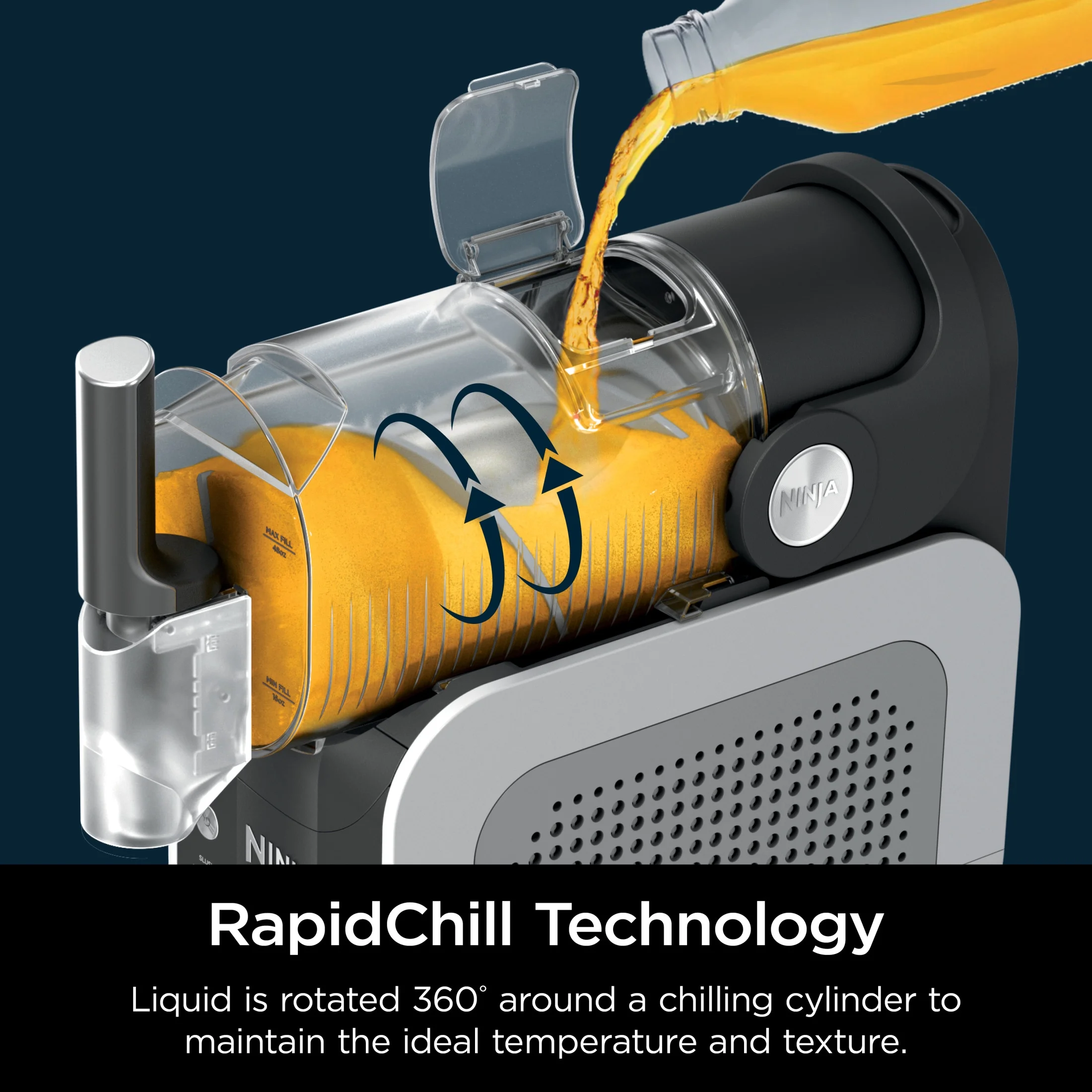 - RapidChill Technology is our innovative two-part system that spins the auger around the cooling cylinder to freeze liquid and maintain optimal temperature for the perfect icy treats with no ice needed