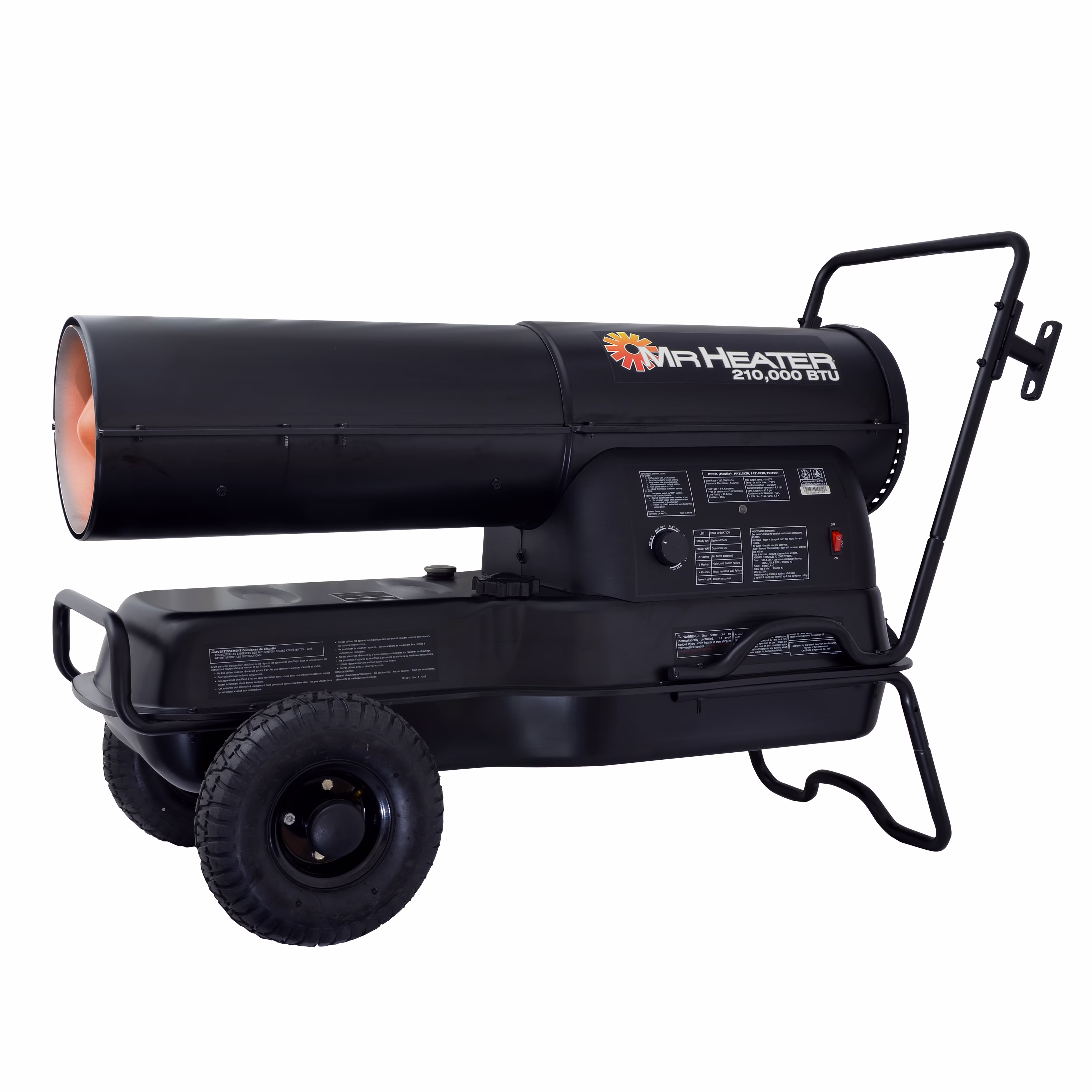 - A great source for economical heat, Mr. Heater's F270385 MH210KTR 210,000 BTU Forced Air Kerosene Heater is the perfect solution for garage or jobsite heating applications. Factory tested for multiple fuels (Kerosene, Diesel and Jet Fuel), this heater heats approximately 5,250 sq-ft. and will run up to 8.5 hours on a full 13.4 gallon fuel tank.
