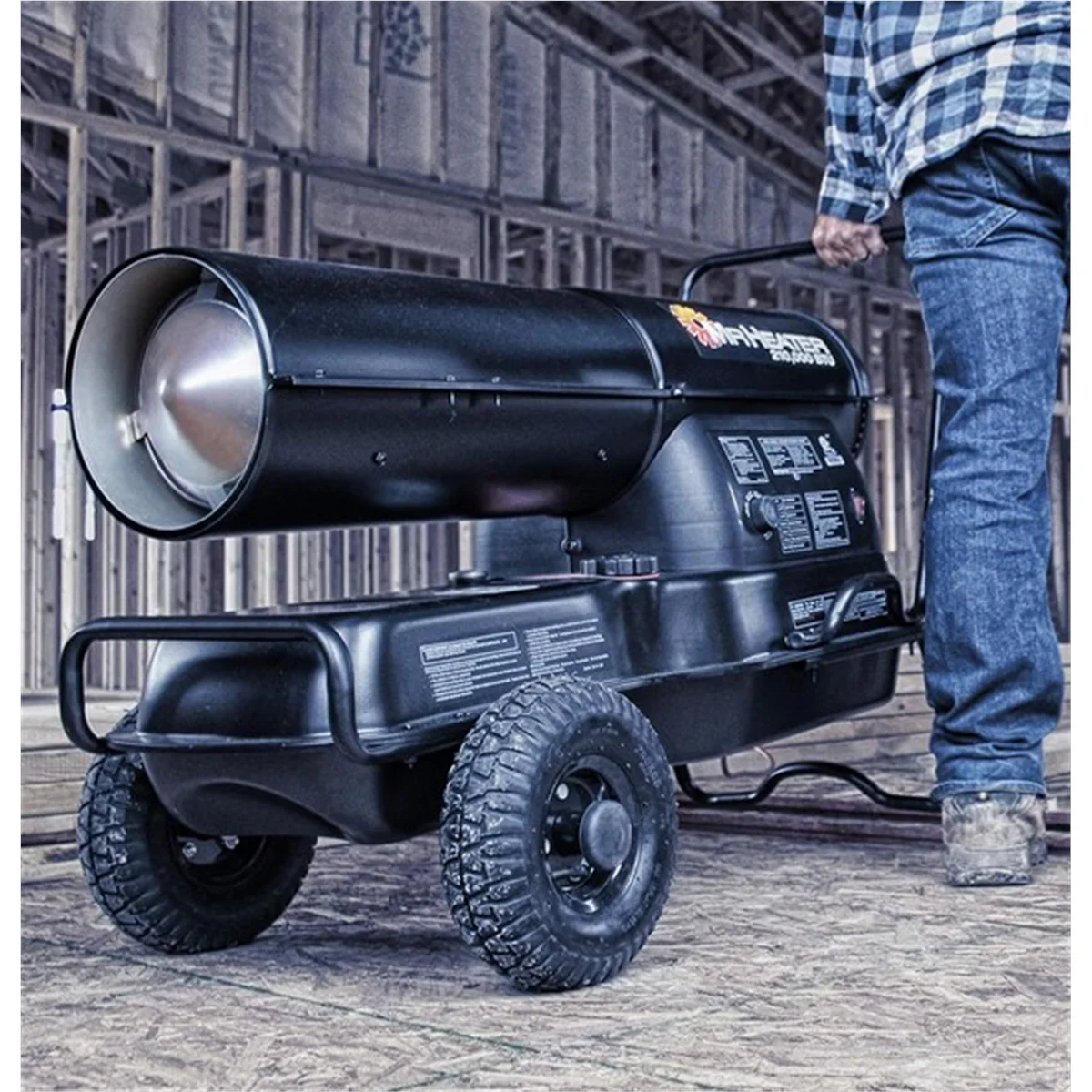 - With jobsite-ready dual powder coated tubular steel handles, pneumatic rubber tires, and a split upper shell designed for maintenance, you can expect long life and faithful service from your Mr. Heater Forced Air Kerosene heater. Equipped with high output fully enclosed motors and large glove friendly controls, you cannot go wrong.