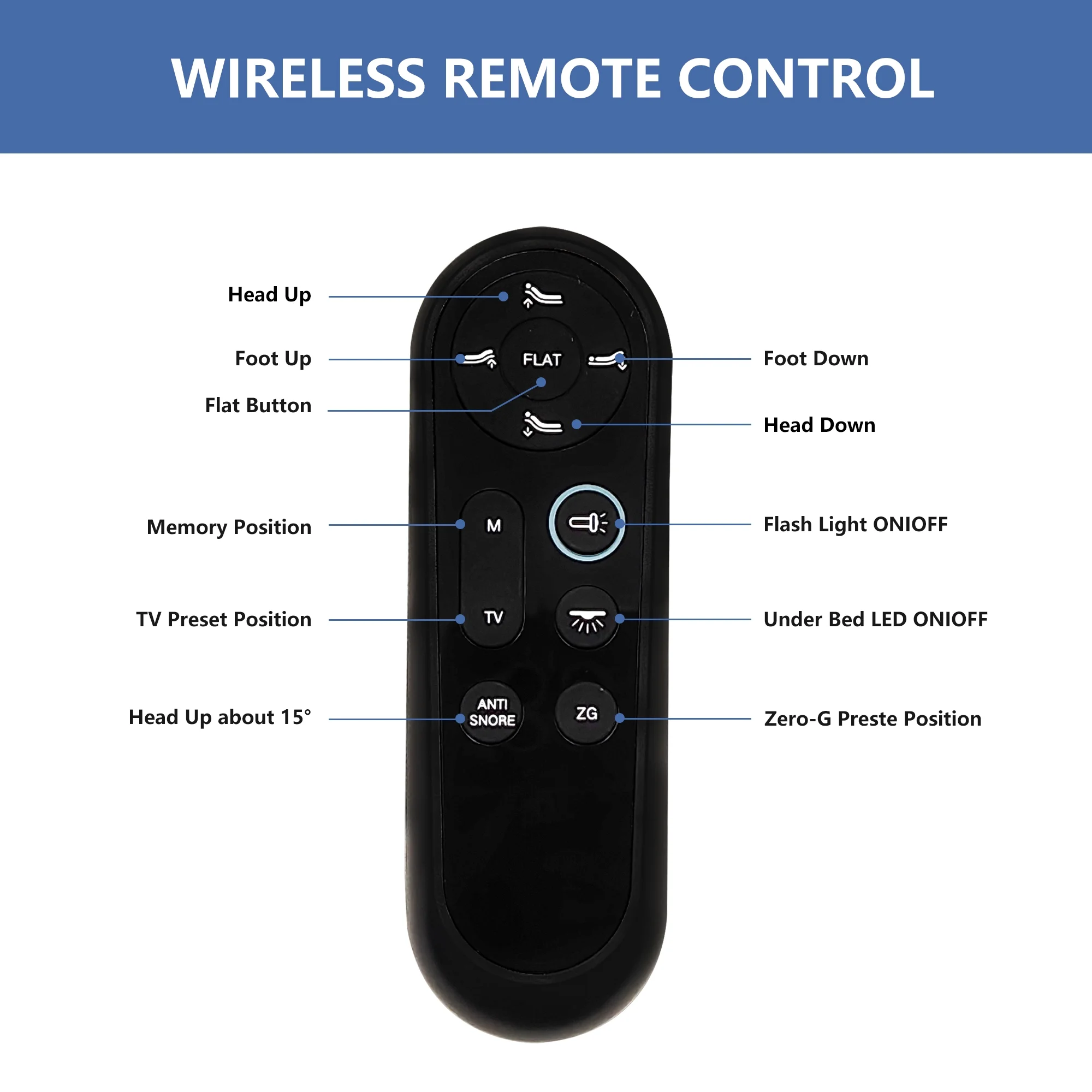 - Easy-to-Use Wireless Remote �C Effortlessly control bed adjustments using the included wireless remote with 9 buttons for full functionality. Ideal for seniors, patients, or those seeking personalized comfort.