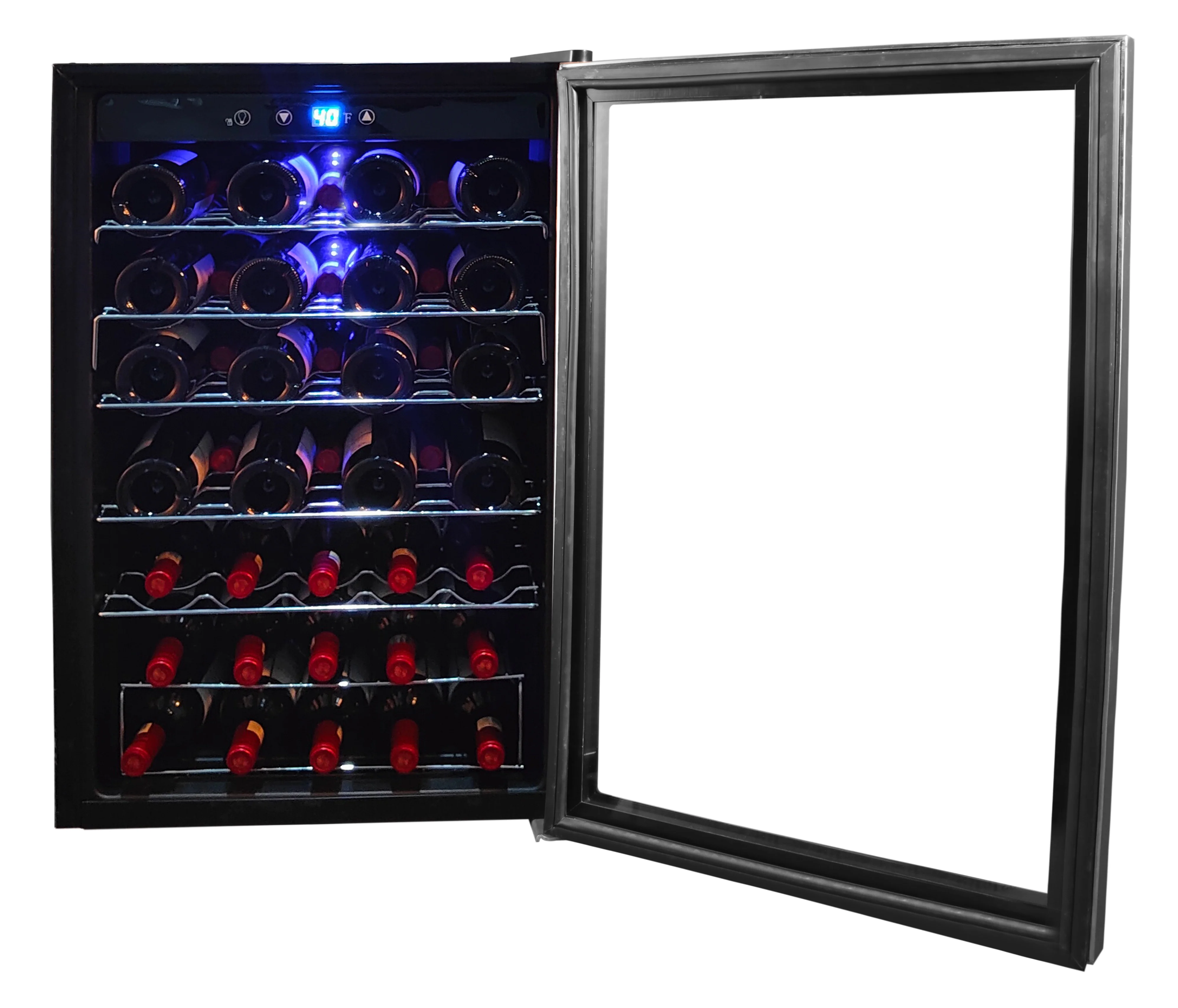 - Spacious 43-Bottle Capacity for Wine Lovers �C This freestanding wine cooler holds up to 43 bottles, making it perfect for both collectors and casual drinkers. Curved wire shelves keep your favorite reds, whites, and sparkling wines organized and ready to serve. A must-have wine cellar refrigerator for your home bar or kitchen.