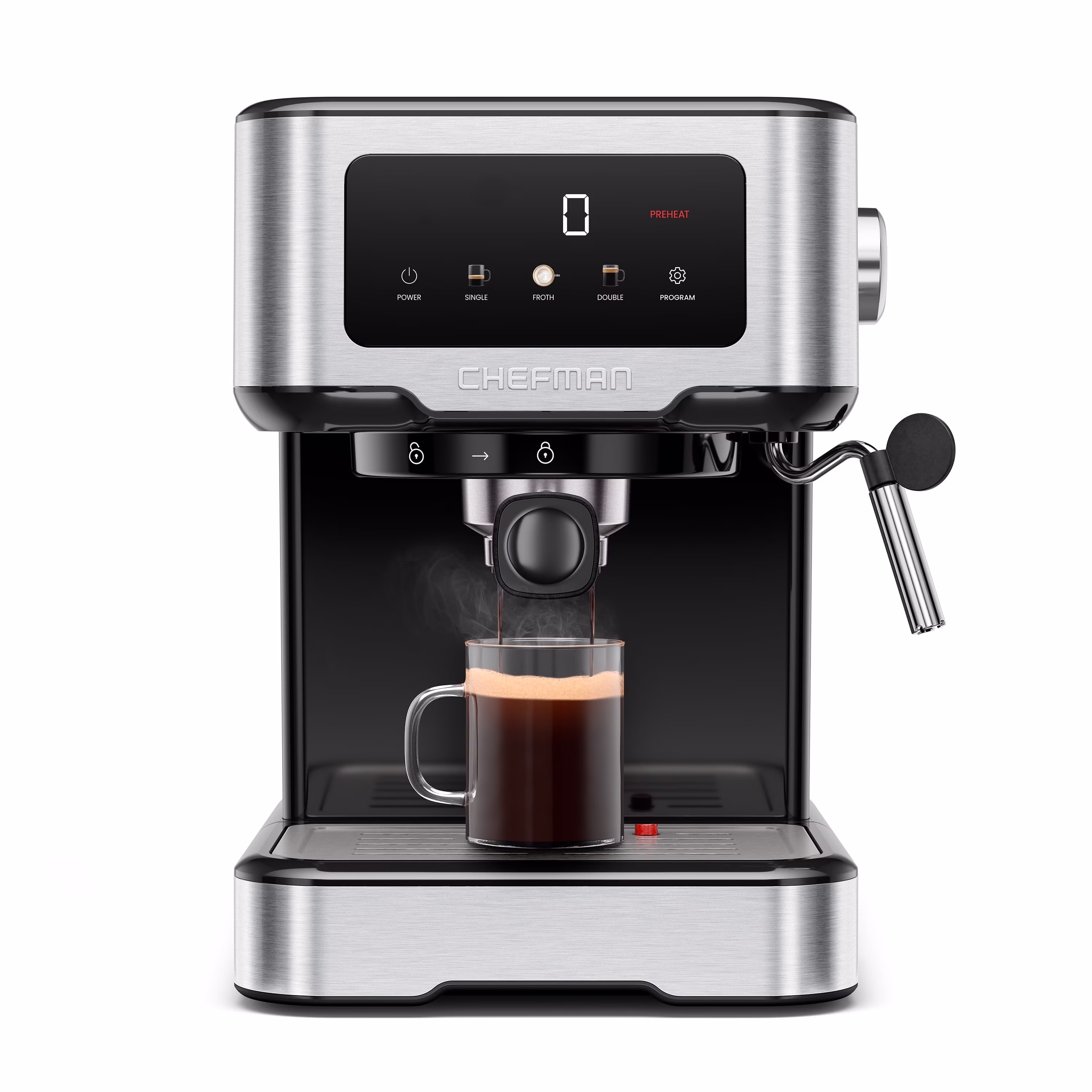- This expertly crafted coffee machine takes your morning cup to the next level. With two shot baskets and a built-in steam wand, you can brew single- or double shots of espresso, cappuccinos, lattes, and more! No more waiting on a coffee pot.