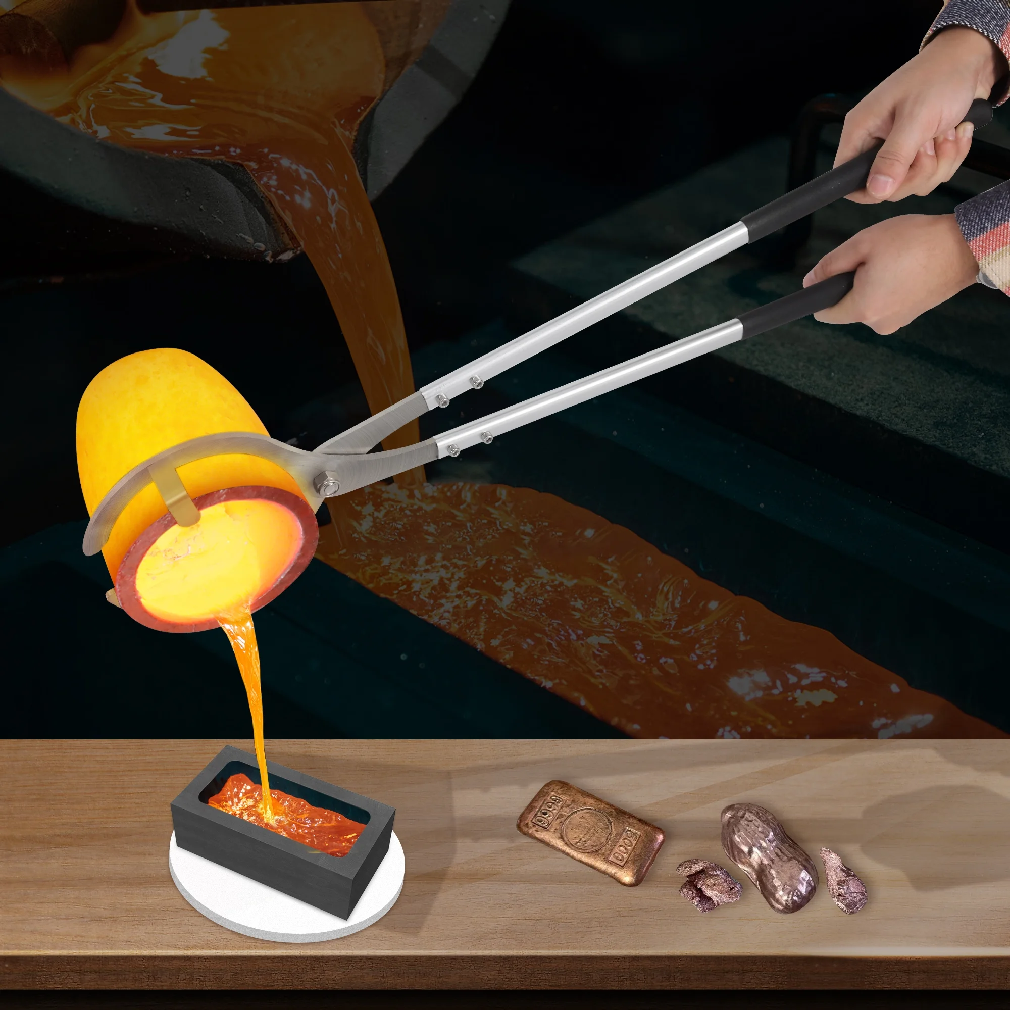 - This melting furnace set is equipped with one lifting tongs and one pouring tongs. It allows you to safely and efficiently clamp the crucible filled with molten metal out of the furnace and pour the molten metal from the crucible into the molds