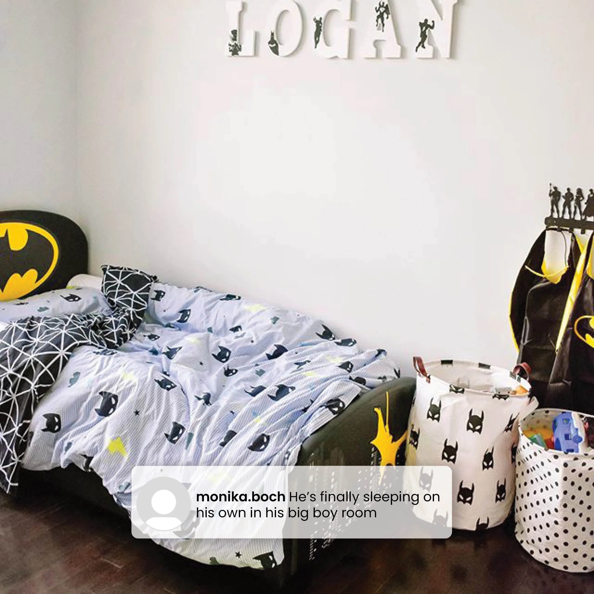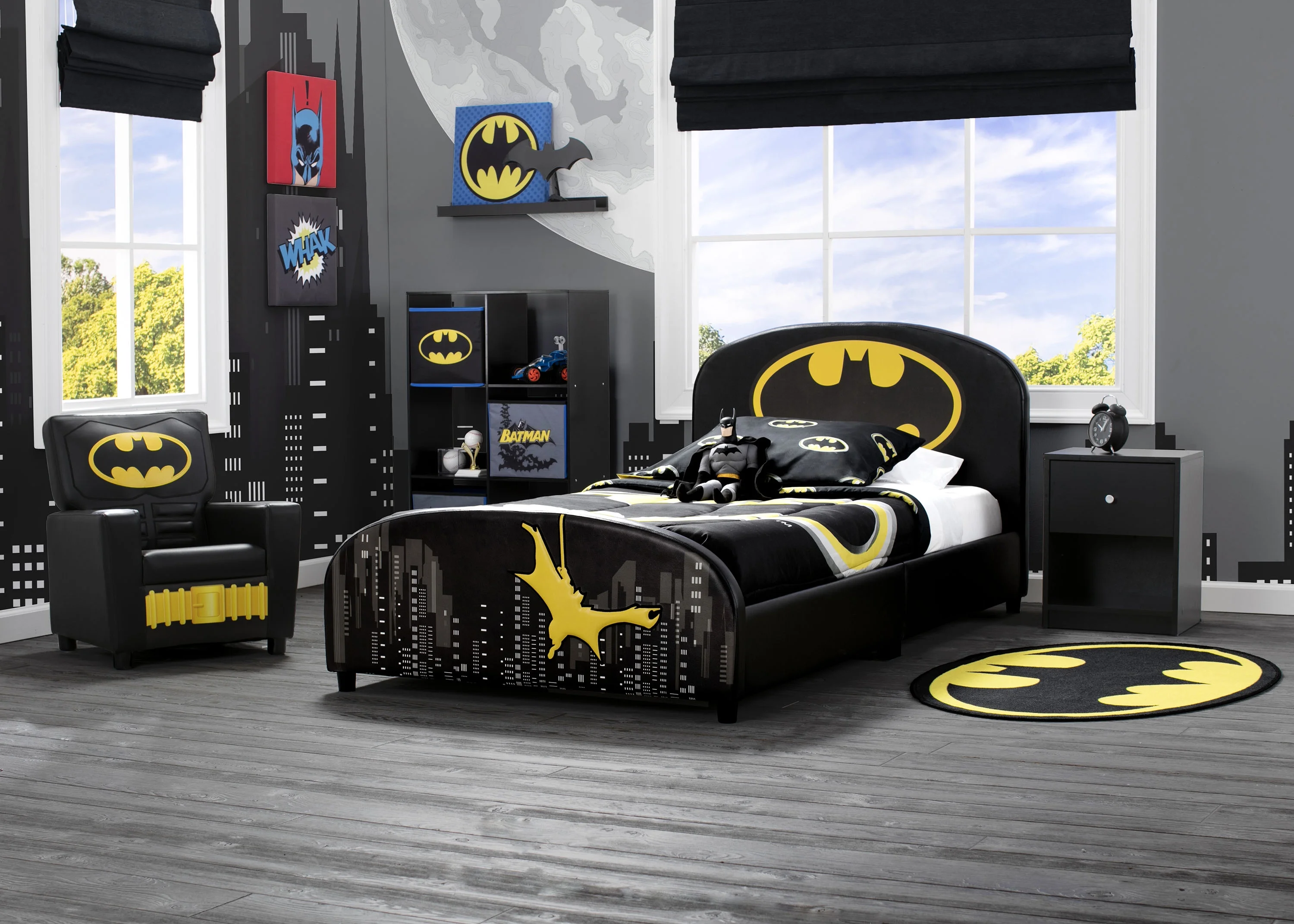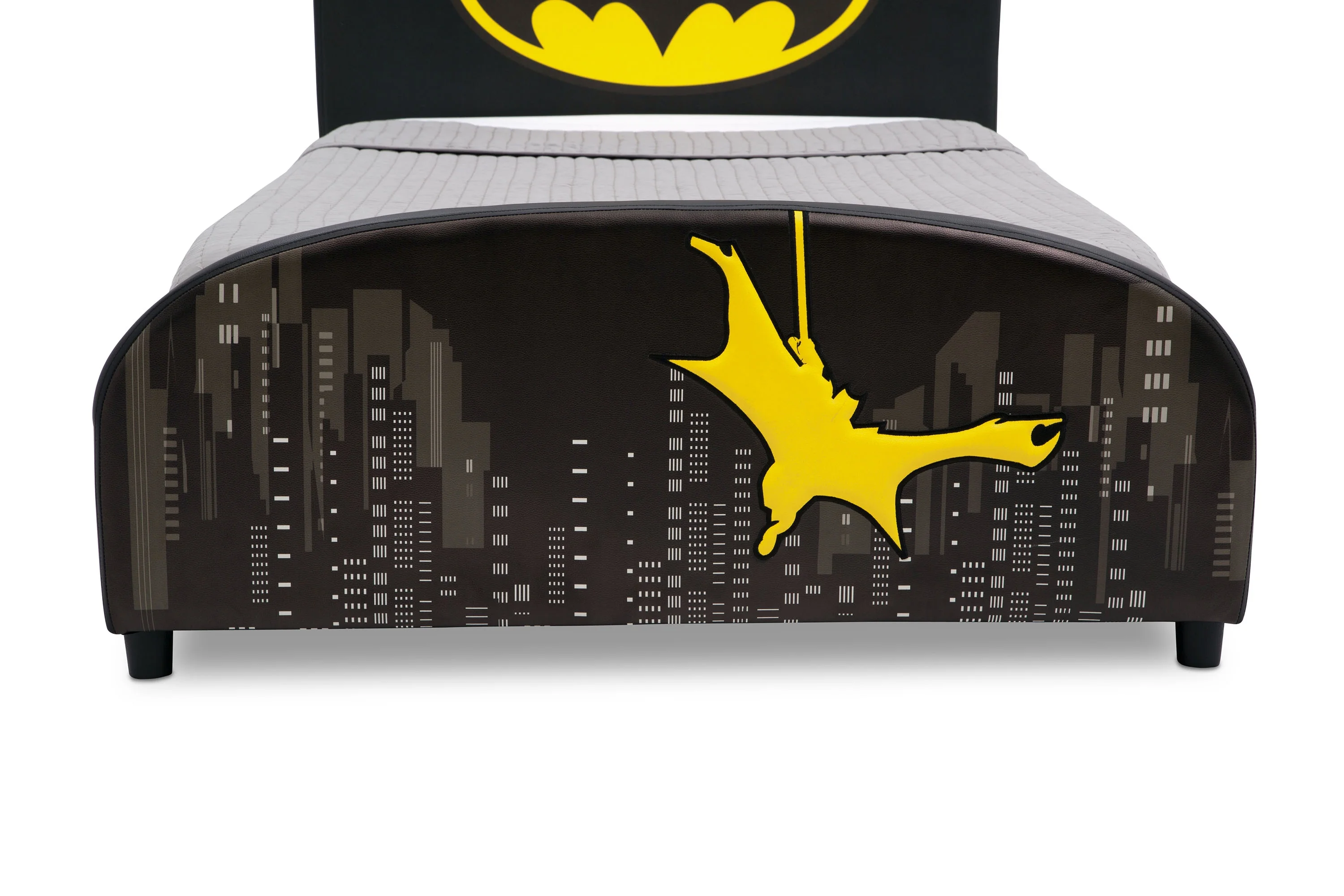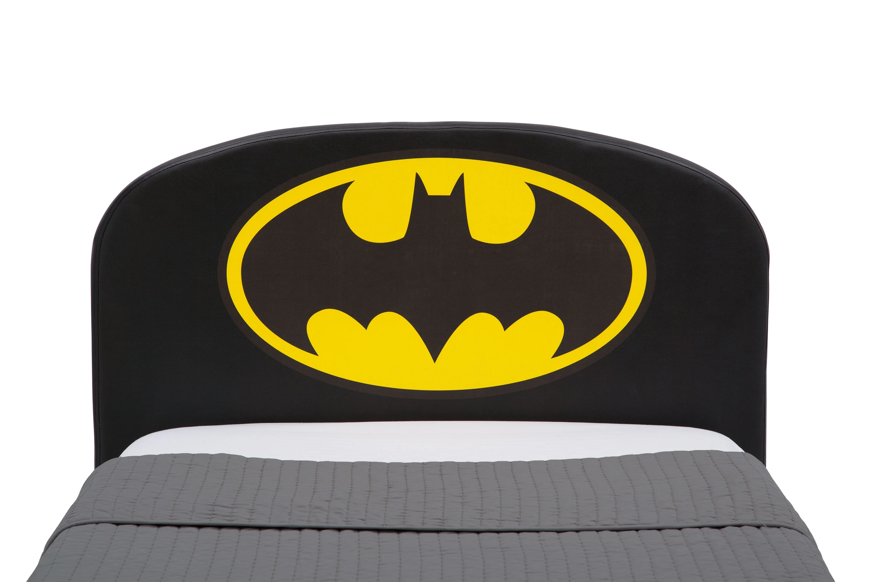 Even superheroes need a comfy place to sleep and the Batman Upholstered Twin Bed from Delta Children is just right for the caped crusader in your life. Designed to add sleek style to any Batcave, this kid's twin bed features a headboard and footboard adorned with the Bat logo, graphics of the Gotham City skyline, and 3 D applique of Batman's silhouette. What makes this twin bed for kids even more super It is constructed with a sturdy wood frame and upholstered in a faux leather fabric to create a cozy and secure sleep space for your little vigilante. About Batman: Dark Knight. Caped Crusader. Sworn protector of Gotham City. Batman goes by many names, but he has only one mission? to become the world's greatest weapon against crime. His powers are Super-sophisticated gear and intelligence. Batman's utility belt and Batmobile help him morph into the ultimate vigilante. Made to KA-POW, Batman furniture from Delta Children adds cool style to your child's space while creating a fun crime-fighting ambiance that's perfect for pretend play.