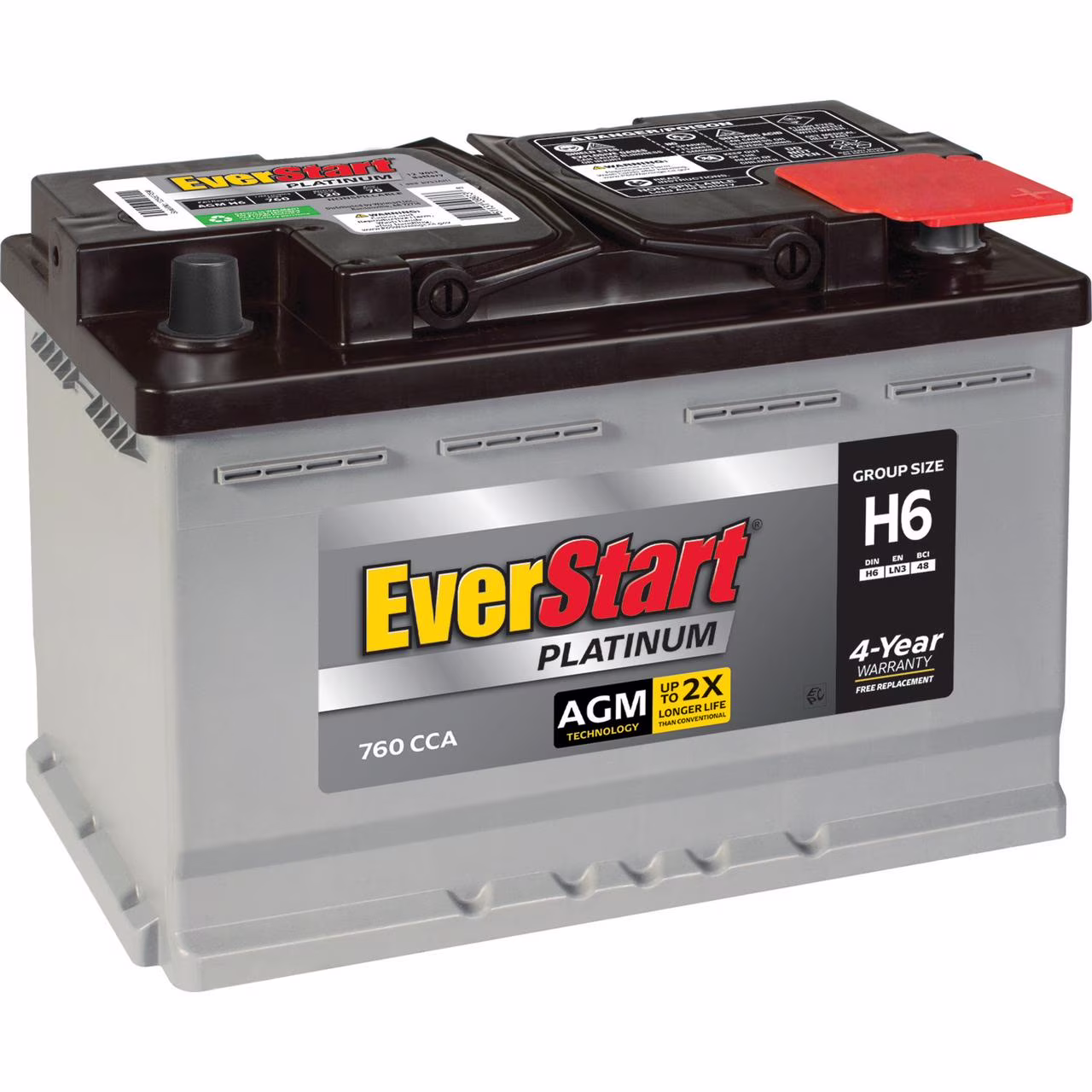 Stay on the go with this The EverStart Platinum AGM battery, Group Size H6. It is the best choice for your power-hungry vehicle and comes with a four year warranty. Electronic features such as DVD players, GPS systems, heated seats, audio systems and start-stop technology all add to the demand on a battery. Every additional electronic component creates a power draw, which leads to more discharge and recharge cycles, which shorten the lifespan of ordinary batteries. This 12 volt EverStart Platinum AGM battery delivers 760 cold cranking amps with 120 minutes of Reserve Capacity. They are precision engineered to offer the ultimate combination of reliability, durability, and safety, even under the most demanding applications.