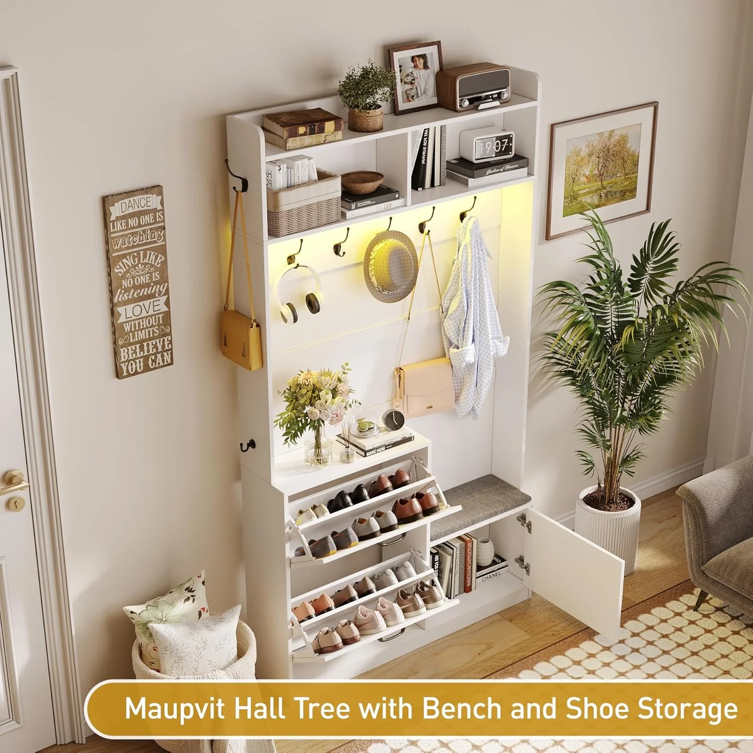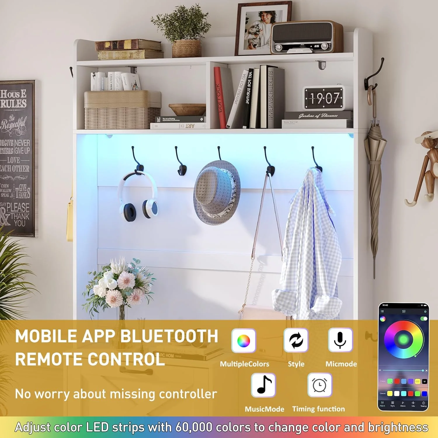 The hall tree includes RGB LED lights with 60,000+ colors and 29 modes, controlled via app. The music sync function adjusts the lights to the beat, adding a fun, personalized touch to your entryway. - ??��Plenty Of Storage Space��