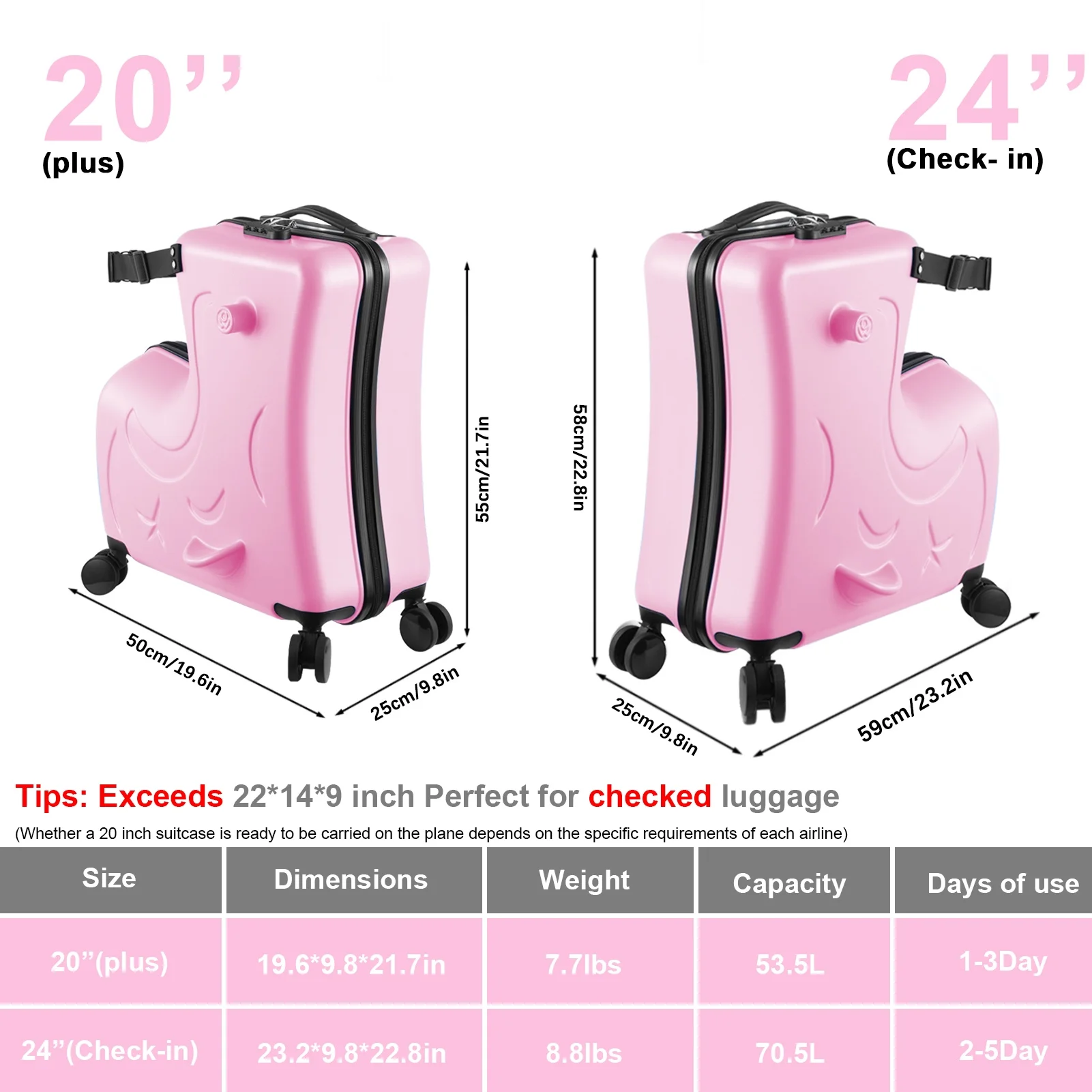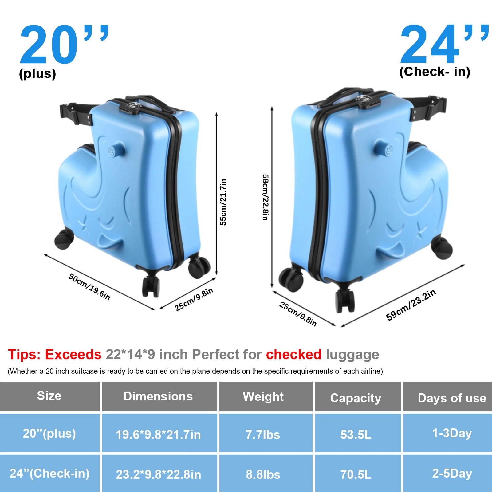 Recommended age: 20-inch suitcase is suitable for children aged 3-6. 24-inch suitcase is suitable for children aged 6-12.