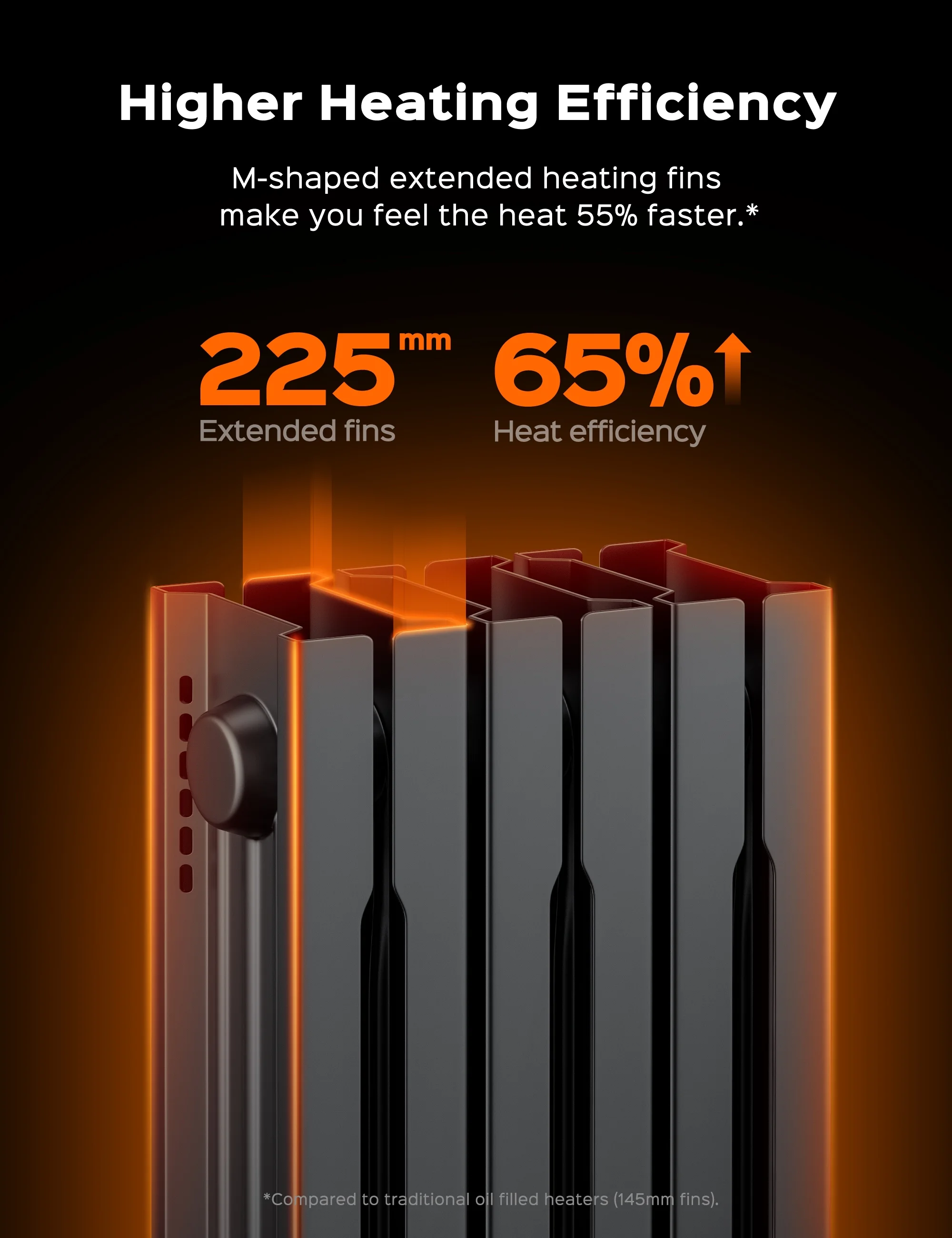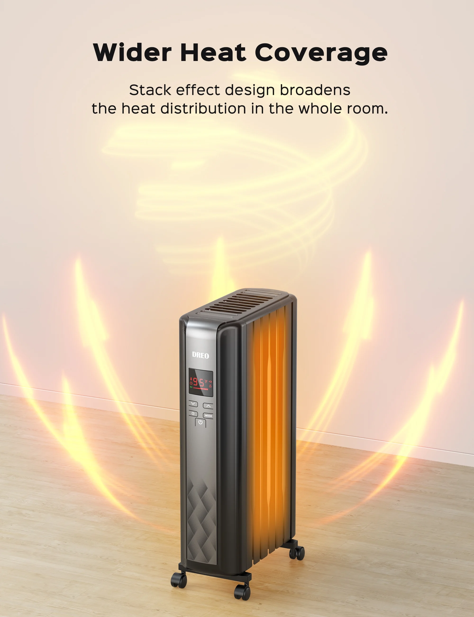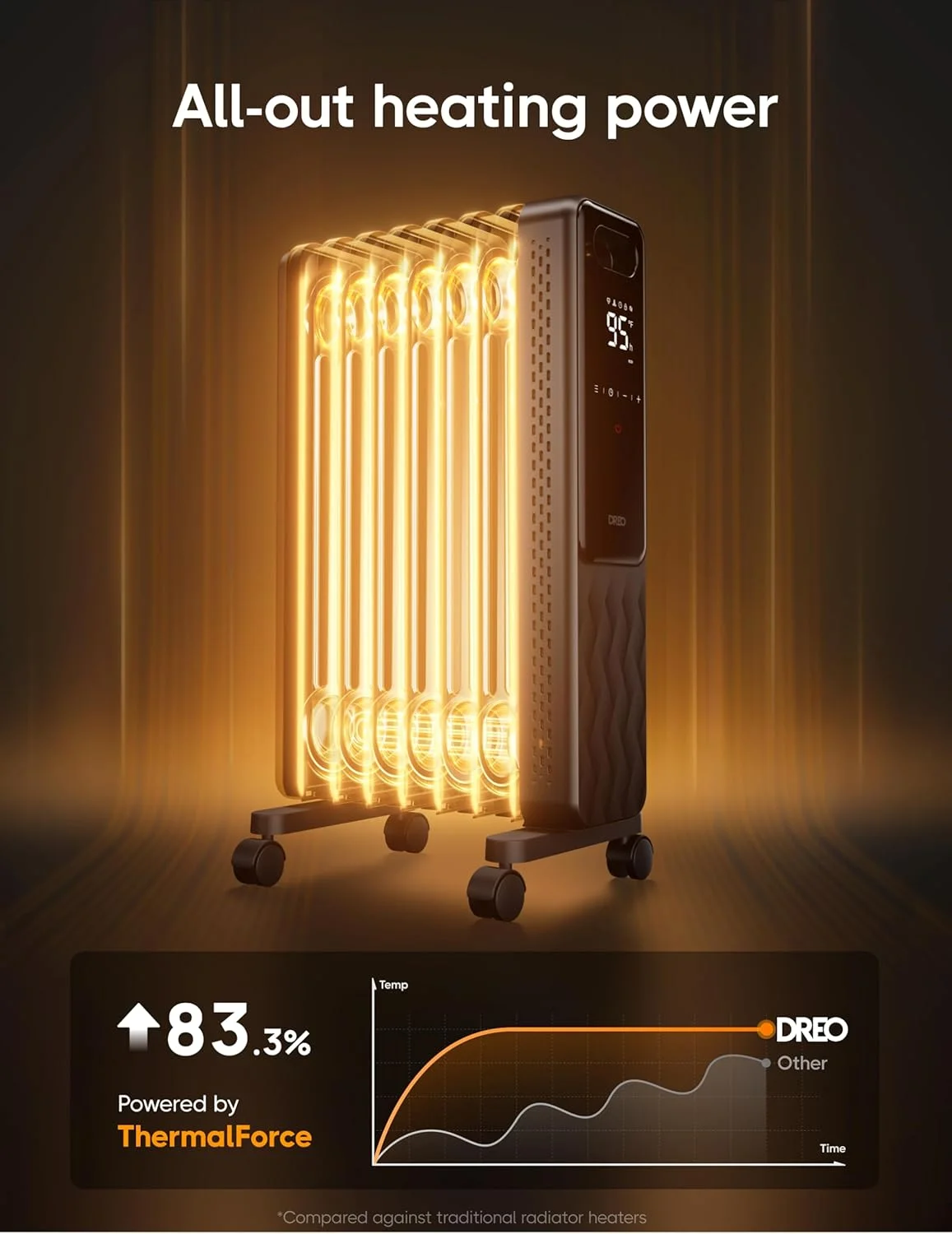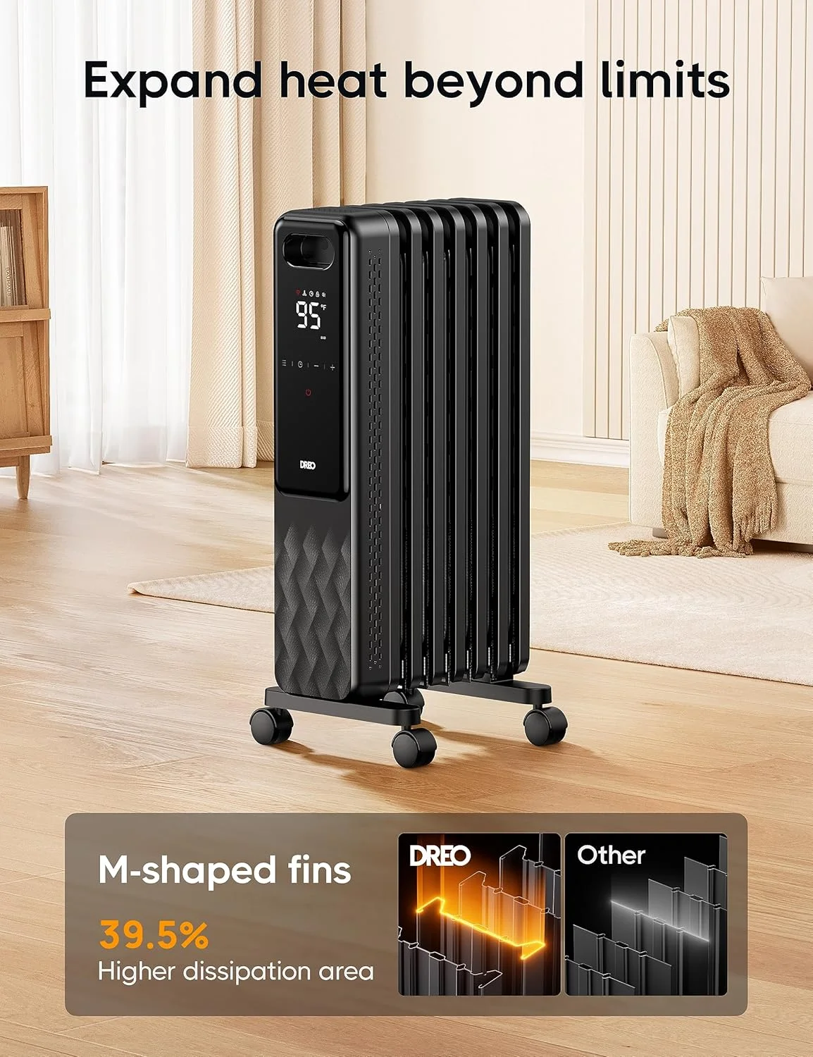 Dreo radiator heater delivers swift and silent heating at 1500W, boosting efficiency by 92.3%. Its 7 advanced fins outpace competitors by 39.49% in heat dispersion. Stay cozy with rapid, quiet, and even warmth.