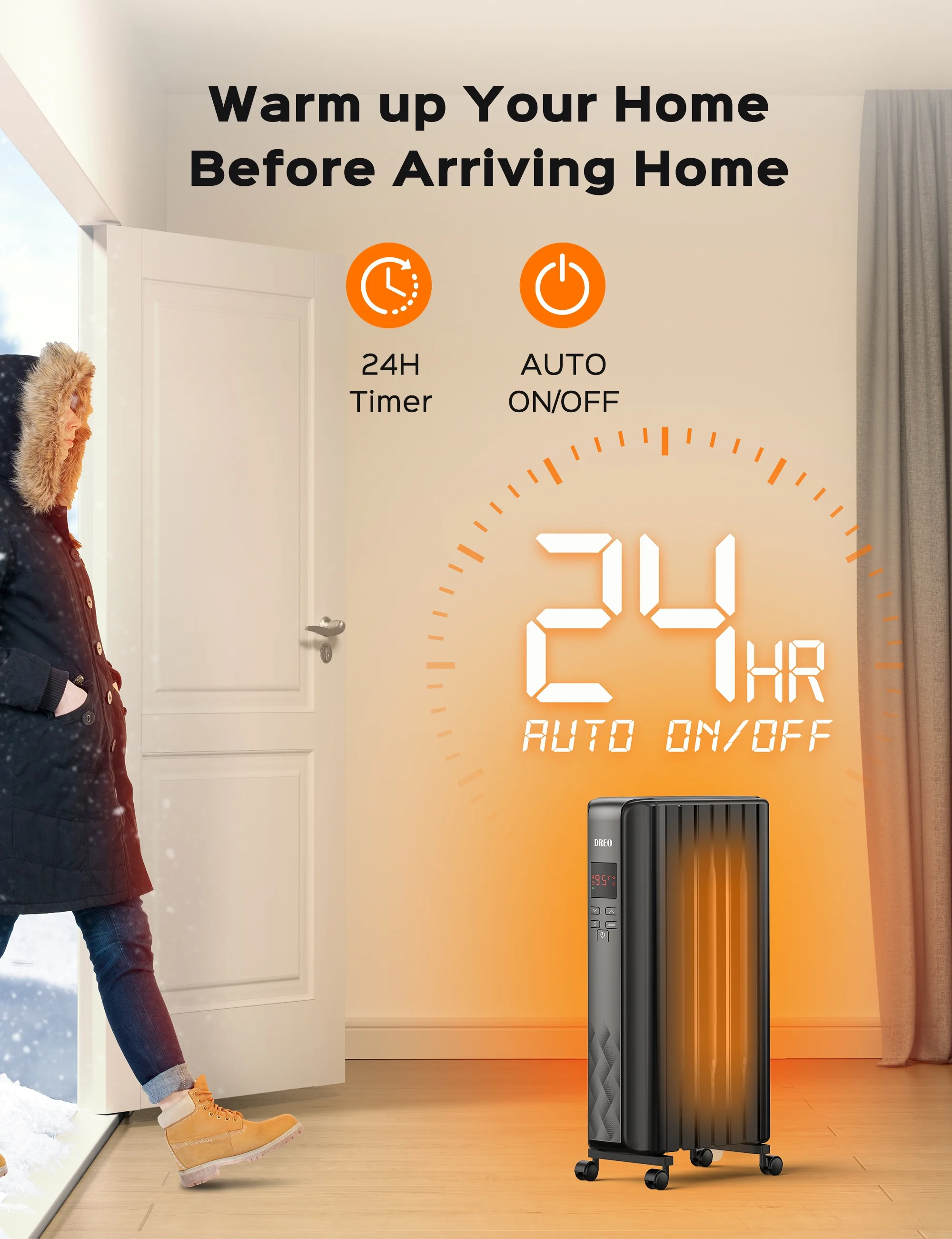 Navigate with ease using the large LED display, touchscreen, or remote control. Dreo glides effortlessly with large wheels and handles for room-to-room warmth. Child lock, mute, and screen-off modes cater to home use. With a 24-hour timer, Dreo radiant heater welcomes you with pre-heated comfort.