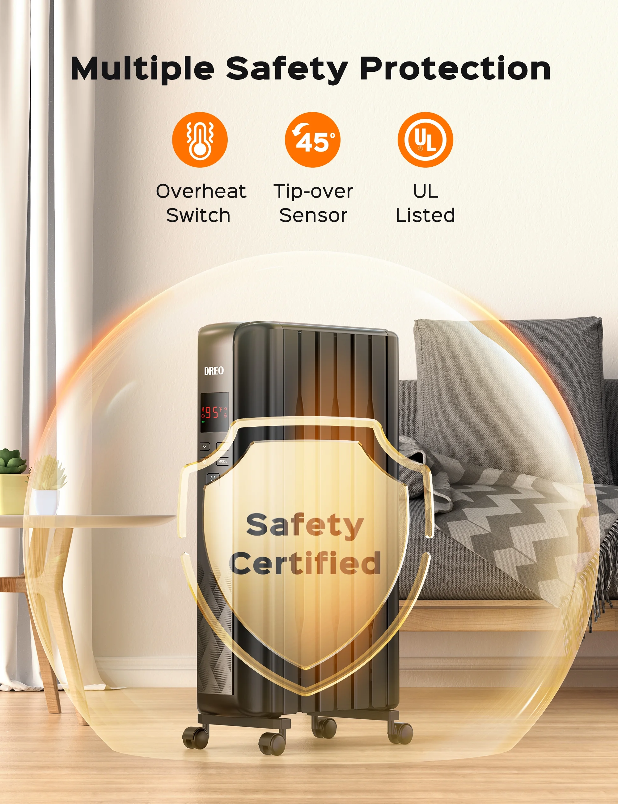 Dreo oil filled heater ensures peace of mind with triple overheat protection, fire-resistant material, and ETL listed. Tilt protection, burn-proof plug, and 7-layer safety checks secure your haven.