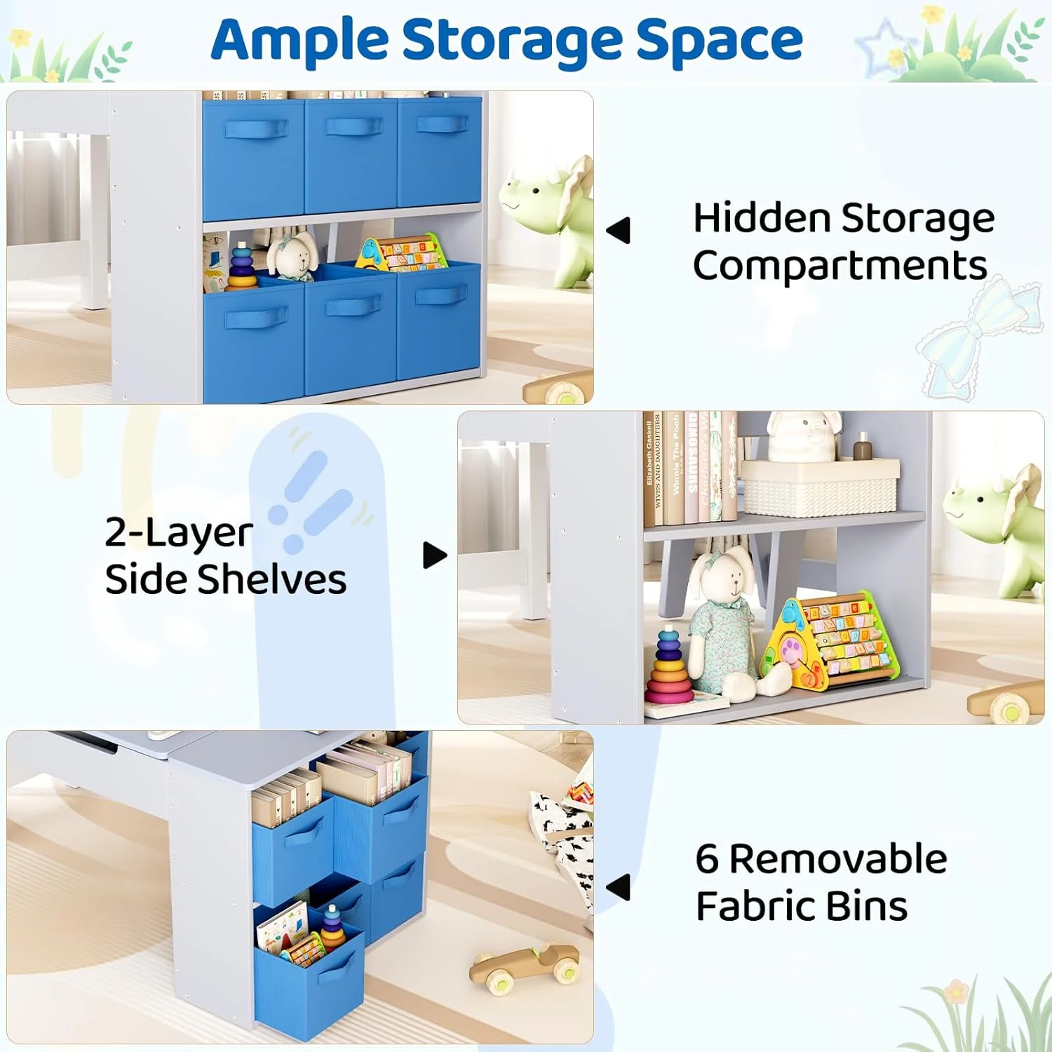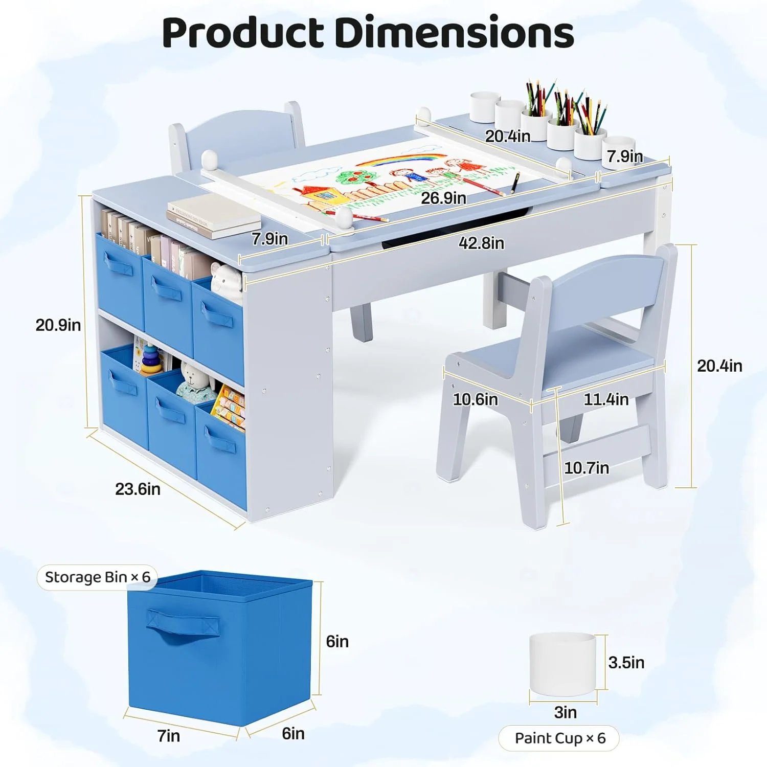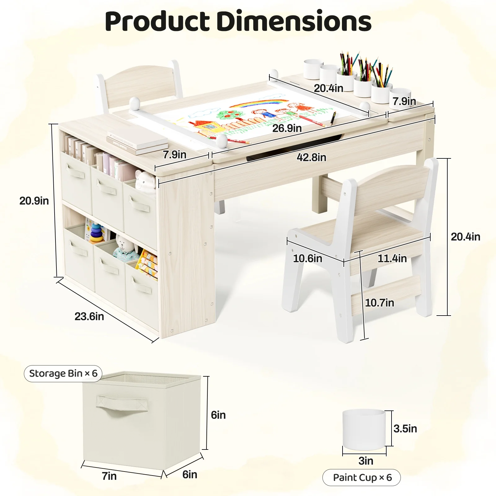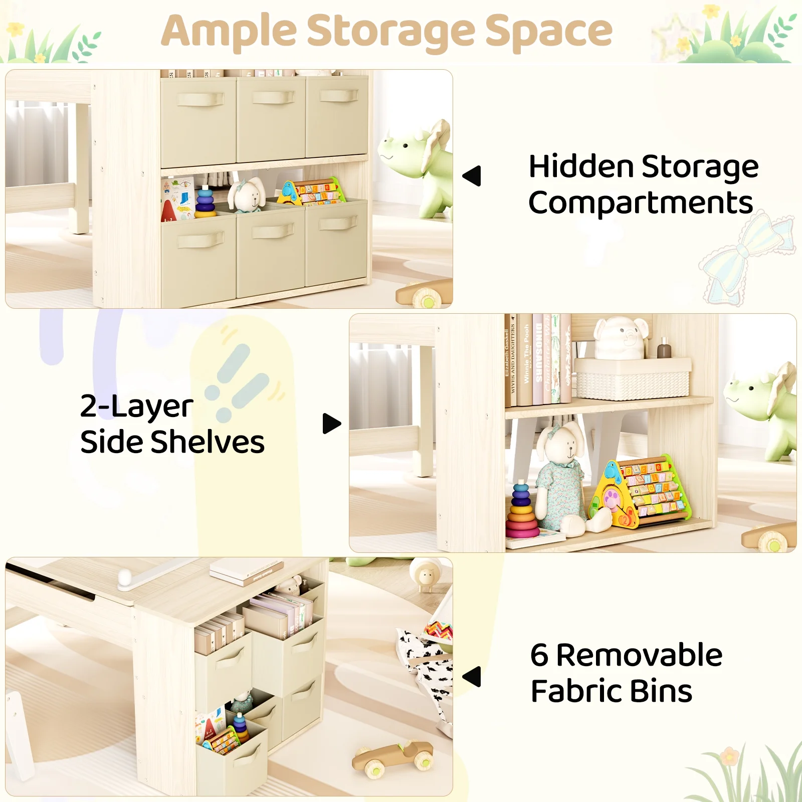 - The craft table includes six fabric storage bins and a hidden compartment for organizing art supplies, stationery, and toys. Six spill-proof paint cups and a paper roll holder are pre-installed for easy access to materials while promoting tidiness. This kids table set keeps creativity spaces clutter-free across all activities.