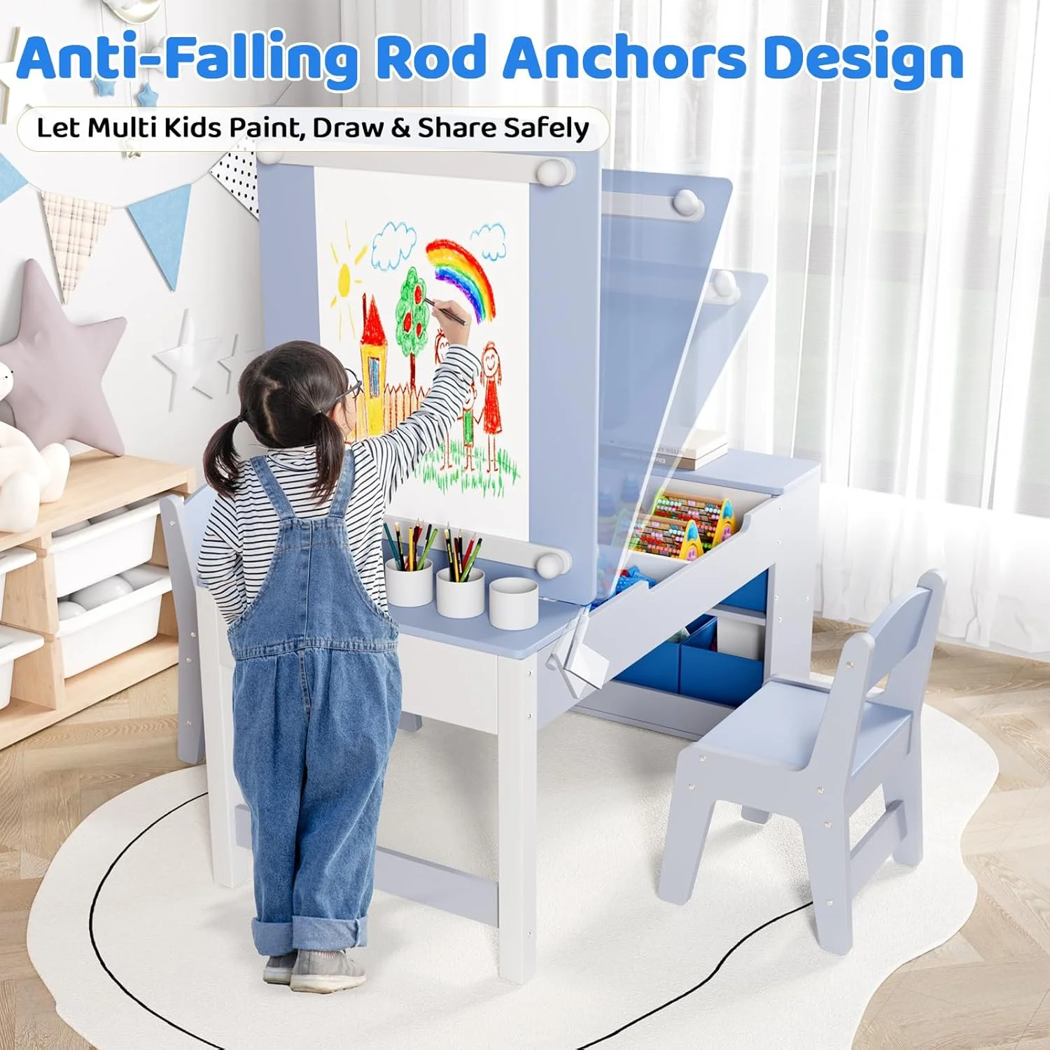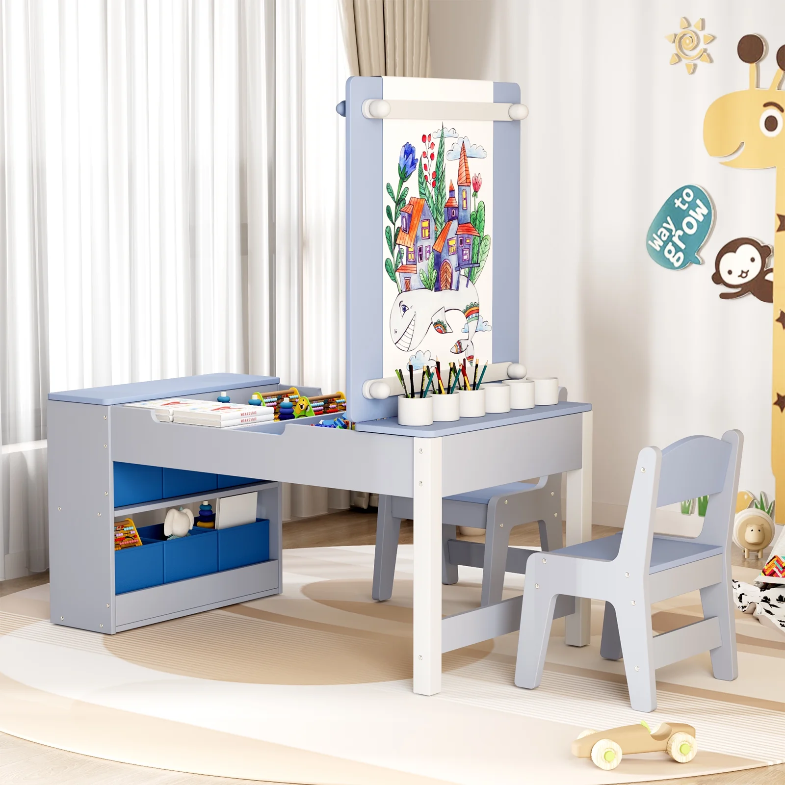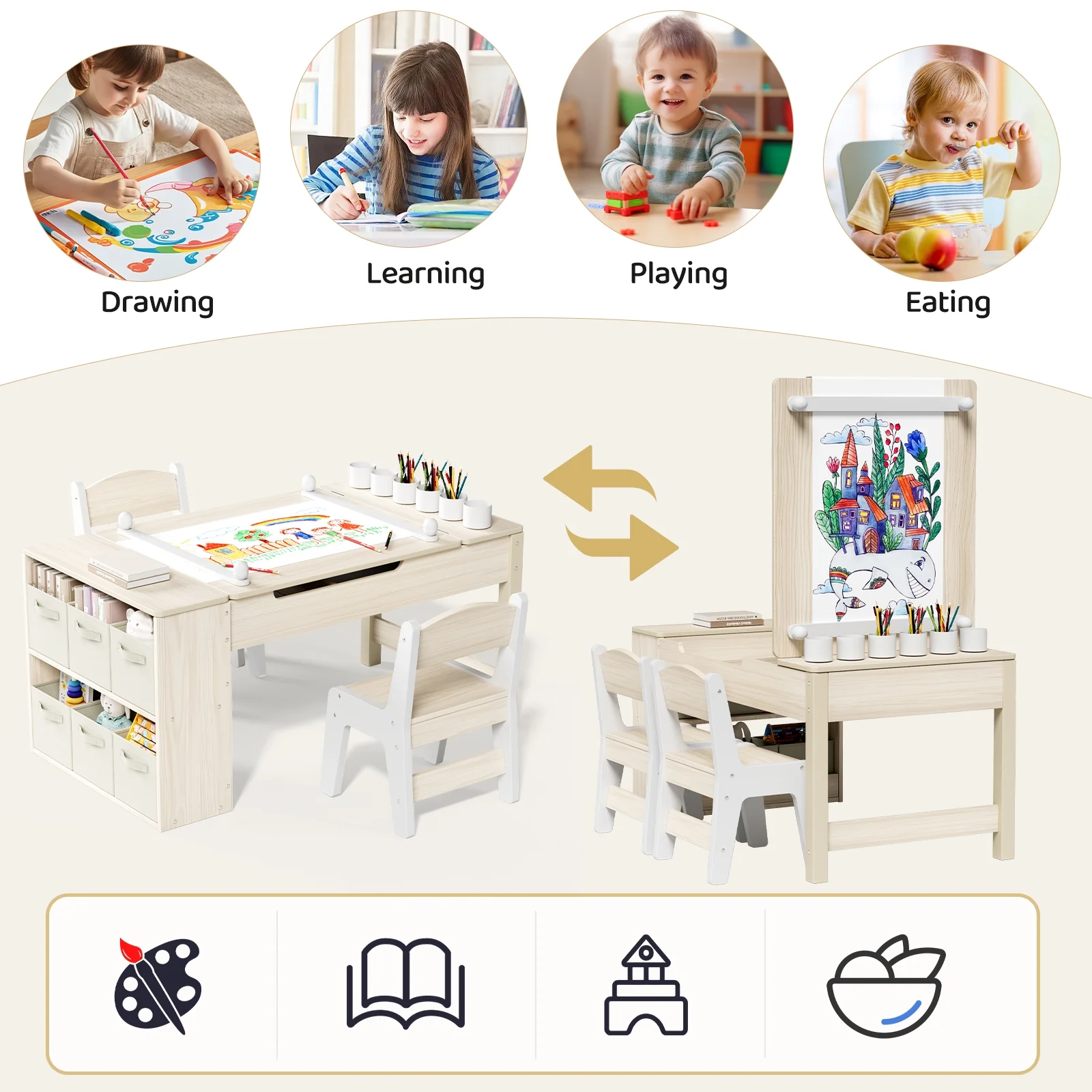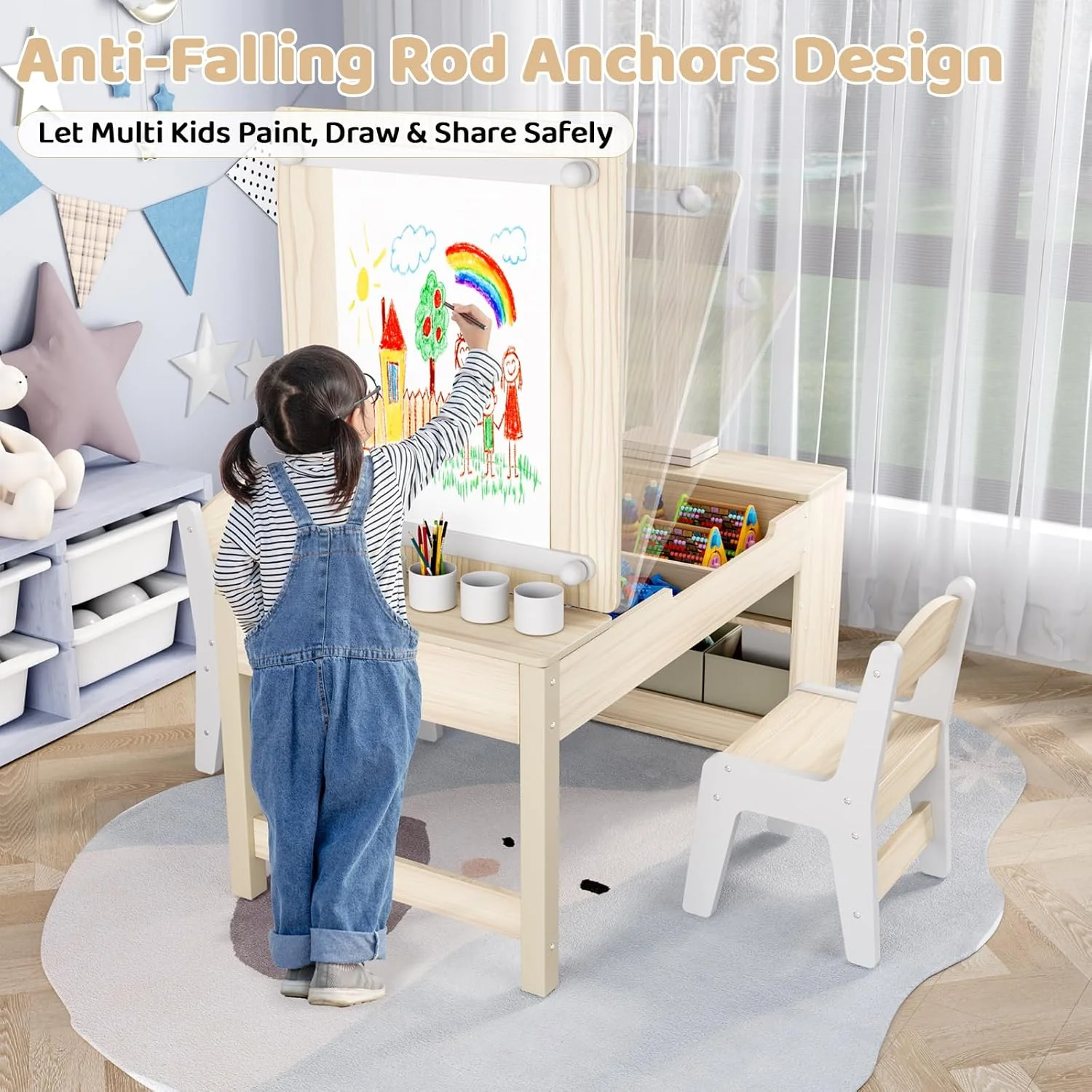 LAZY BUDDY Kids Art Table and 2 Chairs Set, 2 in 1 Easel & Toddler Craft Table and Chairs Set with Storage Bins, Paint Cups and Paper Roll, Activity Table Set for Children 3+
