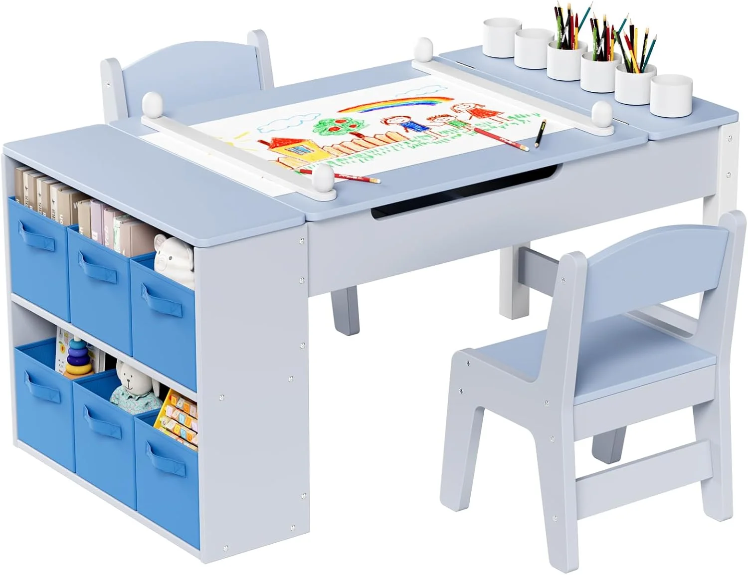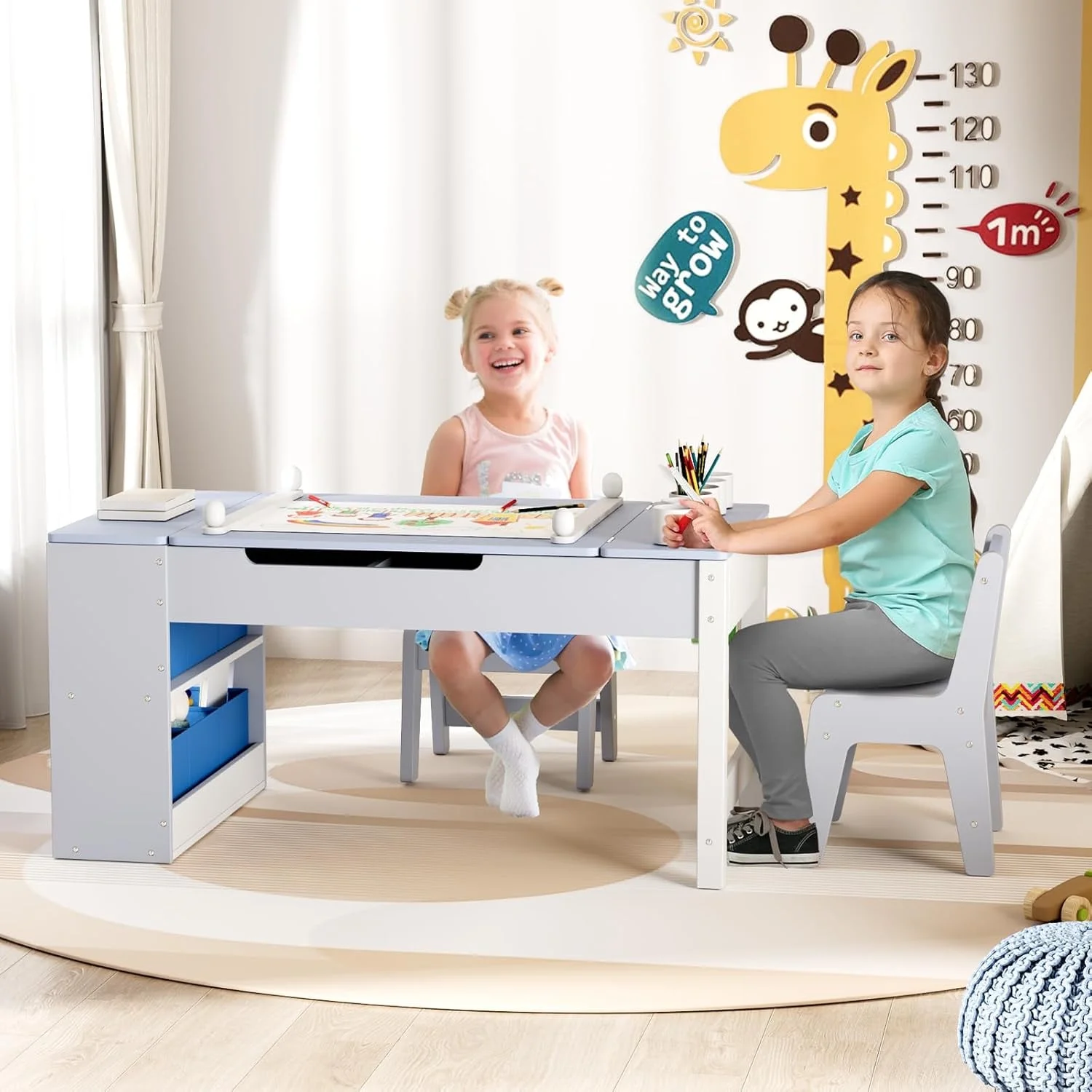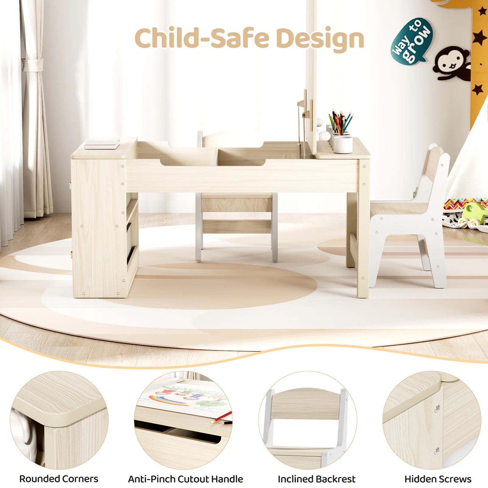 LAZY BUDDY Kids Art Table and 2 Chairs Set, 2 in 1 Easel & Toddler Craft Table and Chairs Set with Storage Bins, Paint Cups and Paper Roll, Activity Table Set for Children 3+