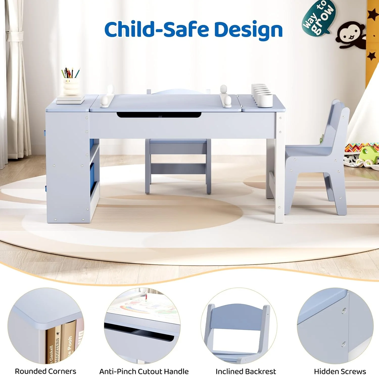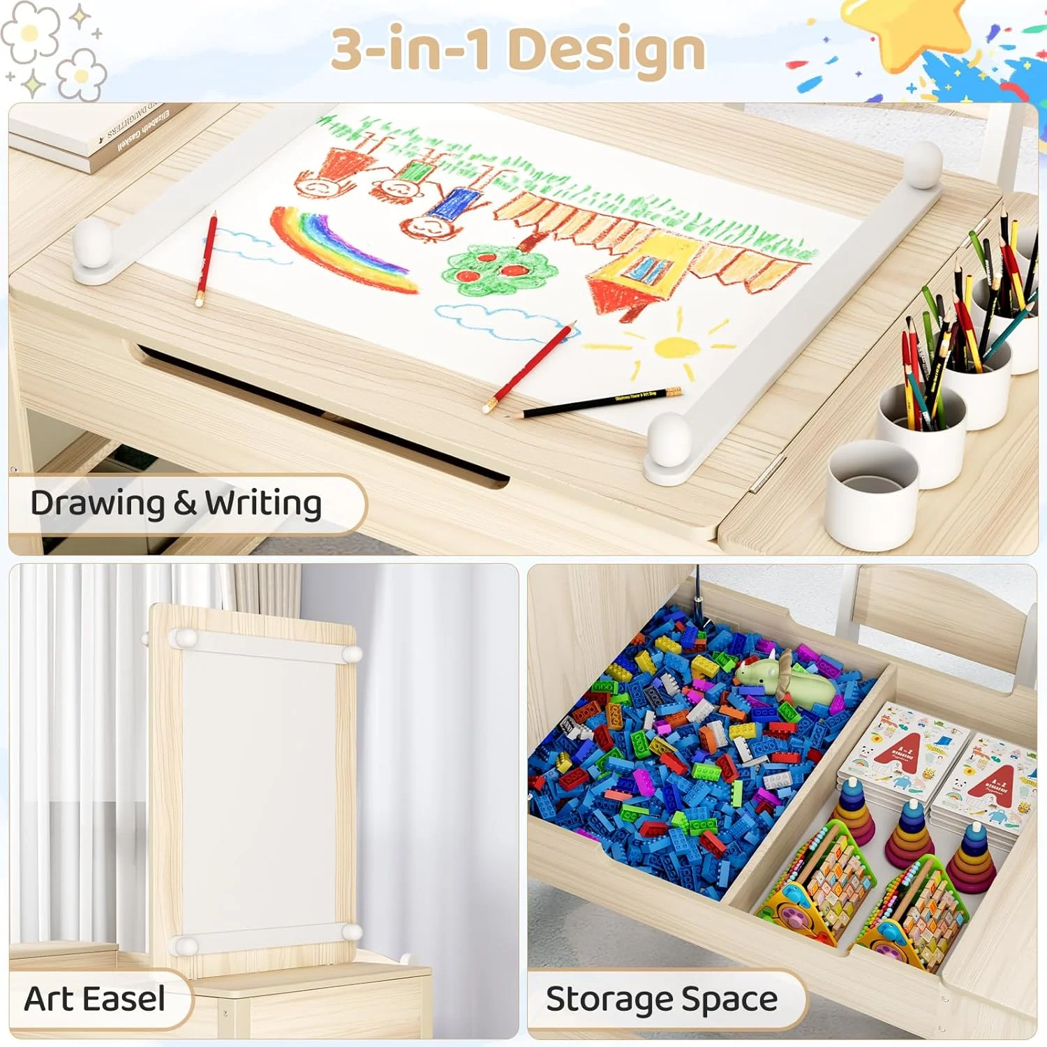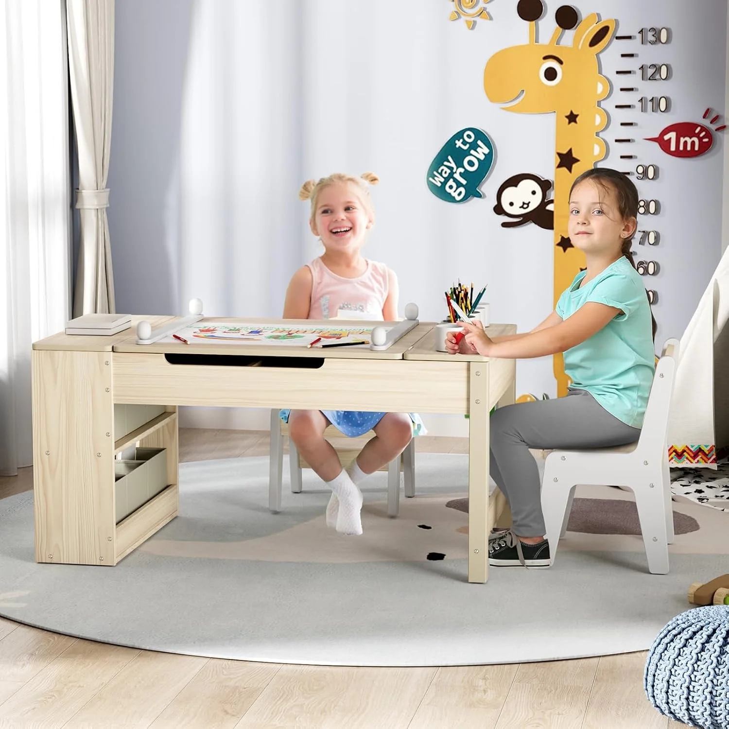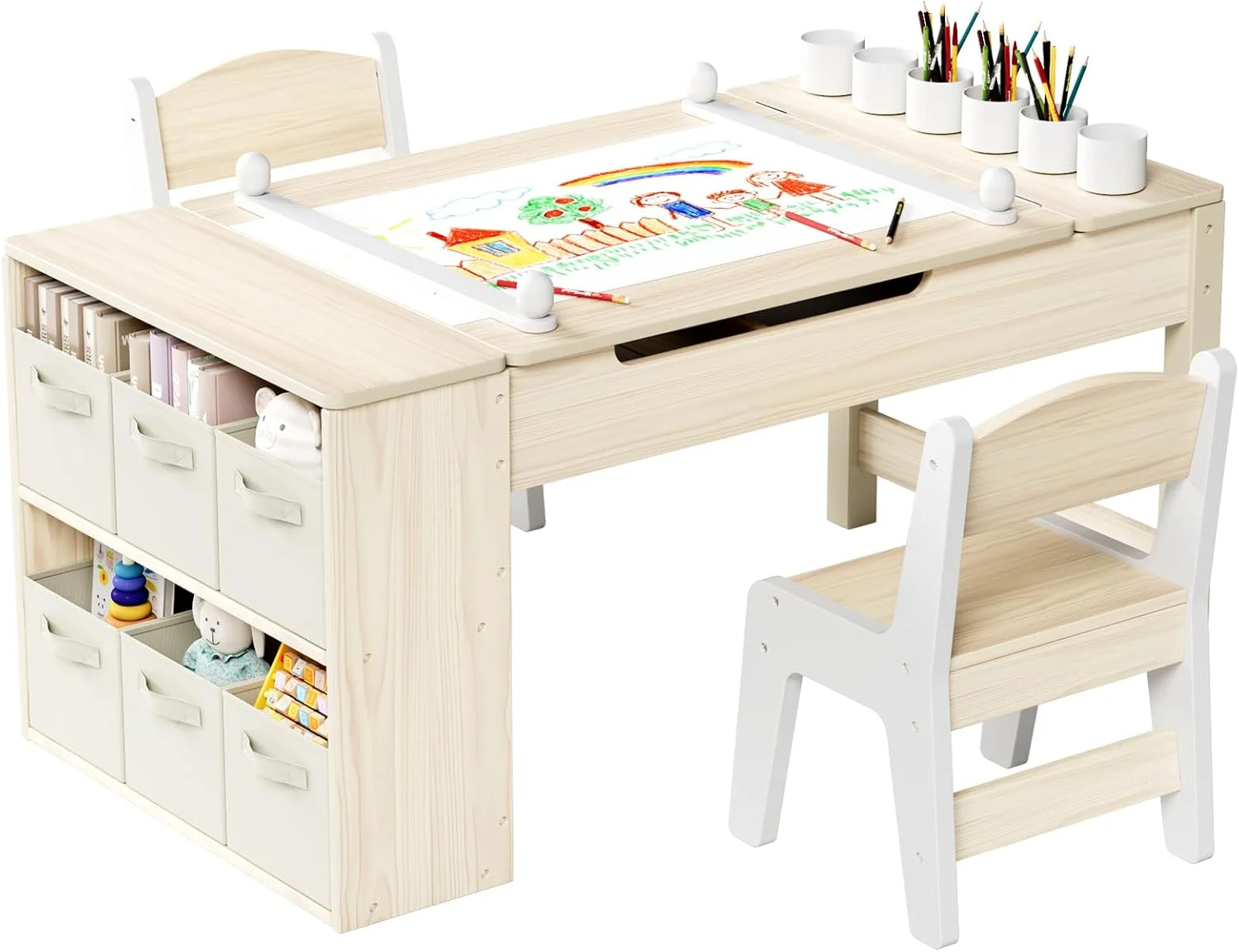 LAZY BUDDY Kids Art Table and 2 Chairs Set, 2 in 1 Easel & Toddler Craft Table and Chairs Set with Storage Bins, Paint Cups and Paper Roll, Activity Table Set for Children 3+