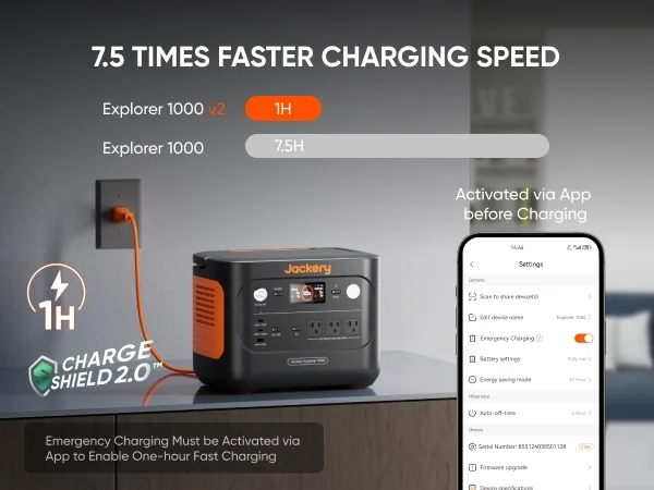 - Charge your Explorer 1000 v2 Portable Power Station from 0% to 100% battery level in just 1 hour, with state-of-the-art fast charging, managed conveniently via Jackery��s intuitive App. Engineered with advanced ChargeShield 2.0 technology and with the reliable UL certification - its excellent fire and shock resistance, delivers unmatched safety and complete peace of mind.