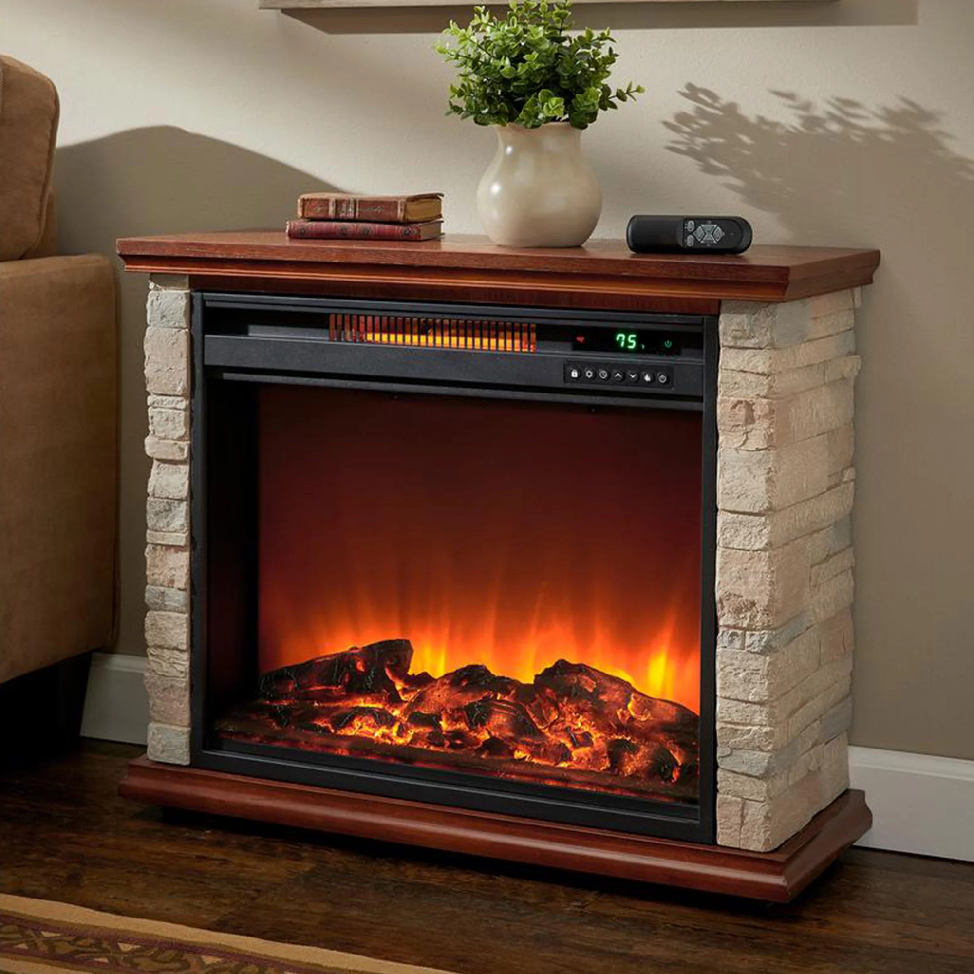 - Stylish and well-crafted faux stone and Oak wood cabinet stays cool to the touch when in use, while the electric fireplace effect has 2 levels of realistic fire glow for added ambiance