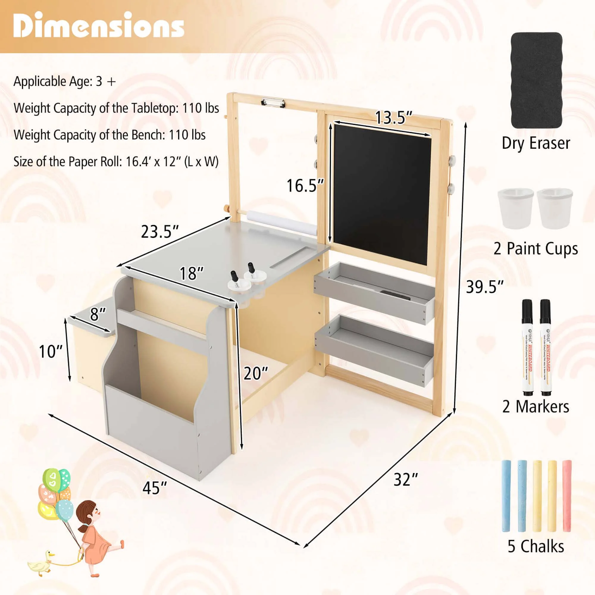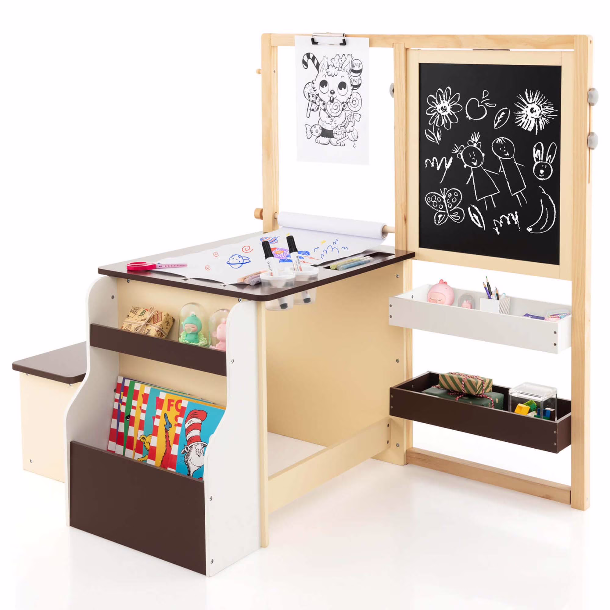 - Multifunctional Kids Art Center: Features a table, bench, and double-sided easel for drawing, playing, learning, or eating