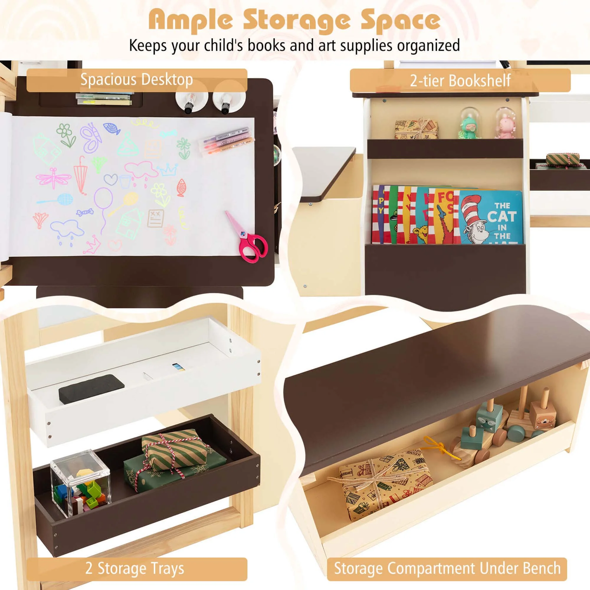- Ample Storage Space: Includes 2 cup holders, 1 pen slot, 2 storage trays, 1 hanging hook, an under-bench compartment, and a bookshelf for organizing art supplies, toys, or books