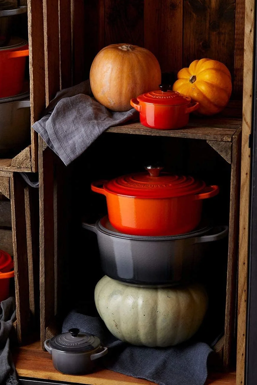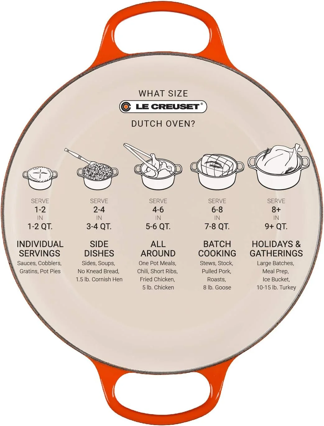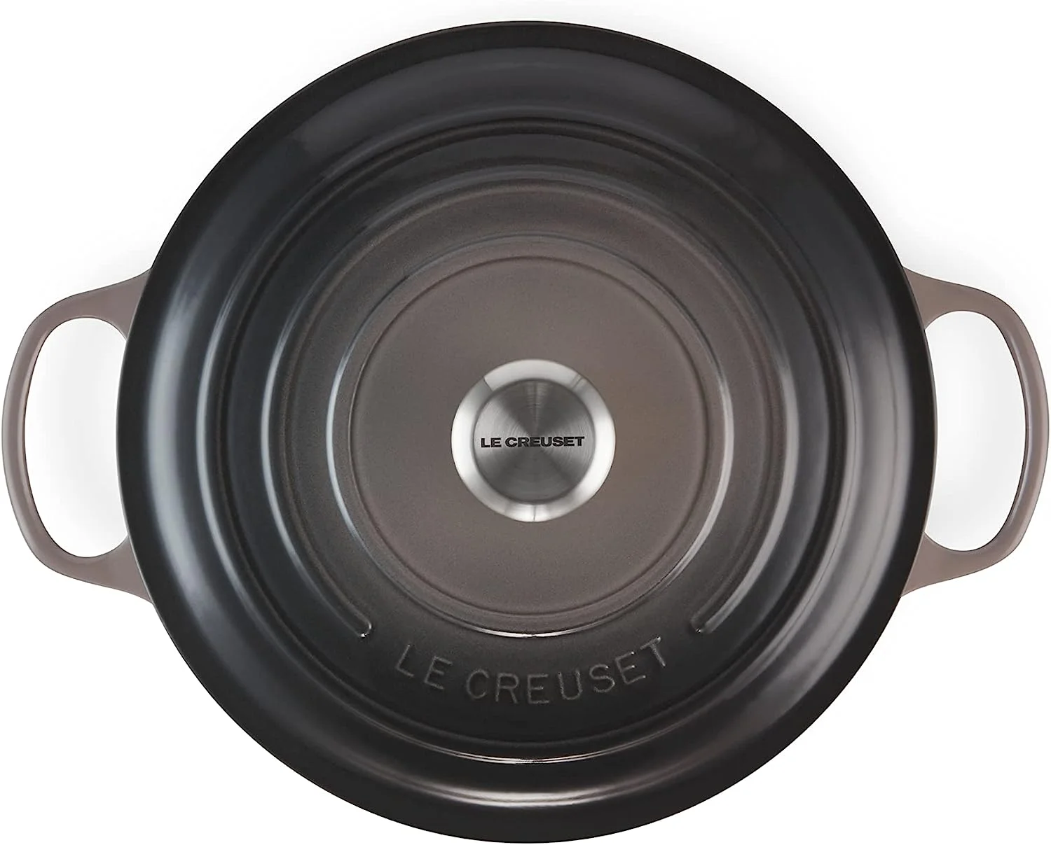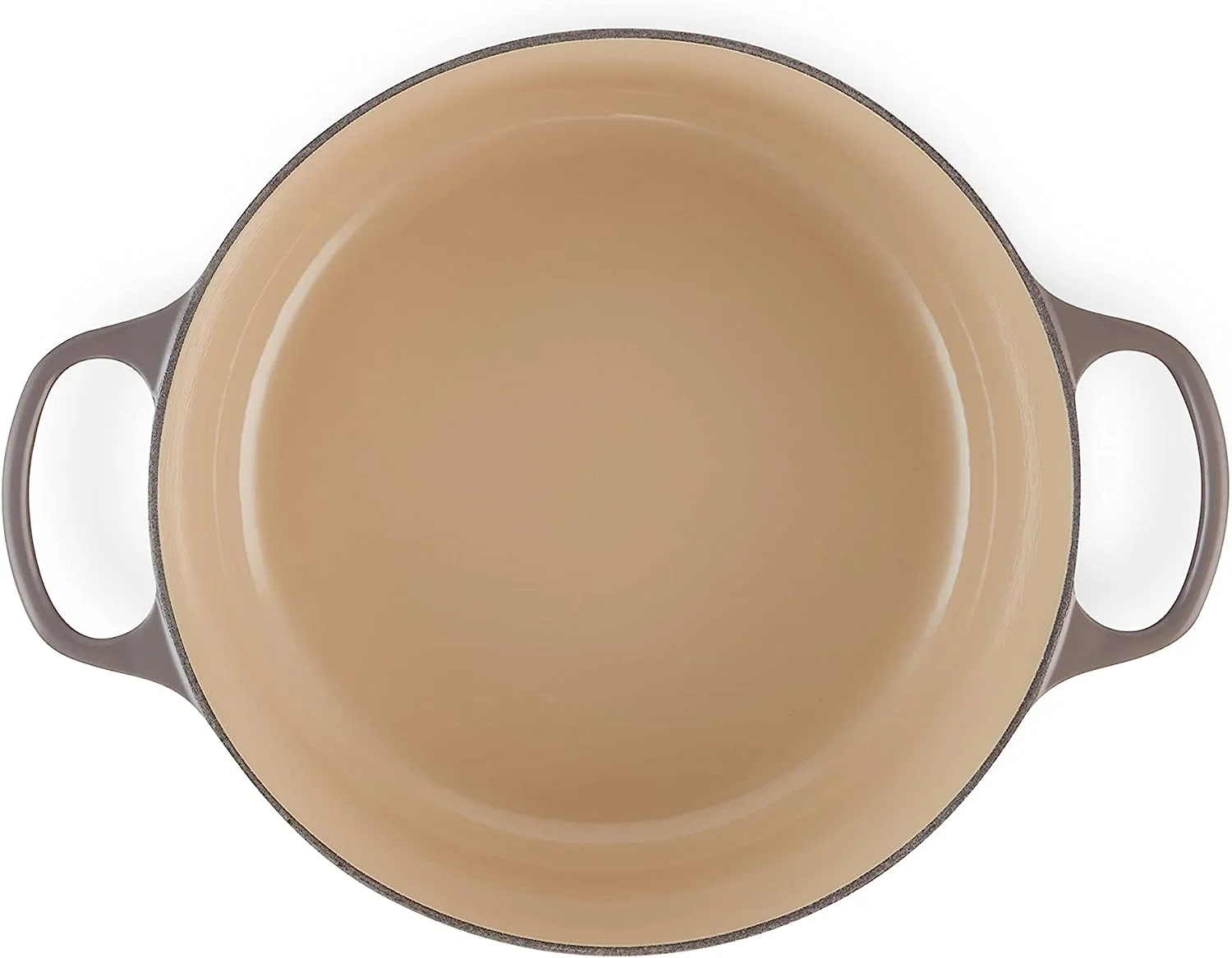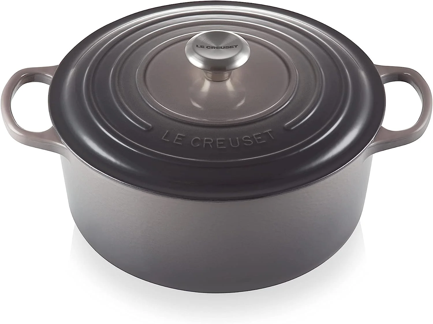 Le Creuset Enameled Cast Iron Signature Round Dutch Oven, 7.25 qt., Oyster["Enameled cast iron delivers superior heat distribution and retention","Ready to use, requires no seasoning","Easy-to-clean and durable enamel resists dulling, staining, chipping and cracking","Light colored smooth interior enamel allows easy monitoring of cooking progress","Tight-fitting lids are specially designed to circulate steam and return moisture back to the food","Ergonomic knobs and handles are designed for easy lifting","Stainless steel knob is safe at any oven temperature","Lightest weight cast iron by quart on the market","Compatible with all cooktops and oven-safe up to 500F","Safe for dishwasher and metal utensils"]