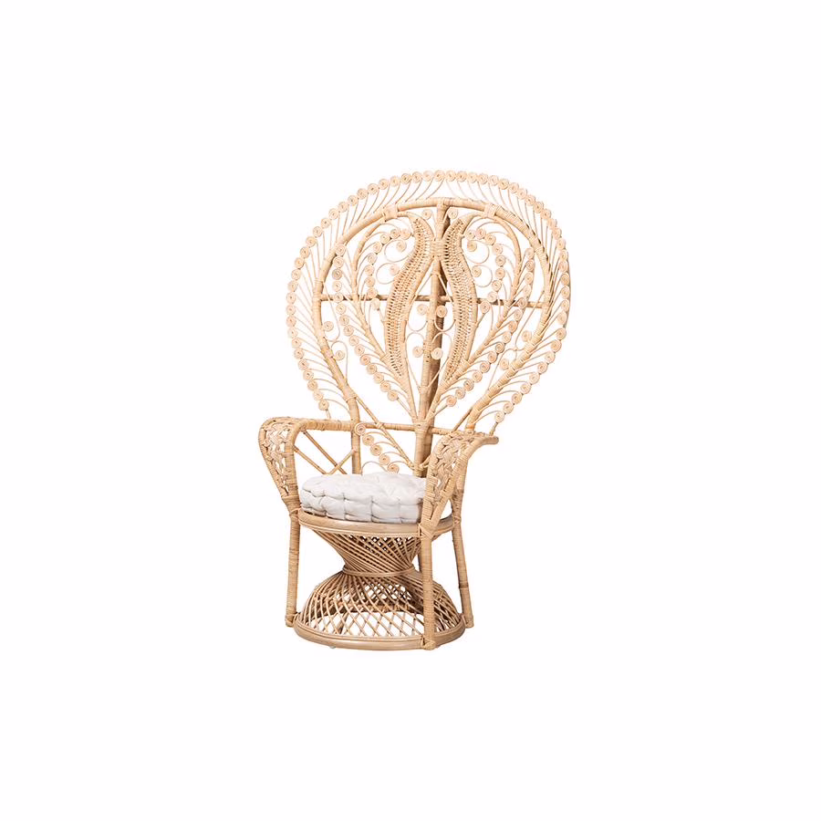 Whimsical yet soothing design transforms the mood of any layout with the outstanding Fedra peacock accent chair. Made in Indonesia, this boho piece is expertly crafted from natural rattan. The grand backrest features curling rattan poles for a stunning yet smooth display while a plush, fabric upholstered seat cushion provides a cozy embrace. The Fedra will arrive fully assembled and features ergonomic armrests for enhanced relaxation. A stunning injection of beauty and comfort perfect for a cozy sun room or patio, the Fedra peacock accent chair bestows an extraordinary quality to any space.Due to the nature of the natural materials used in this product, it may have variations in areas such as, but not limited to, color, pattern, grain and texture. The hair-like strands of rattan/rattan-fiber are common due to nature of the material.