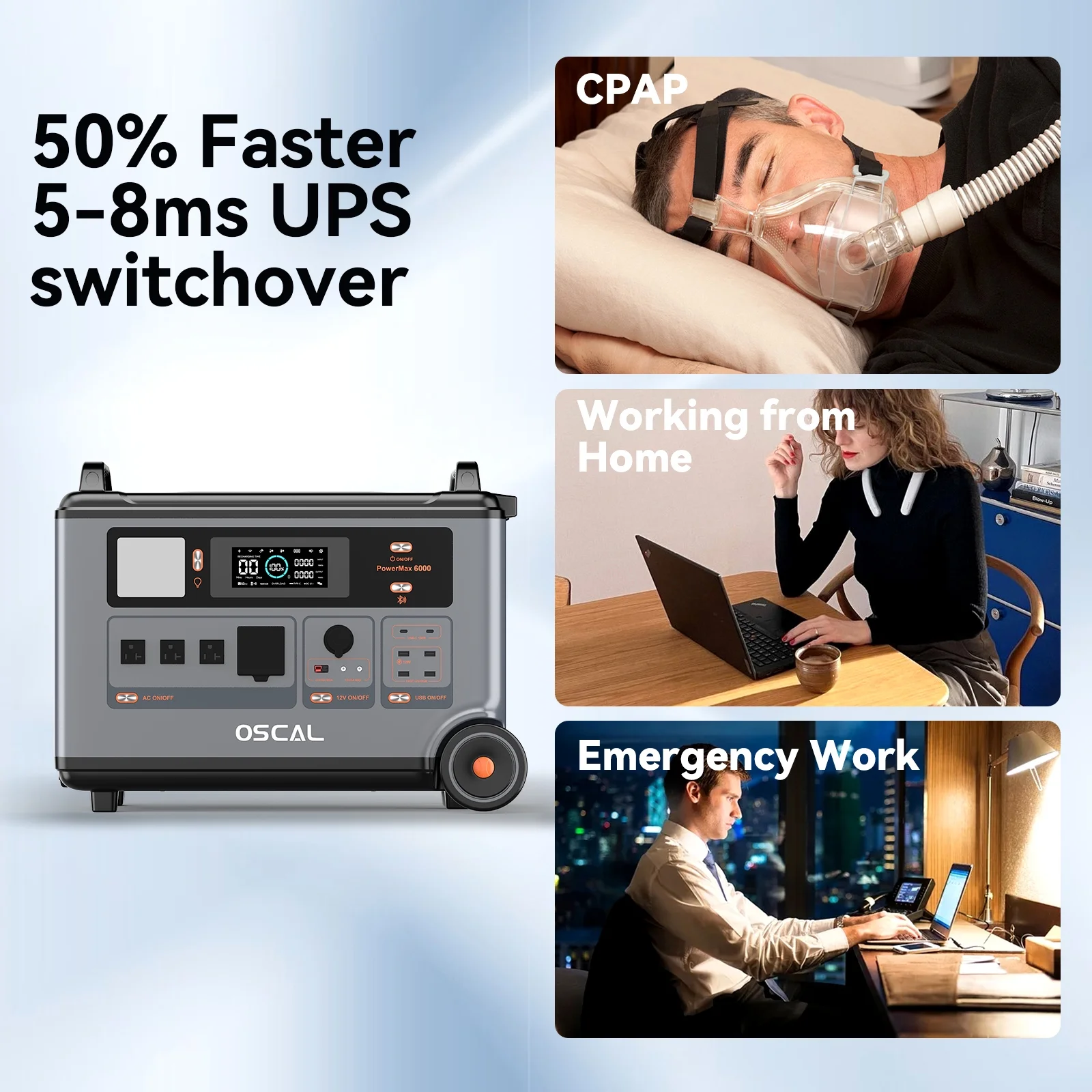 OSCAL P6000 Solar Generator with 4400W Solar Panels, 6000W 120V/240V Dual Voltage Power Station, 3600wh LiFePO4 Battery (Expandable to 57.6kwh), 2200W Fast Charging, Home Backup & RV Use