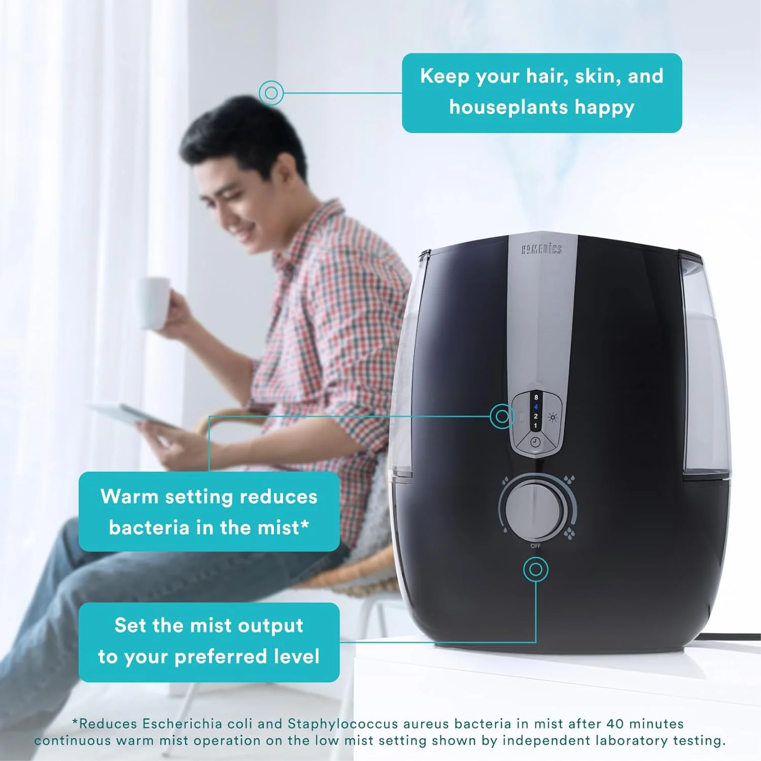 - CUSTOMIZABLE HUMIDIFIER: Homedics Designed this humidifier with a Large 1.4 gallon tank which has a runtime of up to 65 hours; It Features a Warm or Cool mist function, nightlight, built in Timer, auto shutoff Protection, and an adjustable mist output setting; Program this device to Power down after 1, 2, 4 or 8 hours of use; Or if you forget to set the Timer, Your unit will Power down Automatically when it gets low on Water.