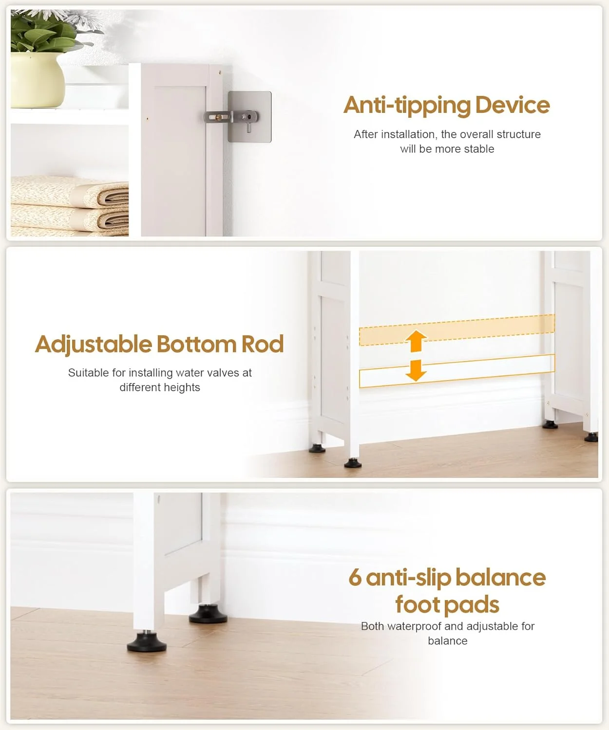 Stability: The Over the toilet storage Cabinet comes with an anti-tip device, which effectively reduces the risk of the toilet cabinet tipping over due to an unstable center of gravity. It is also equipped with six waterproof leveling feet for more stable use