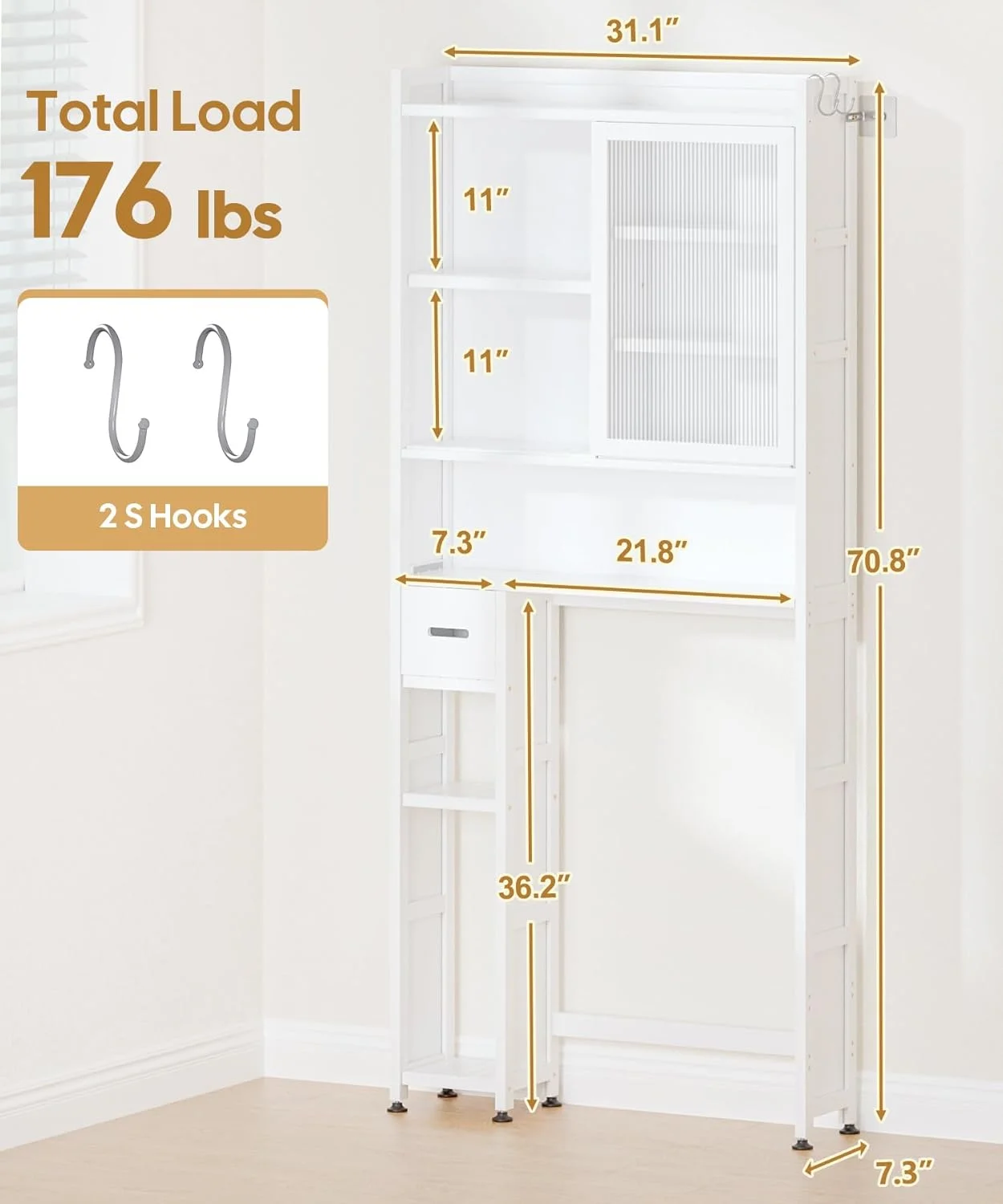 Bathroom Organizer Size: This over-the-toilet bathroom storage cabinet effectively utilizes the unused vertical space above the toilet. It provides convenient storage space without taking up too much bathroom space. The size is 70.8" x 31.1" x 7.28", suitable for most toilet positions in the bathroom - Transparent Sliding Door: The transparent sliding door of the toilet cabinet allows us to see the stored items inside at a glance, making it convenient and quick to find the needed supplies. It also provides good sealing effects to prevent dust and moisture from entering the cabinet interior