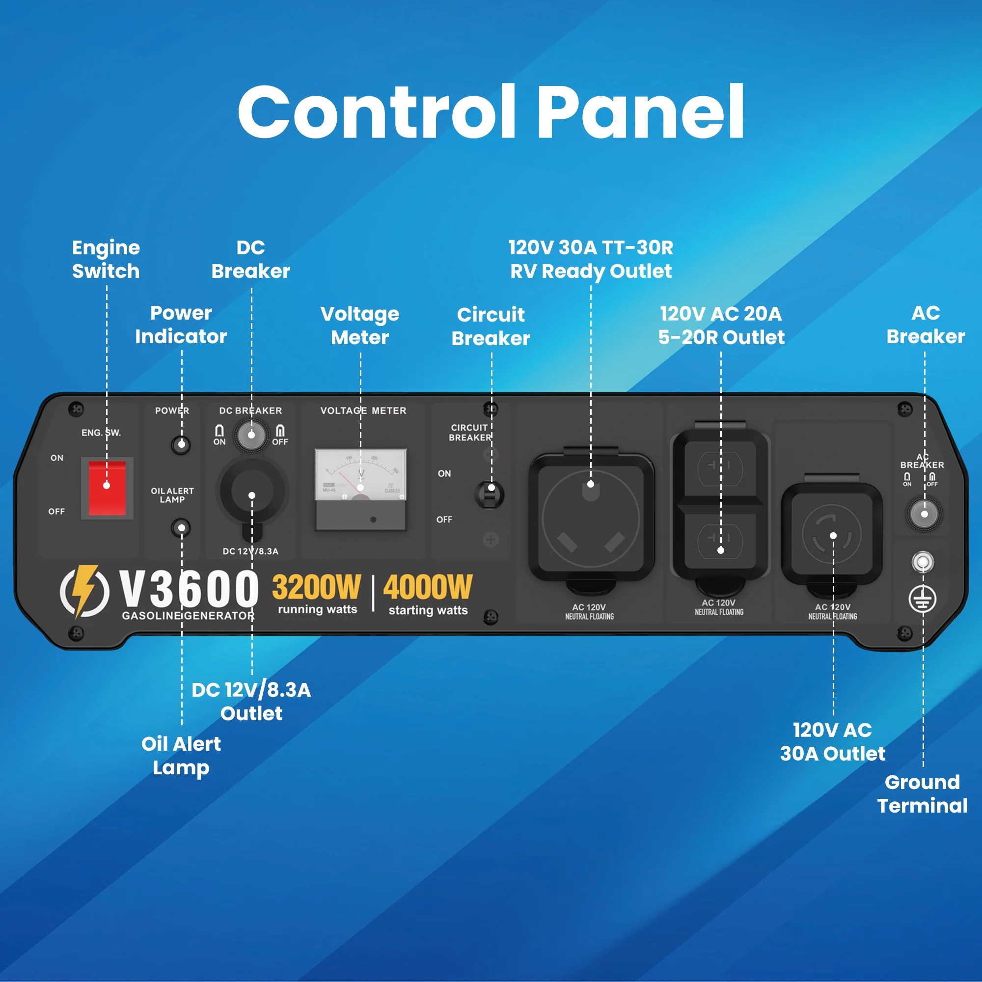 - ��Multiple Output Ports & RV Ready Socket��Equipped with multiple output ports including a 20A/5-20R US-standard duplex outlet, a 30A/L5-30R locking outlet, and a 30A TT-30R RV Ready Socket. Features AVR (Automatic Voltage Regulation), circuit breaker protection, and low-oil warning light. This generator's versatile connectivity ensures safe and stable power distribution for multiple devices working simultaneously with the engine, eliminating concerns about multi-device operation.