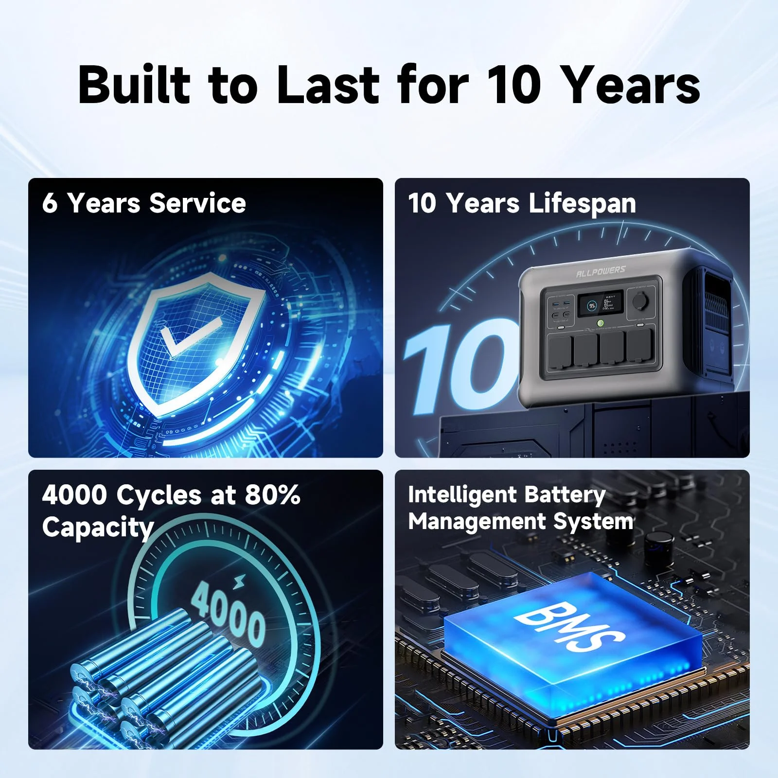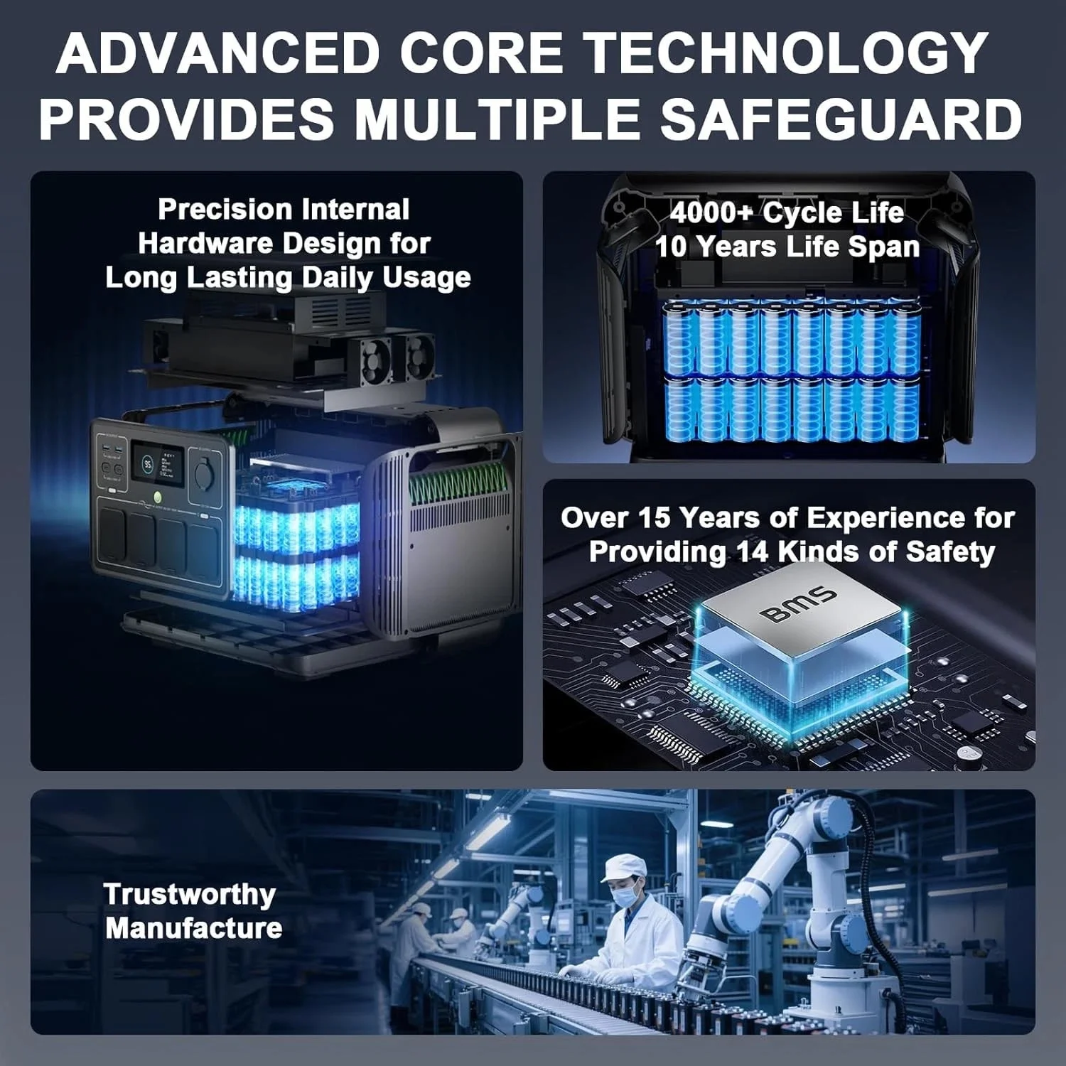 Invest with confidence, backed by our robust 5-year warranty (including free replacement within 90 days). Built with a premium LiFePO4 battery, it delivers 4000+ cycles and a decade of reliable service��outlasting most traditional power stations. This is the durable, set-and-forget power solution American families trust.