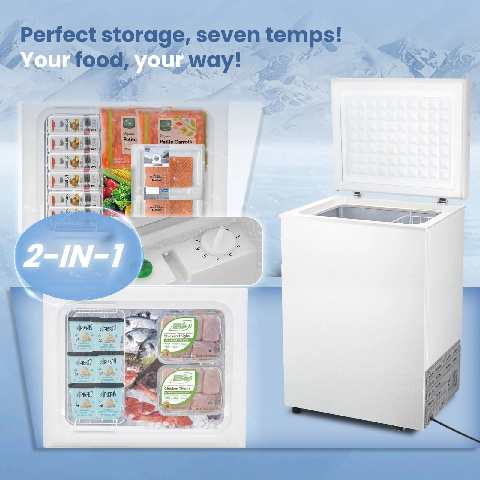 - ��??7-Stage Adjustable Thermostat�� The compact freezer is designed with 7 temperatures that allows you to freeze as many items as you need, ranging from -7.6��F to 6.8��F. Keep your items at the ideal temperature for optimal freshness. A "0" on the thermostat dial indicates that refrigeration has stopped.
