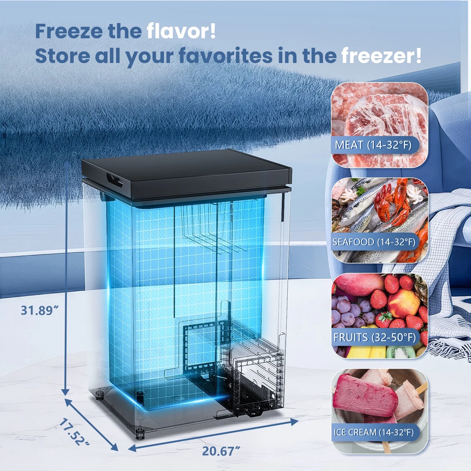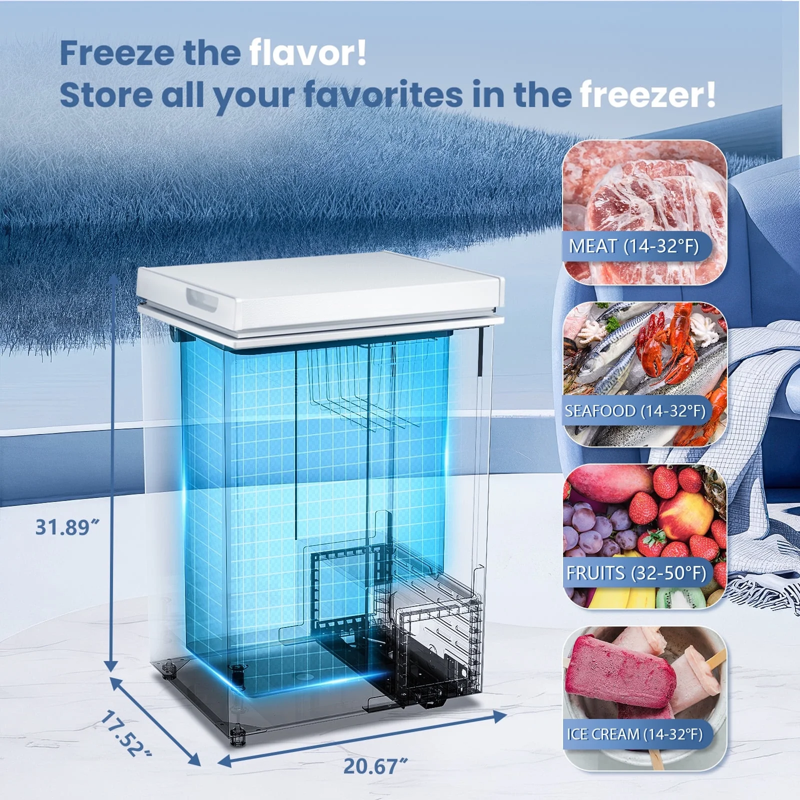 - ��??Compact Chest Freezer Dimensions�� KNDKO 2.8Cu.Ft chest freezer provides plenty of space for storing a variety of frozen items such as pizza, seafood, meat and more so you can buy in bulk, reduce food waste and save money, and comes with a removable basket to keep small items in the basket for easy access. The freezer measures 20.67"(W)*17.52"(D)*31.89"(H) and is perfect for home, dorm, kitchen and office use.