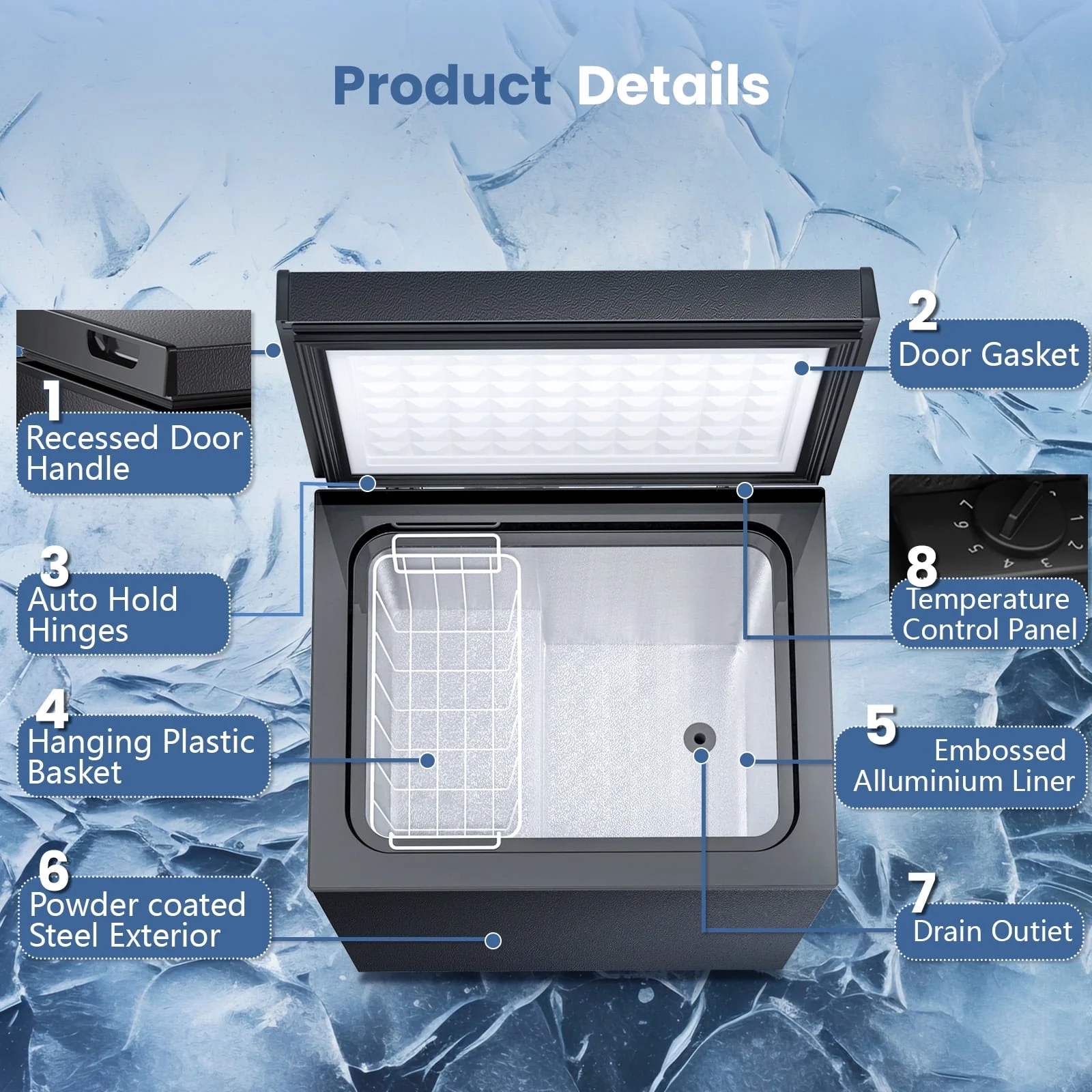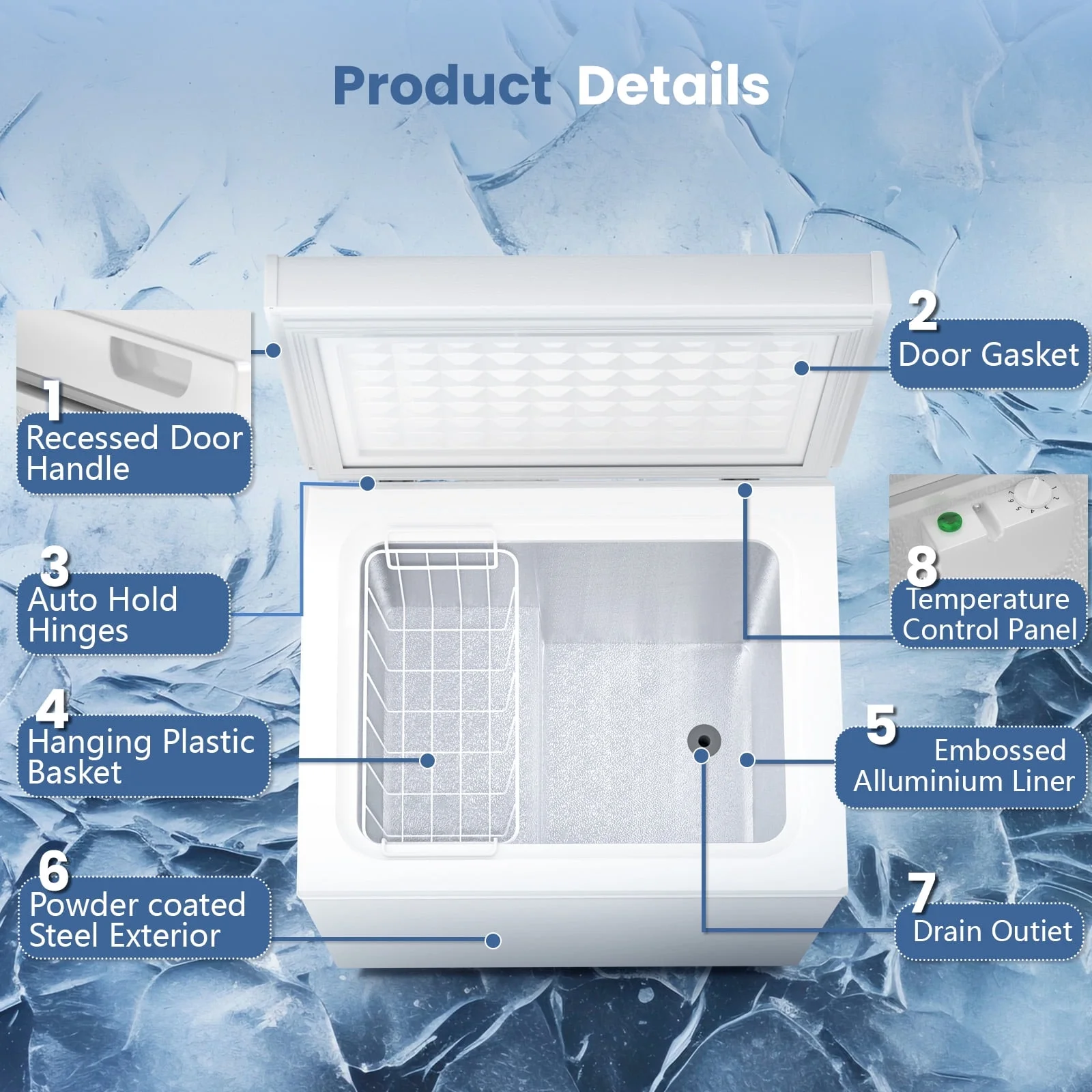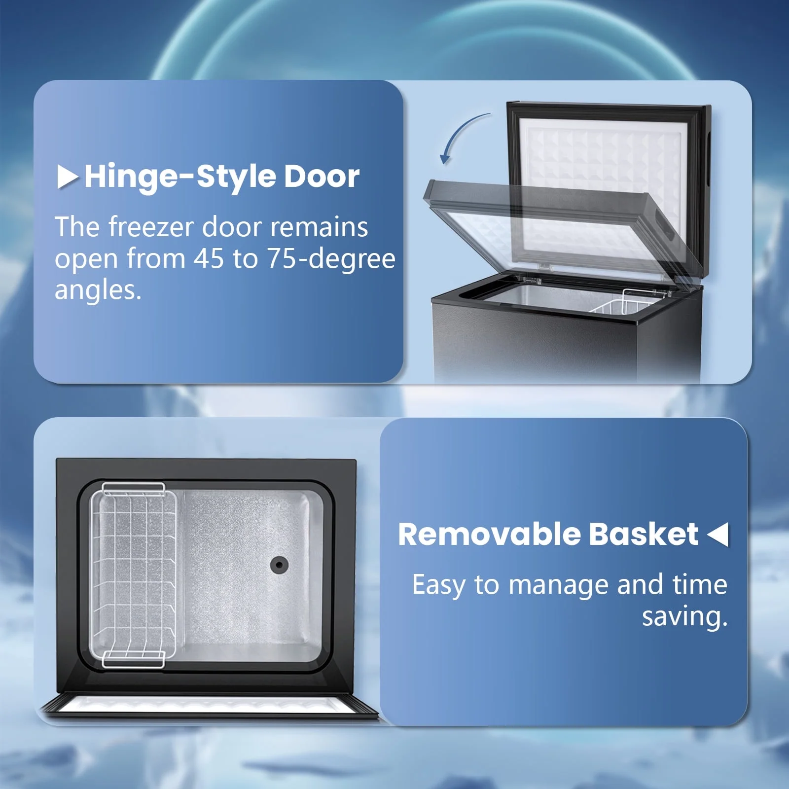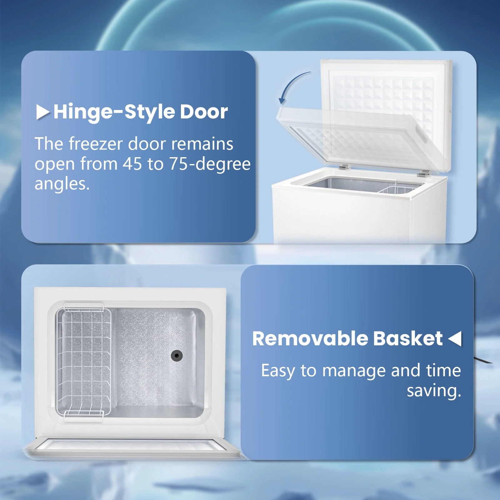 - ��??Balanced Hinged Freezer Door�� The balanced hinged doors of the chest freezers maintain a hover angle of 45 to 85 degrees, making loading and unloading items effortless. The metal hinges on the door are durable and prevent the risk of the door falling off, while enjoying noiseless operation. High-quality hinges, high-density foam layers and insulated door seals provide better insulation and effectively extend freezing time.
