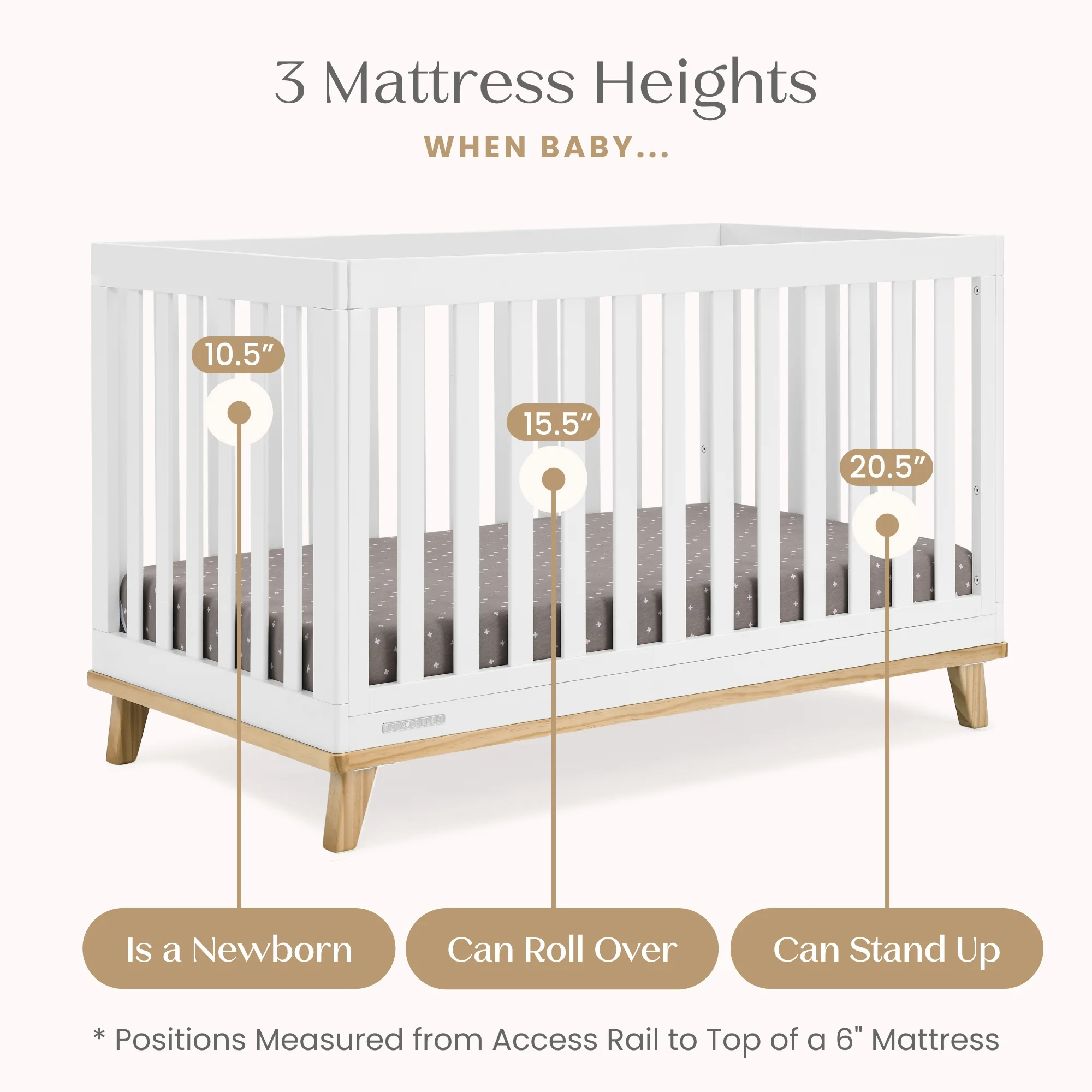 - ADJUSTABLE HEIGHT: Adjustable height mattress support with 3 convenient positions to grow with your baby | ACCESS RAIL DIMENSIONS: From Floor: 33.75"H; From Top Mattress Support Position: 16.50"H; From Bottom Mattress Support Position: 26.50"H