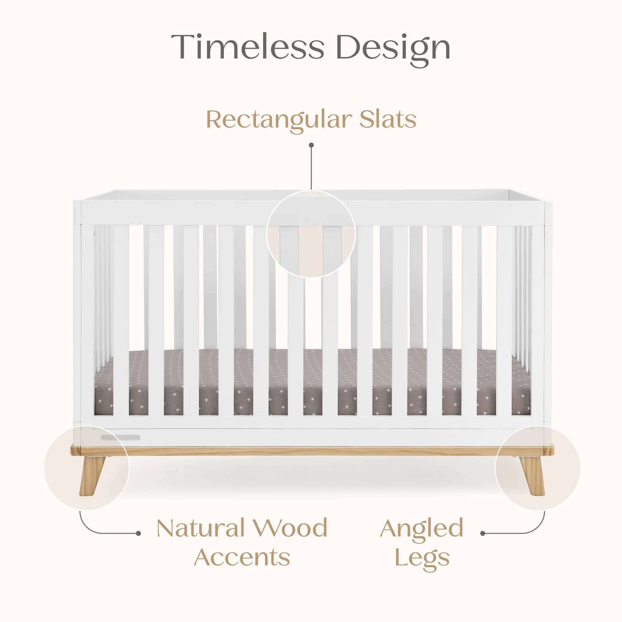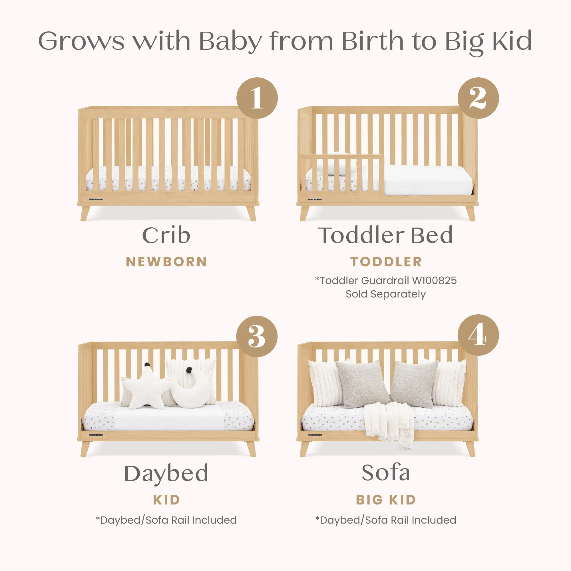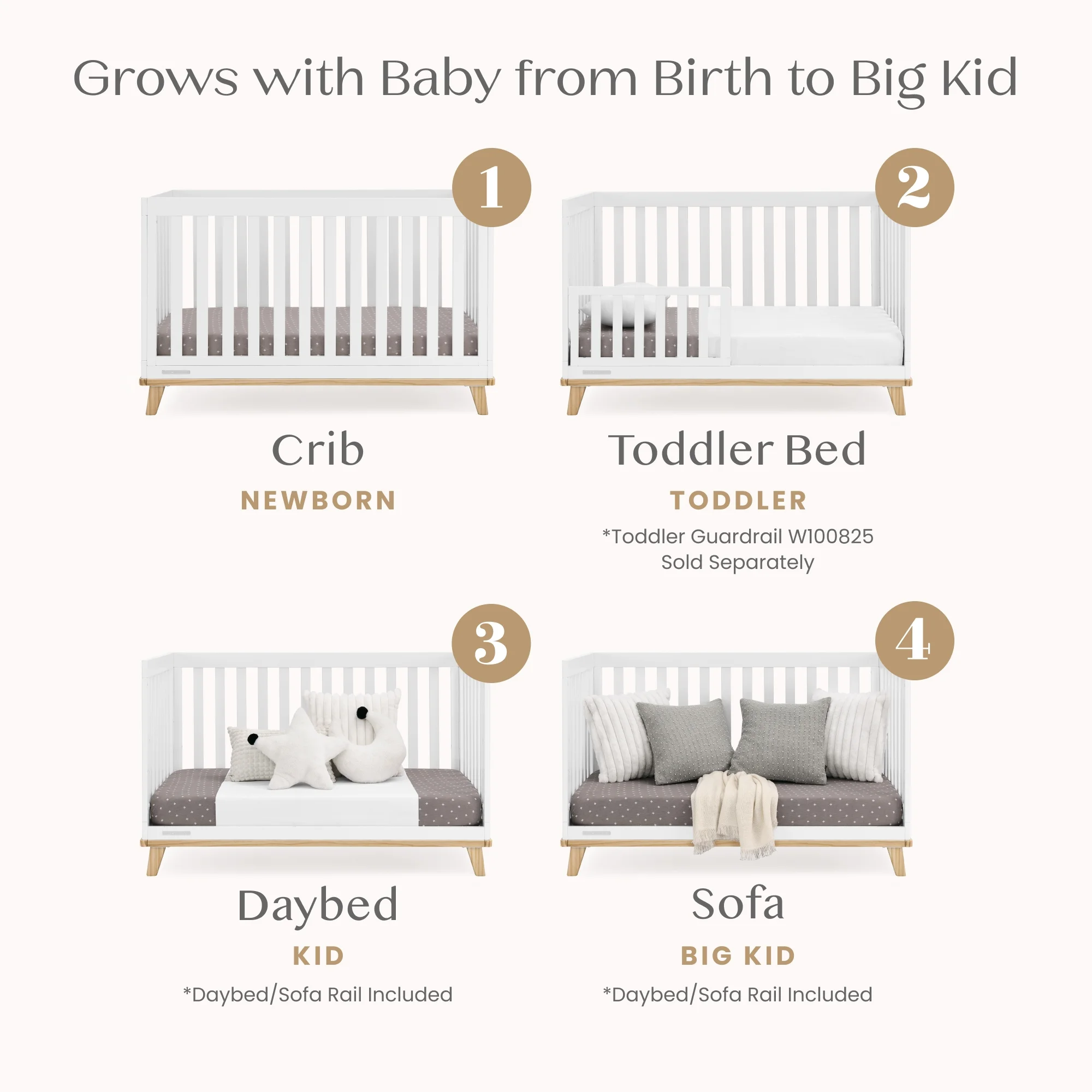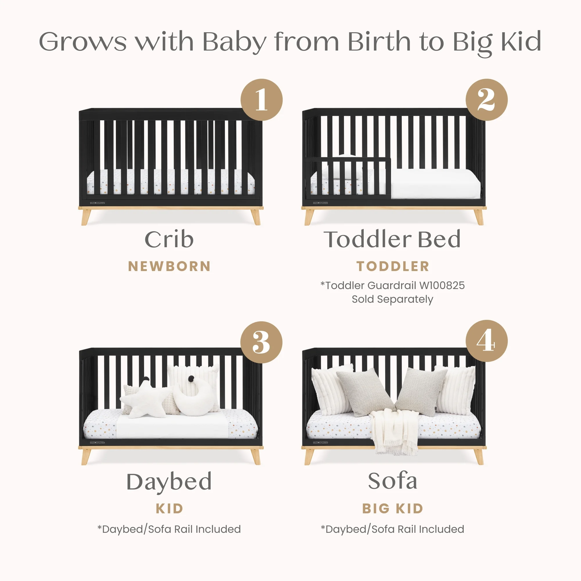 - 4-IN-1 CONVERTIBLE CRIB: Crib converts to a toddler bed, daybed and sofa (Daybed/Sofa Rail Included - Toddler Guardrail #W100825 sold separately) | Available in Bianca White with Natural, Natural and Black with Natural