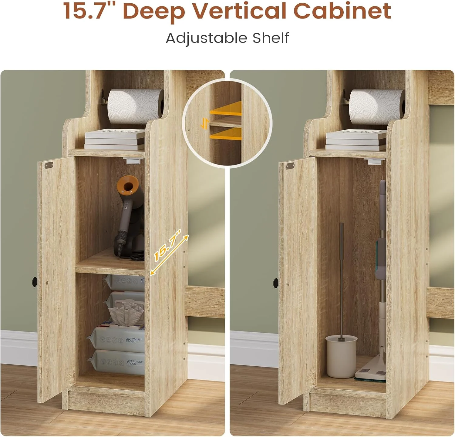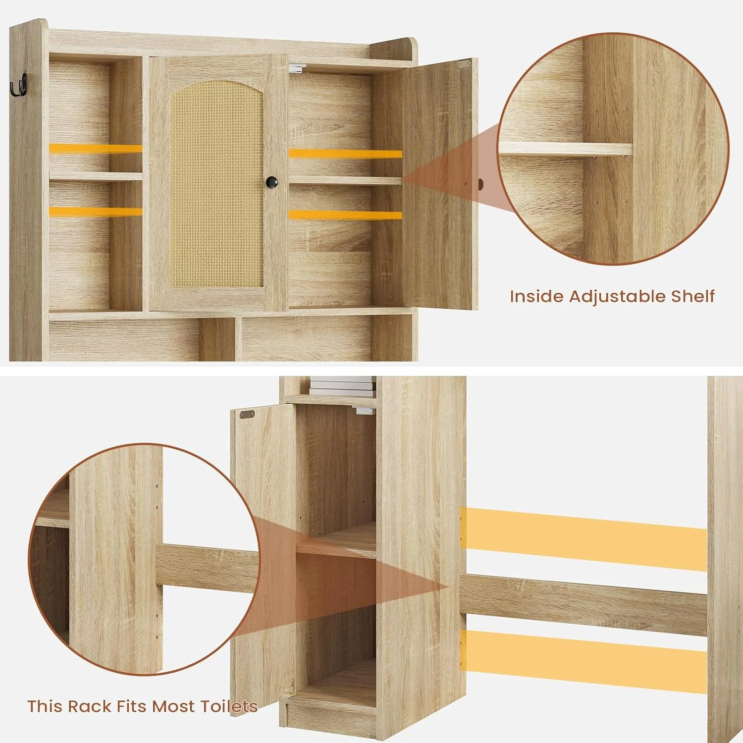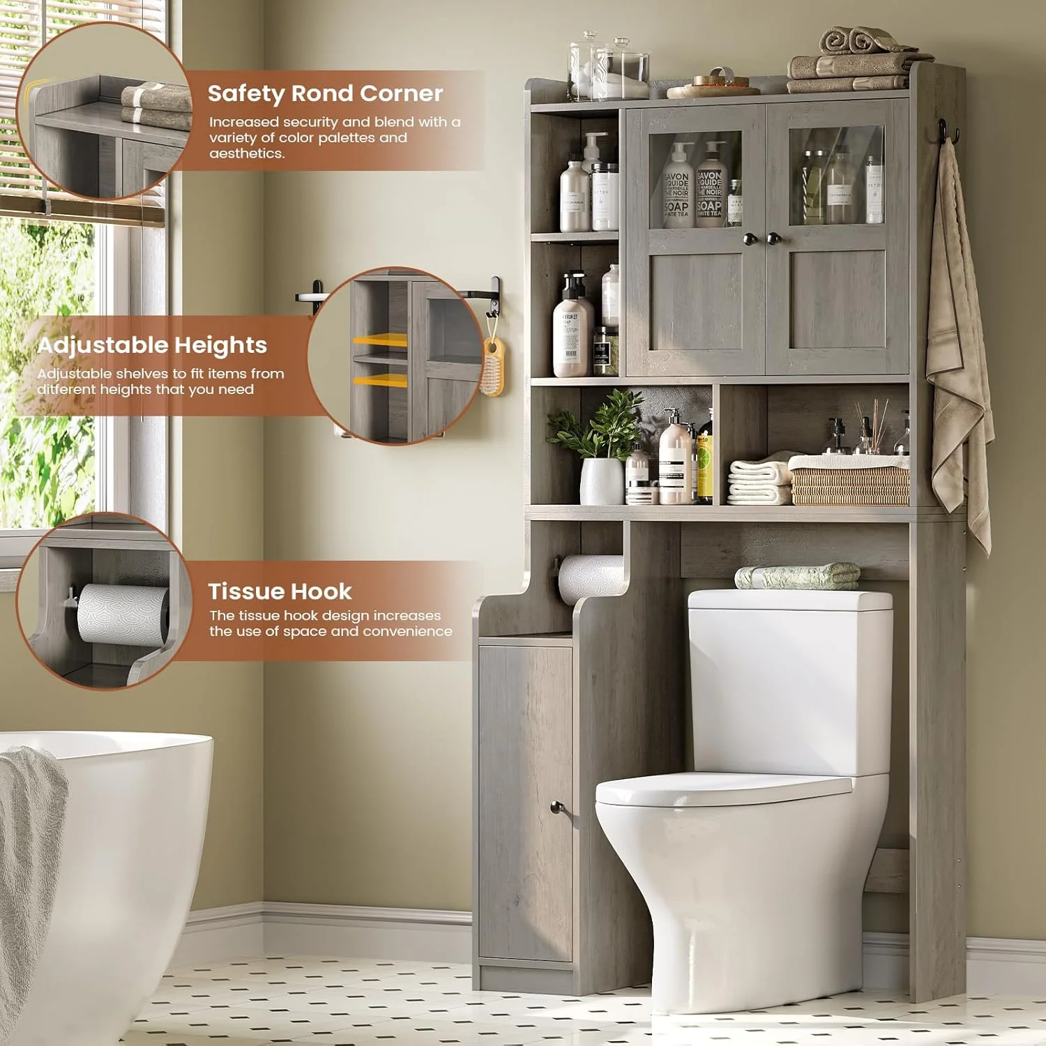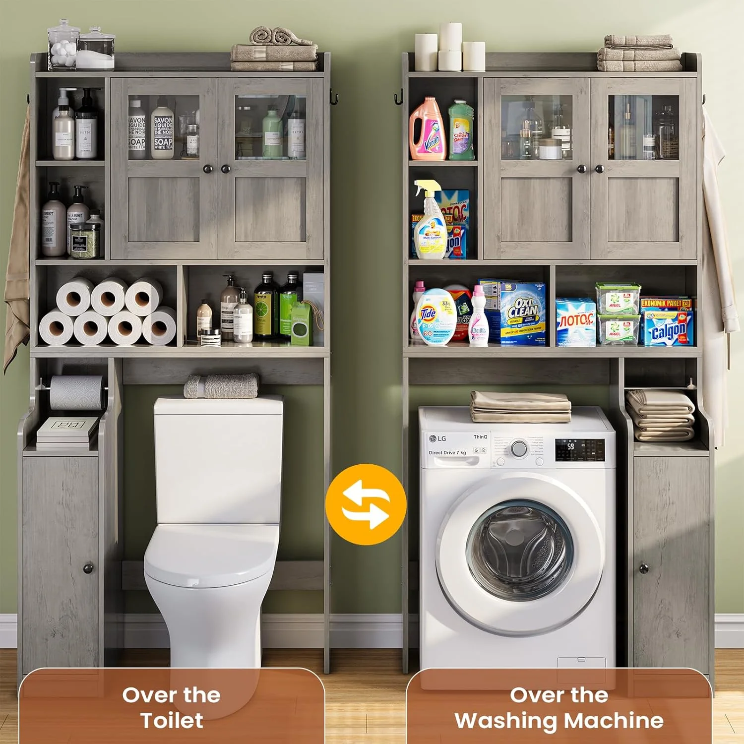 Over the Toilet Storage Cabinet with 3 Doors, Farmhouse Space Saver for Bathroom Organizer with Paper Holder, 10 Shelves and Hooks, 7 - Tier Over Washing Machine Cabinet for Laundry, Bathroom, Natural